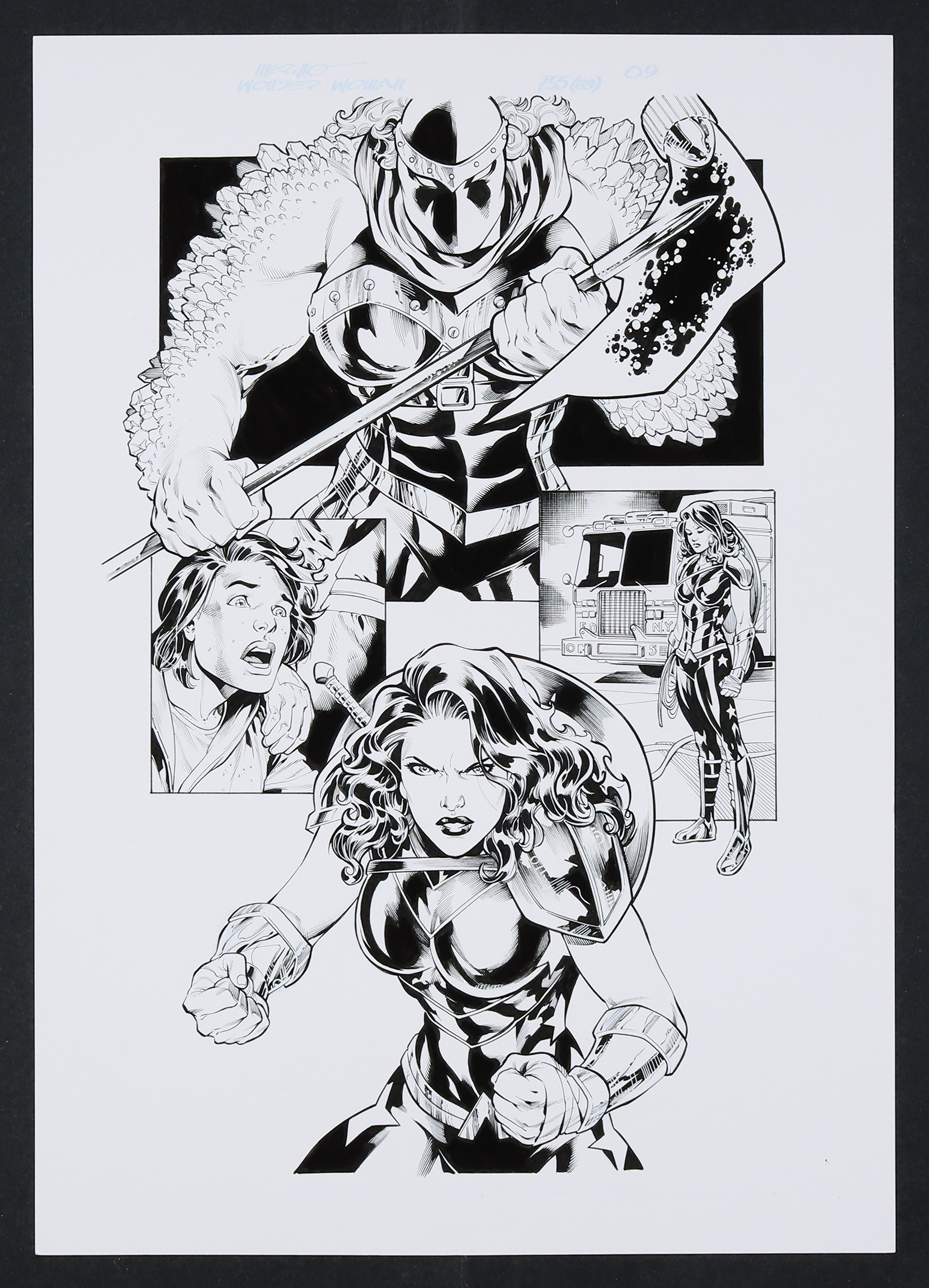 Hard to ask for a better Donna Troy page than this! Boldly illustrated and beautifully laid-out, this dramatic standoff page perfectly captures this moment as Donna realizes the time for talking is over and readies herself for battle. Ink over printed pencils on art board. 11 3/4" x 16 1/2".