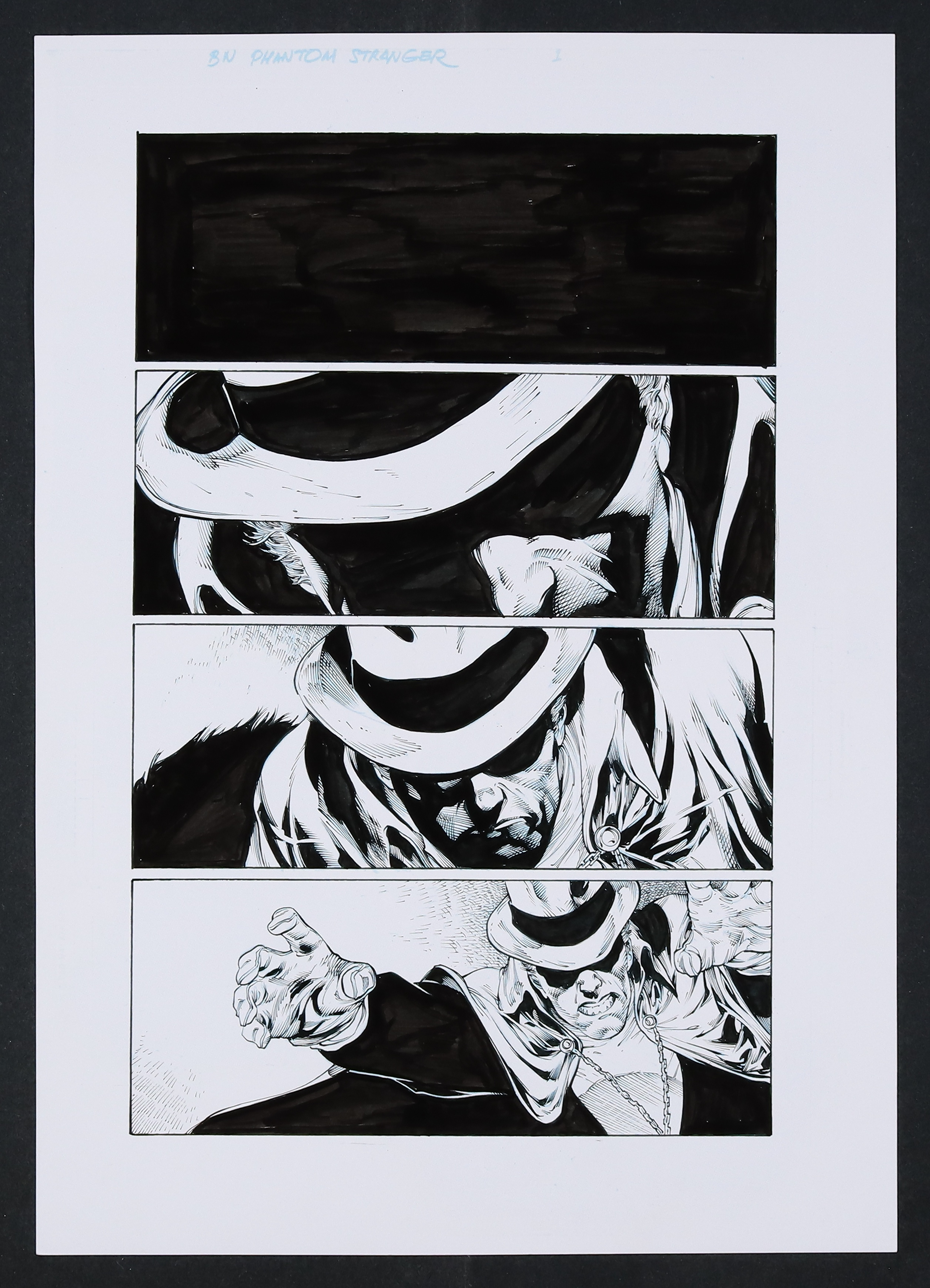 From the Darkness of the Blackest Night emerges the Phantom Stranger! During DC's dead-raising event, many of DC's deceased (or, like the Stranger, otherwise occupied) heroes returned to their series with legacy-numbered one-shots to join the fight. This is a perfect first page for a Phantom Stranger story with a slow, dramatic zoom out from pitch black to the iconic visage of the Stranger, still partially in shadow. Ink over printed pencils on art board. 11 3/4" x 16 1/2".