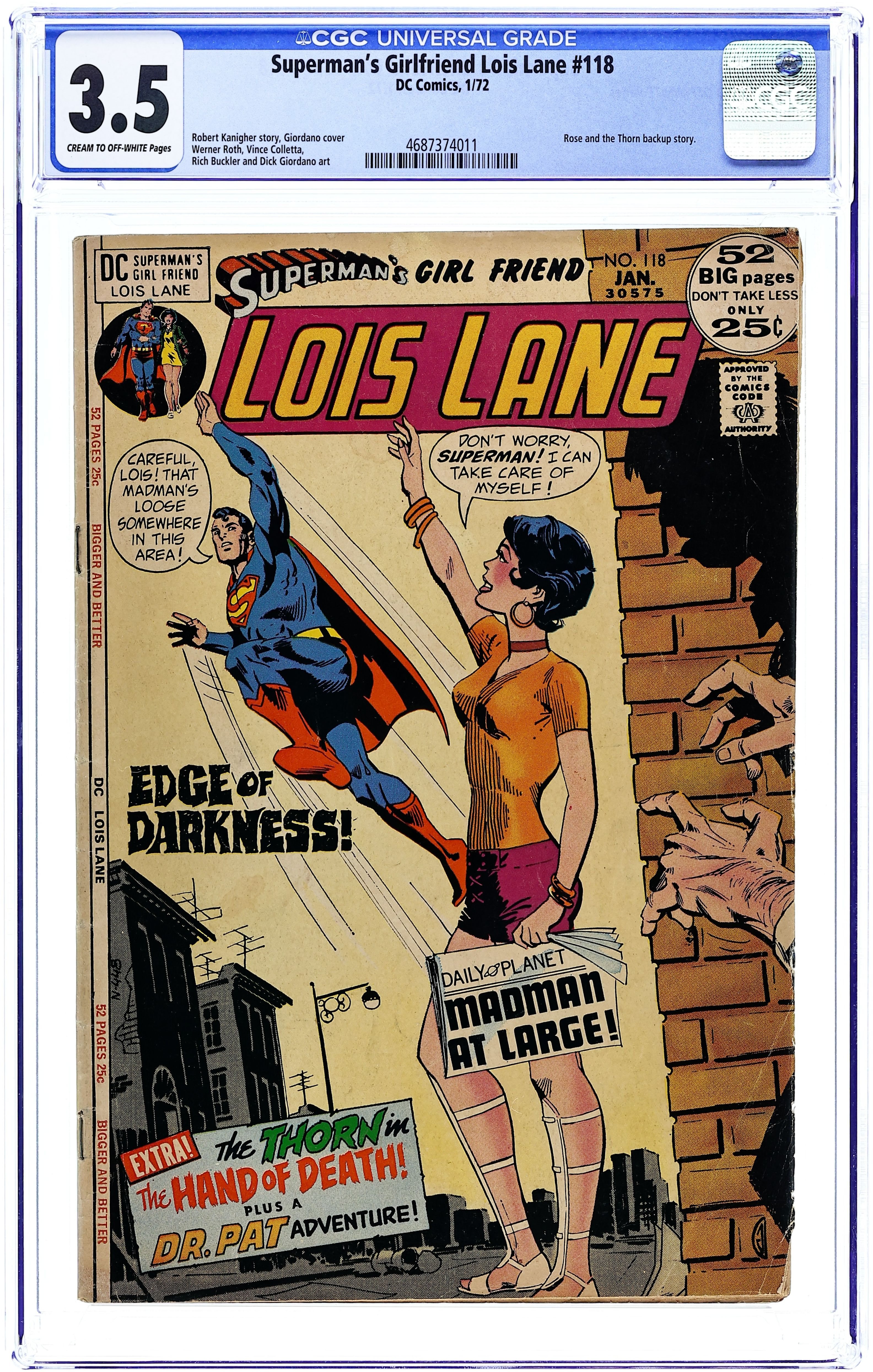 Starts May 4 Cover art by Dick Giordano. Edge of Darkness!, script by Robert Kanigher, pencils by Werner Roth, inks by Vince Colletta and Murphy Anderson (Superman heads only); The original Morgan Edge escapes from the cell where he was imprisoned by his Evil Factory clone, and the clone tricks Superman into searching for the original without revealing that there are two Edges. Dr. Pat's First Love!, pencils by Carmine Infantino, inks by Frank Giacoia; Dr. Pat Windsor travels into the backcountry to help Dr. Michaels with his hospital. Hand of Death!, script by Robert Kanigher, pencils by Rich Buckler, inks by Dick Giordano; Thorn battles an Inter-Gang crew who are posing as ghost sailors on a ghost ship to smuggle items. 52 Pages, Full Color. Cover price $0.25.