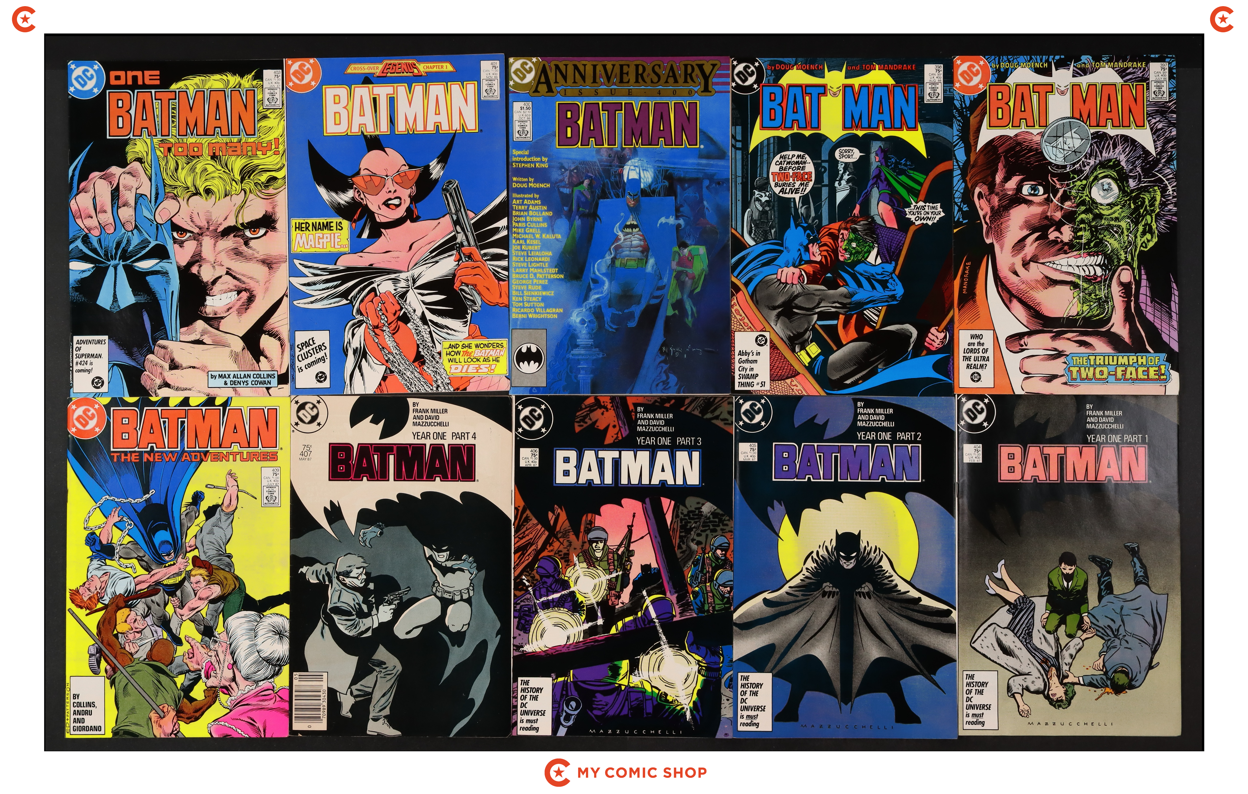 Issues 397, 398, 400, 401, 403-407, and 409 of Batman (1940). Most will grade in the VF to FN range.