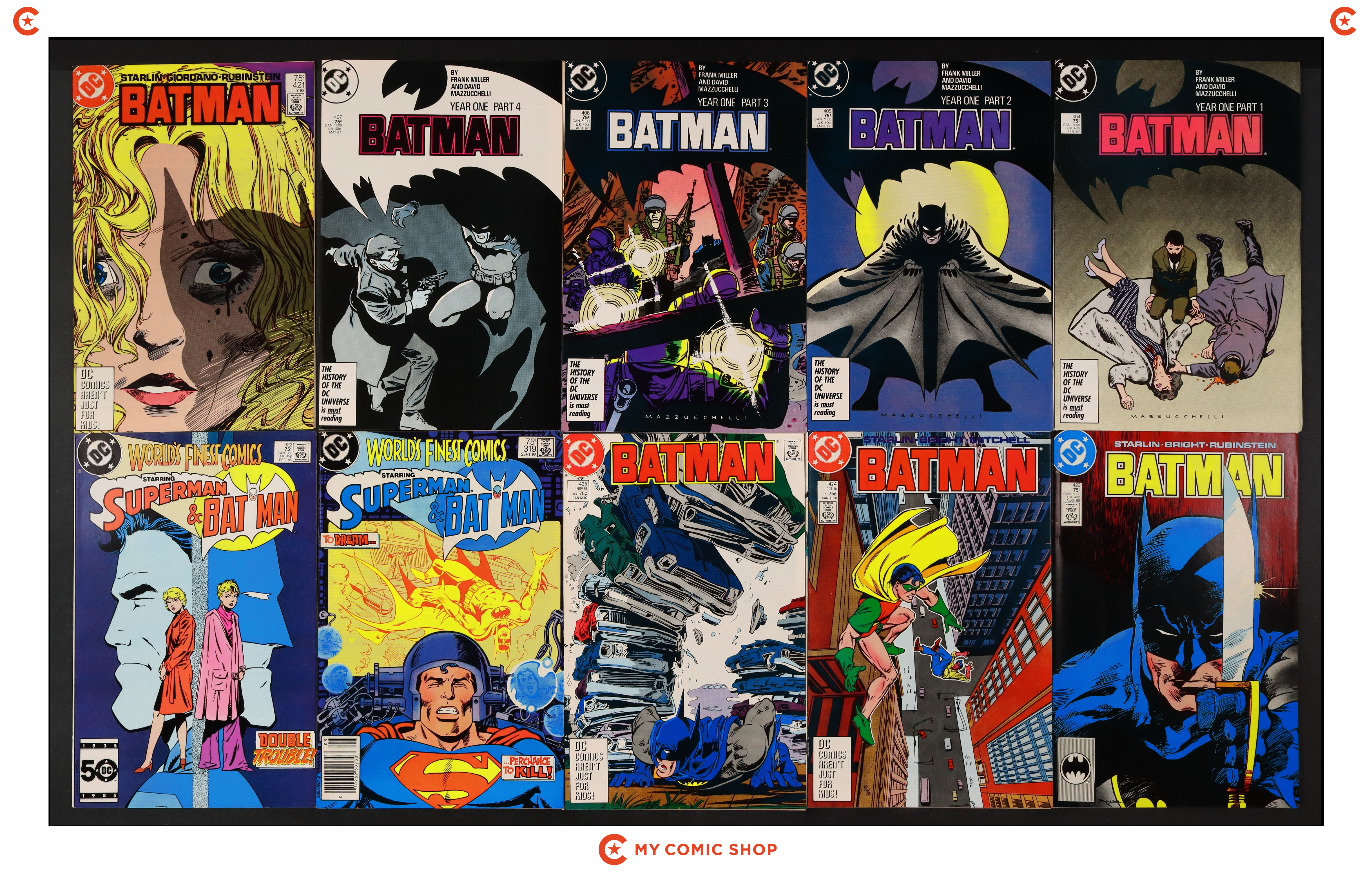 Issues 404-407, 421, 422, 424, and 425 of Batman (1940); and 319 and 322 of World's Finest (1941). Most will grade in the VF to FN+ range.