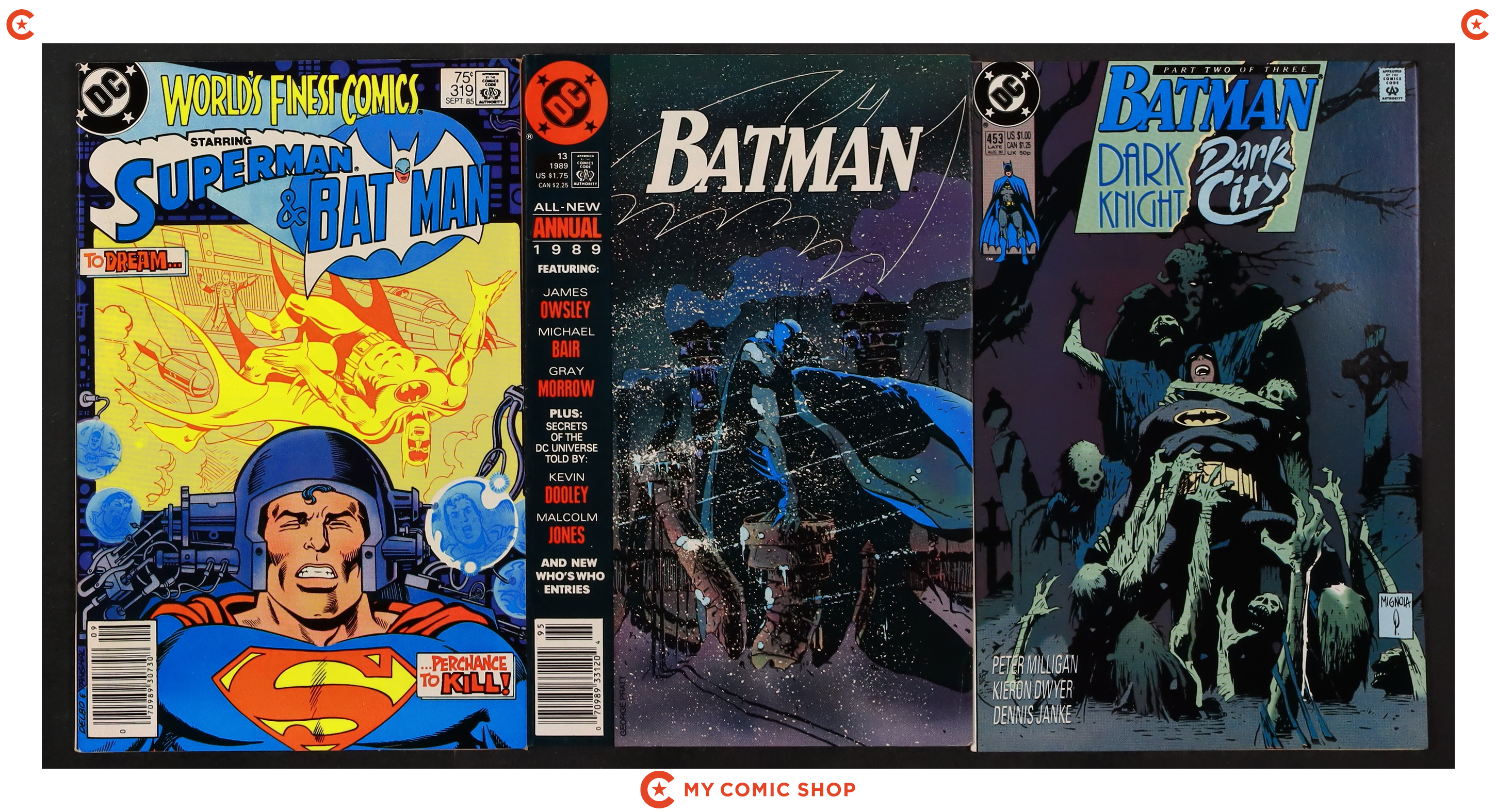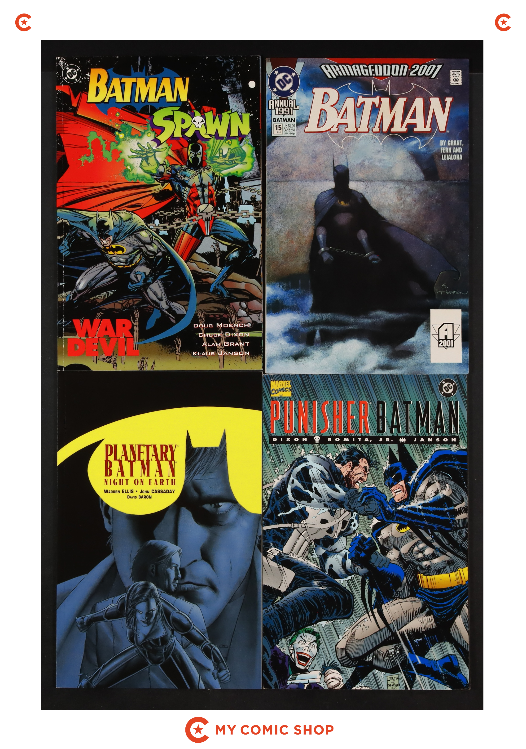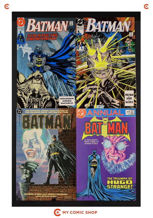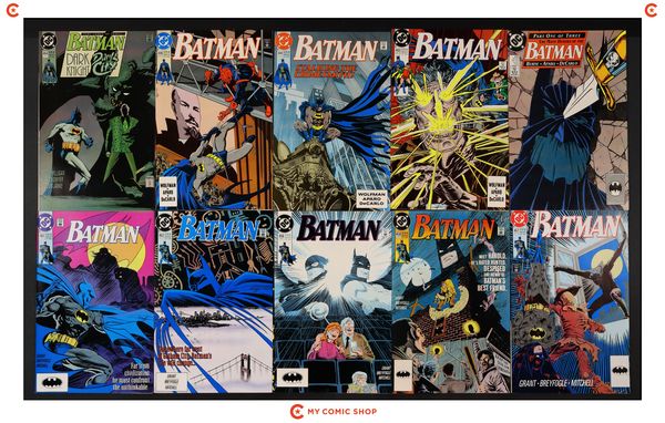 Issues 443, 444, 446, 457-459, 462-464, and 466 of Batman (1940); 15 of Batman (1940) Annual; 1 of Batman Spawn War Devil (1994); 1 of Punisher Batman Deadly Knights (1994); and 1 of Planetary Batman Night on Earth (2003). Most will grade in the VF range with a few grading FN.