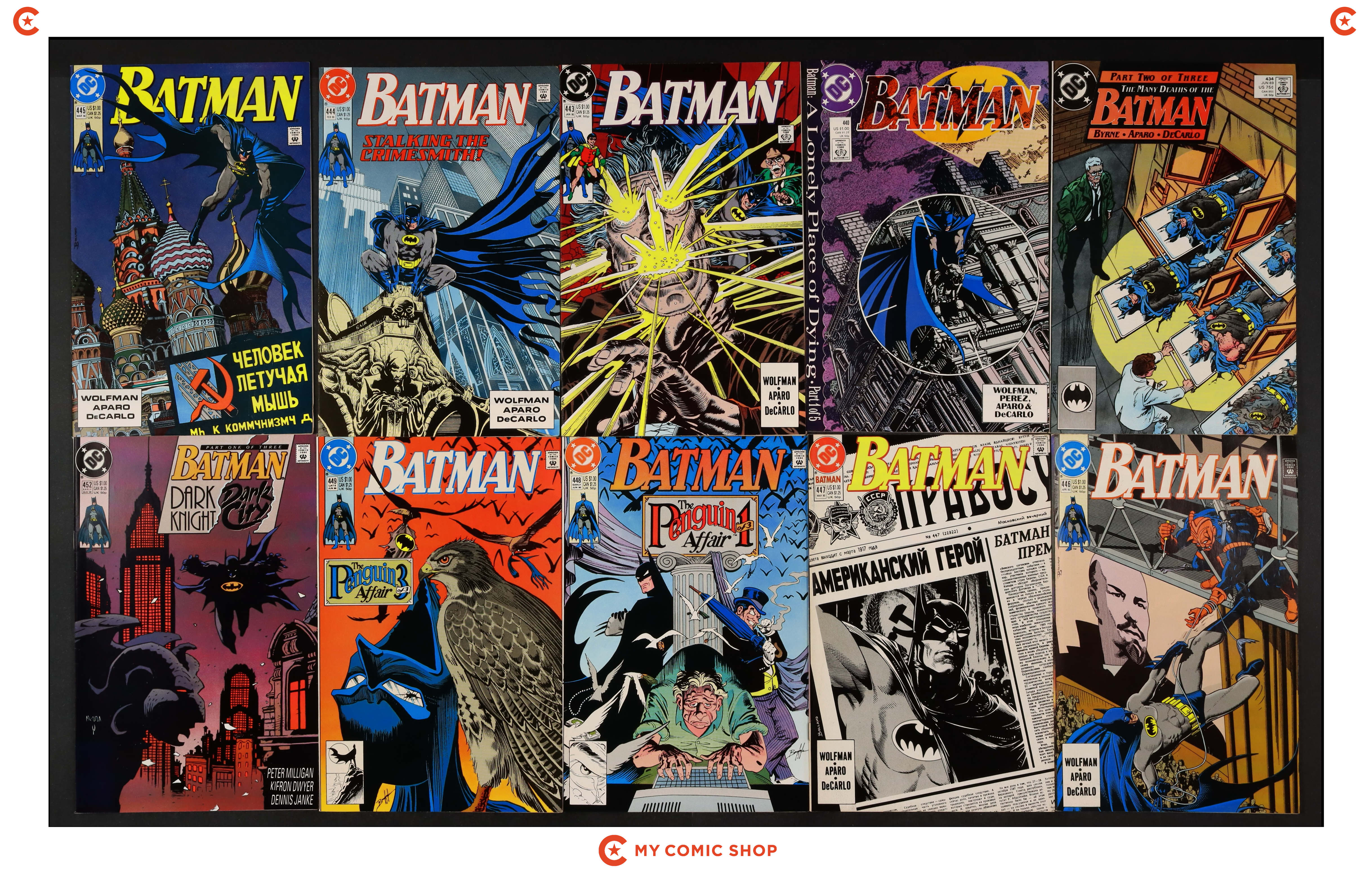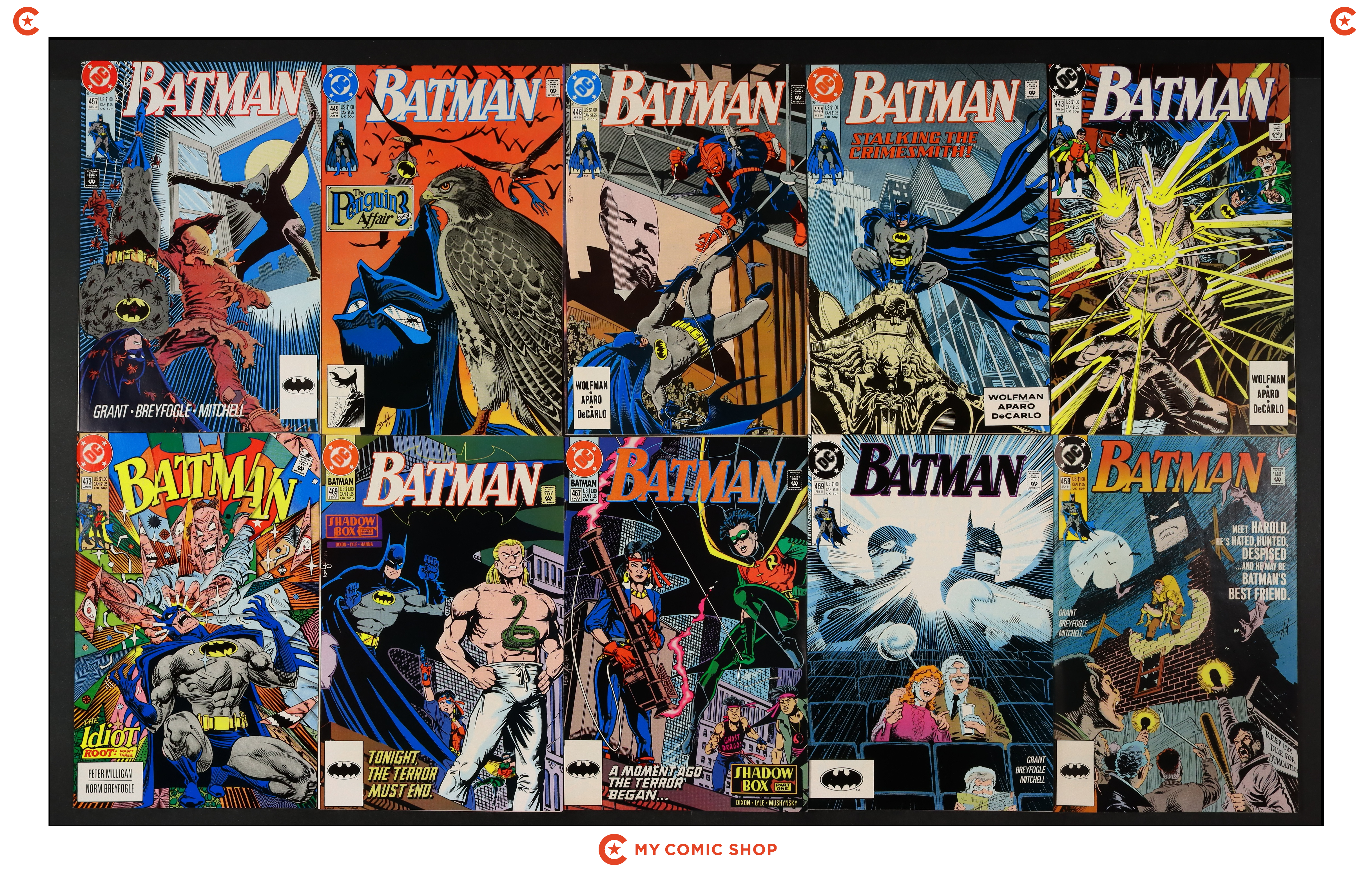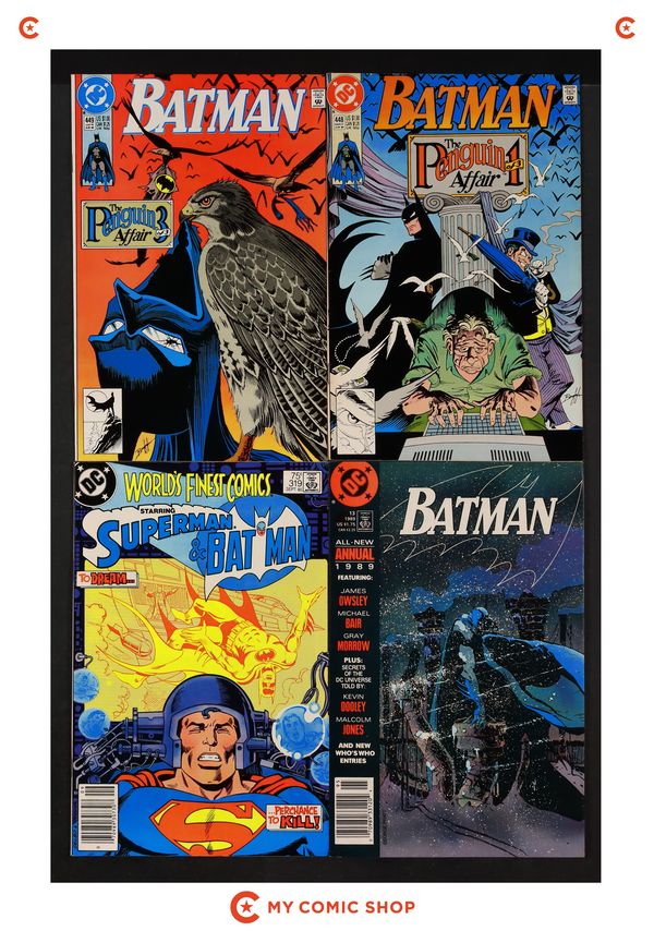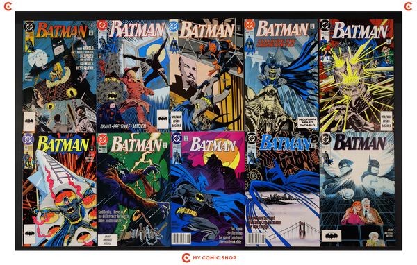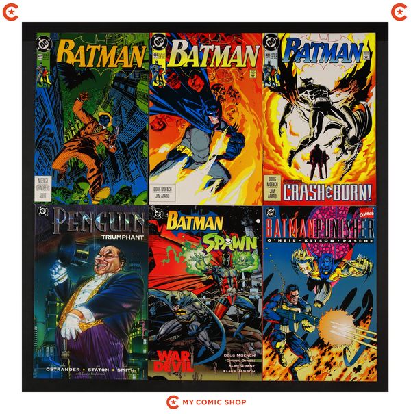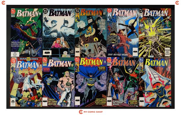 Issues 443, 446, 458, and 476-485 of Batman (1940); 1 of Batman Punisher (1994); 1 of Batman Spawn War Devil (1994); and 1 of Penguin Triumphant (1992). Most will grade in the VF range with a couple grading FN.