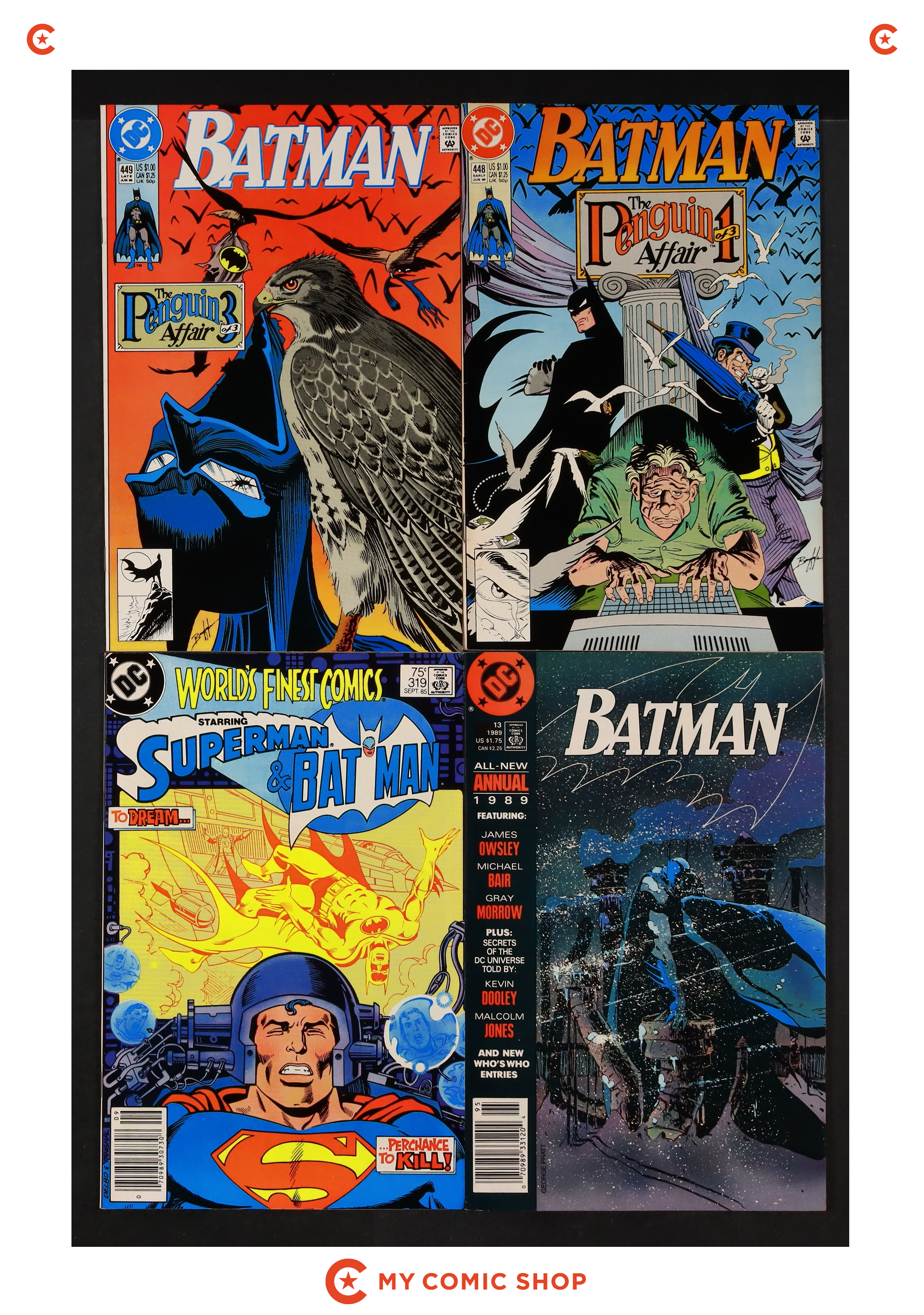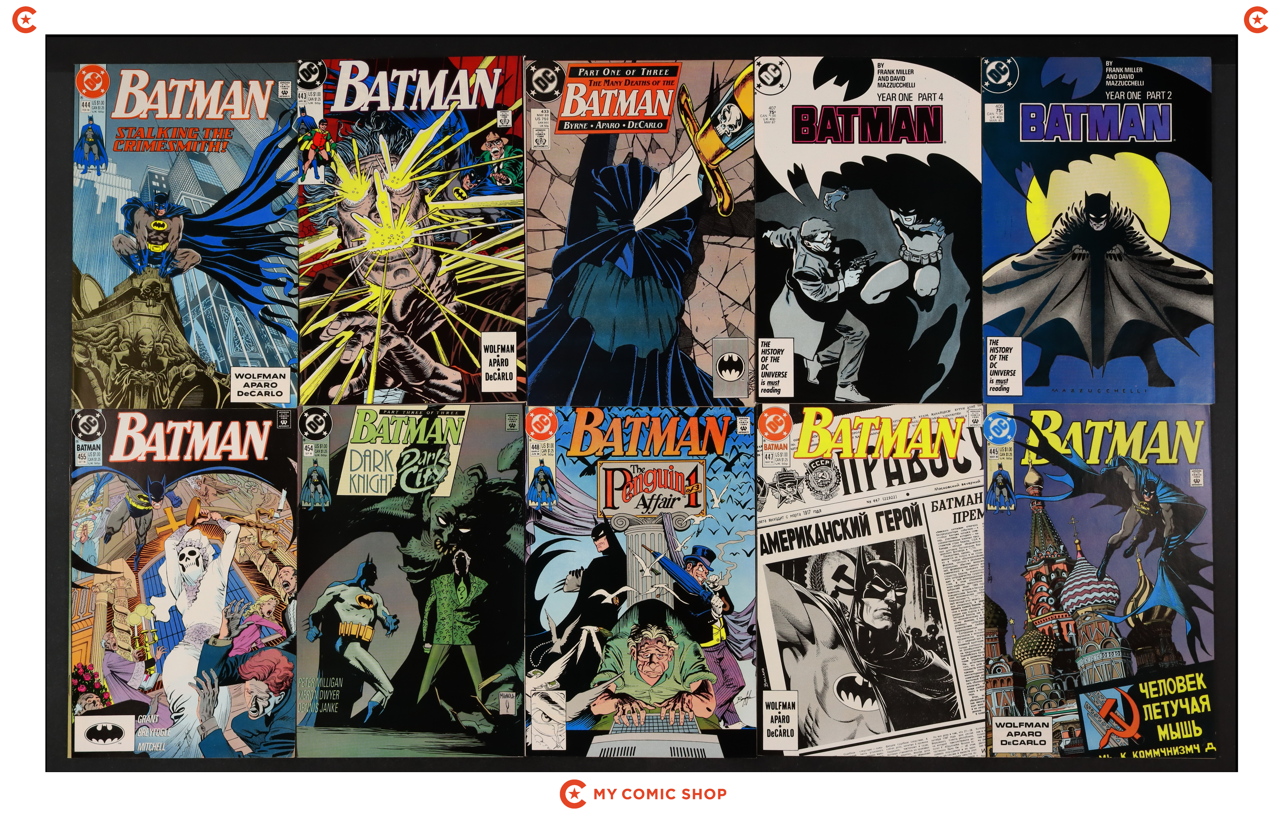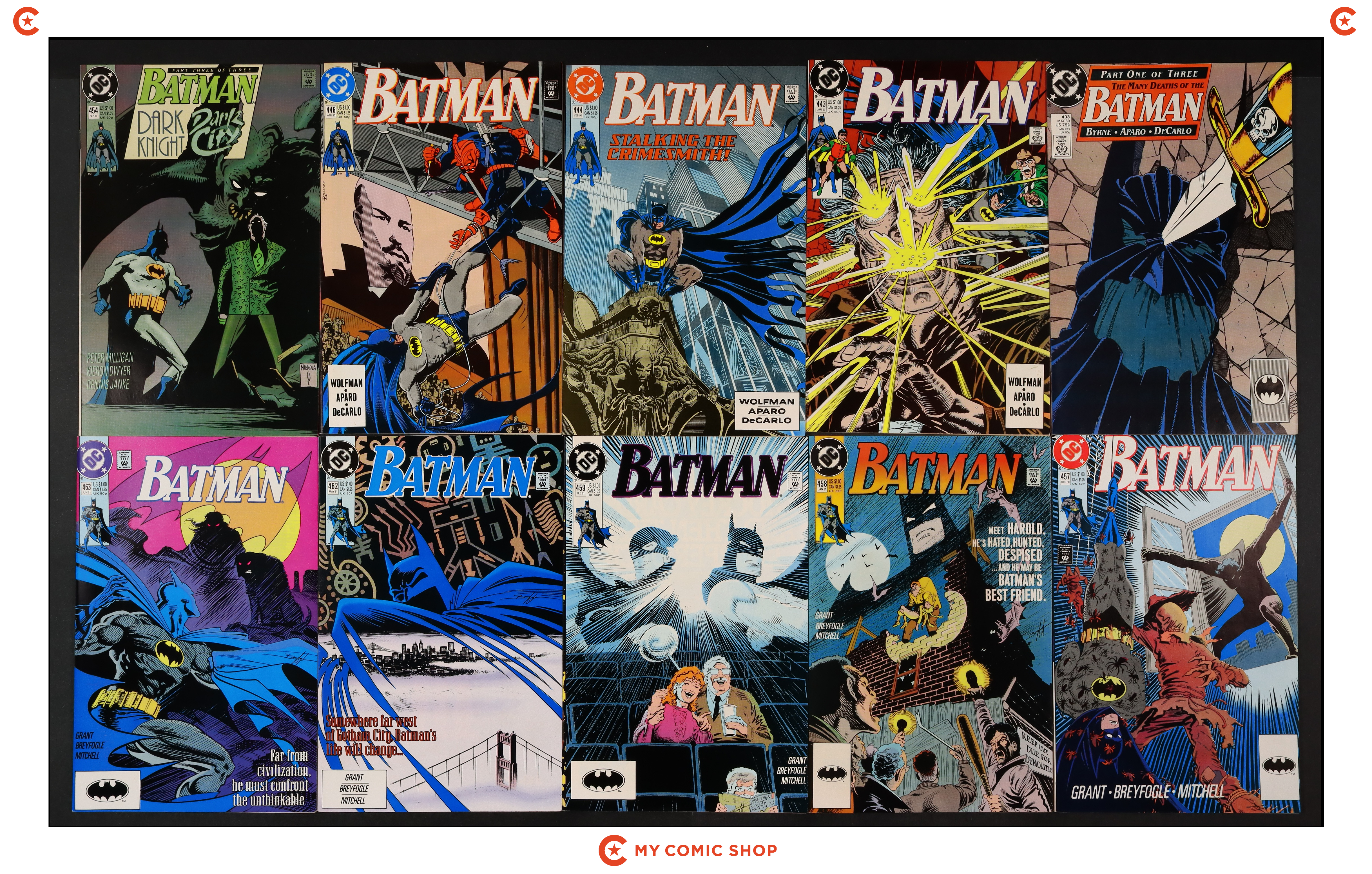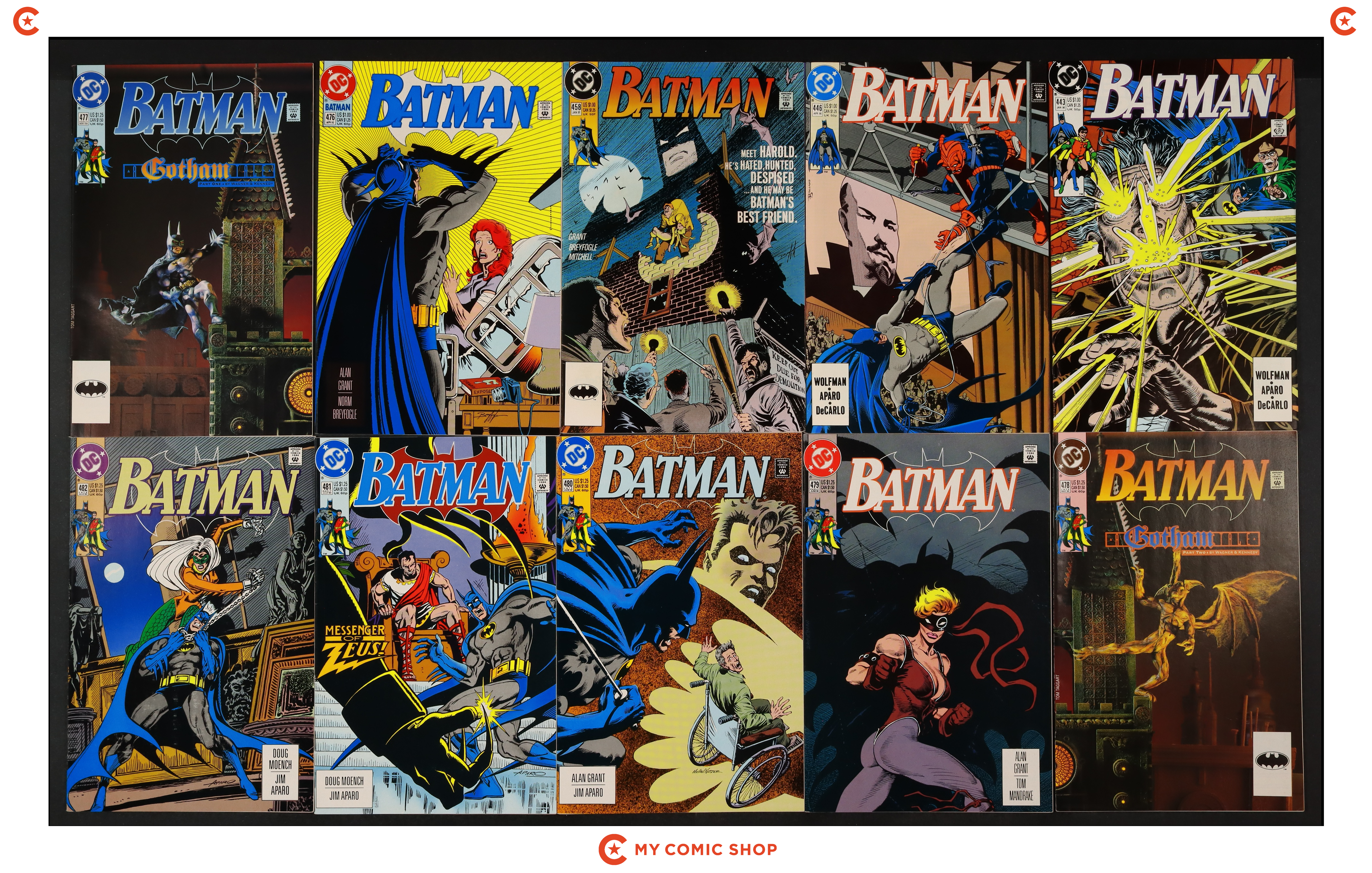 Issues 443, 446, 458, and 476-485 of Batman (1940); 1 of Batman Punisher (1994); 1 of Batman Spawn War Devil (1994); and 1 of Penguin Triumphant (1992). Most will grade in the VF range with a couple grading FN.