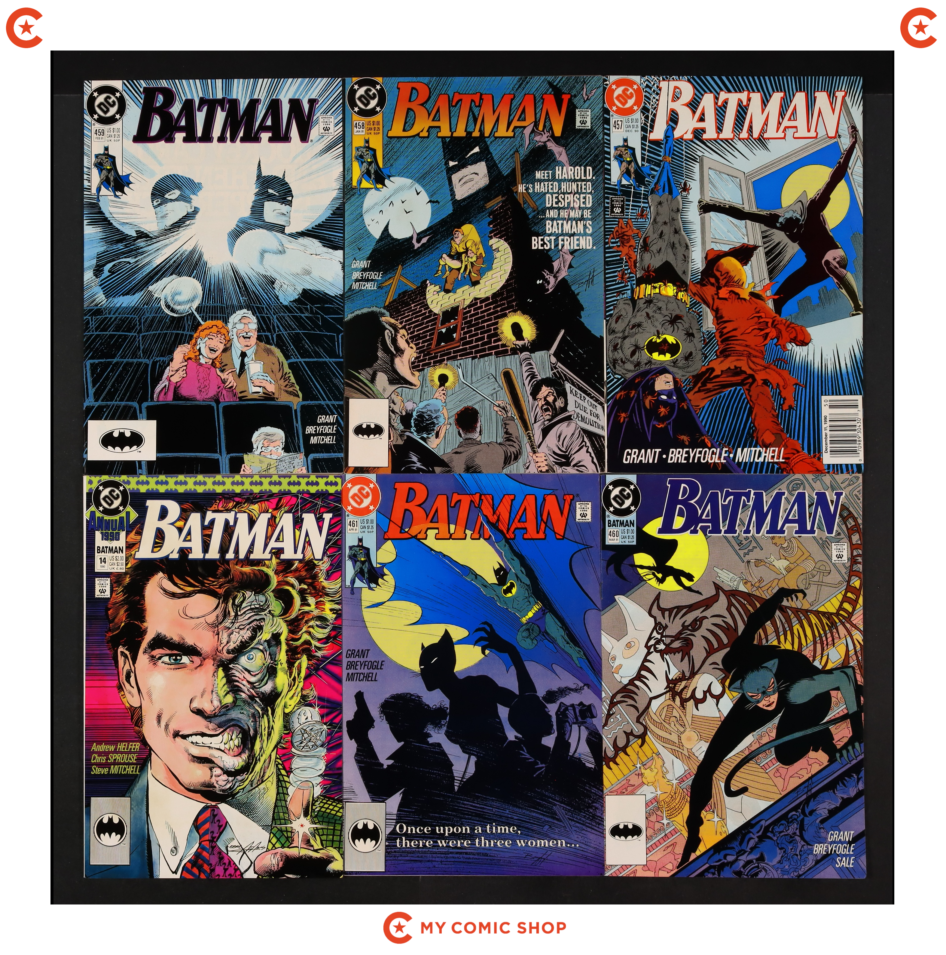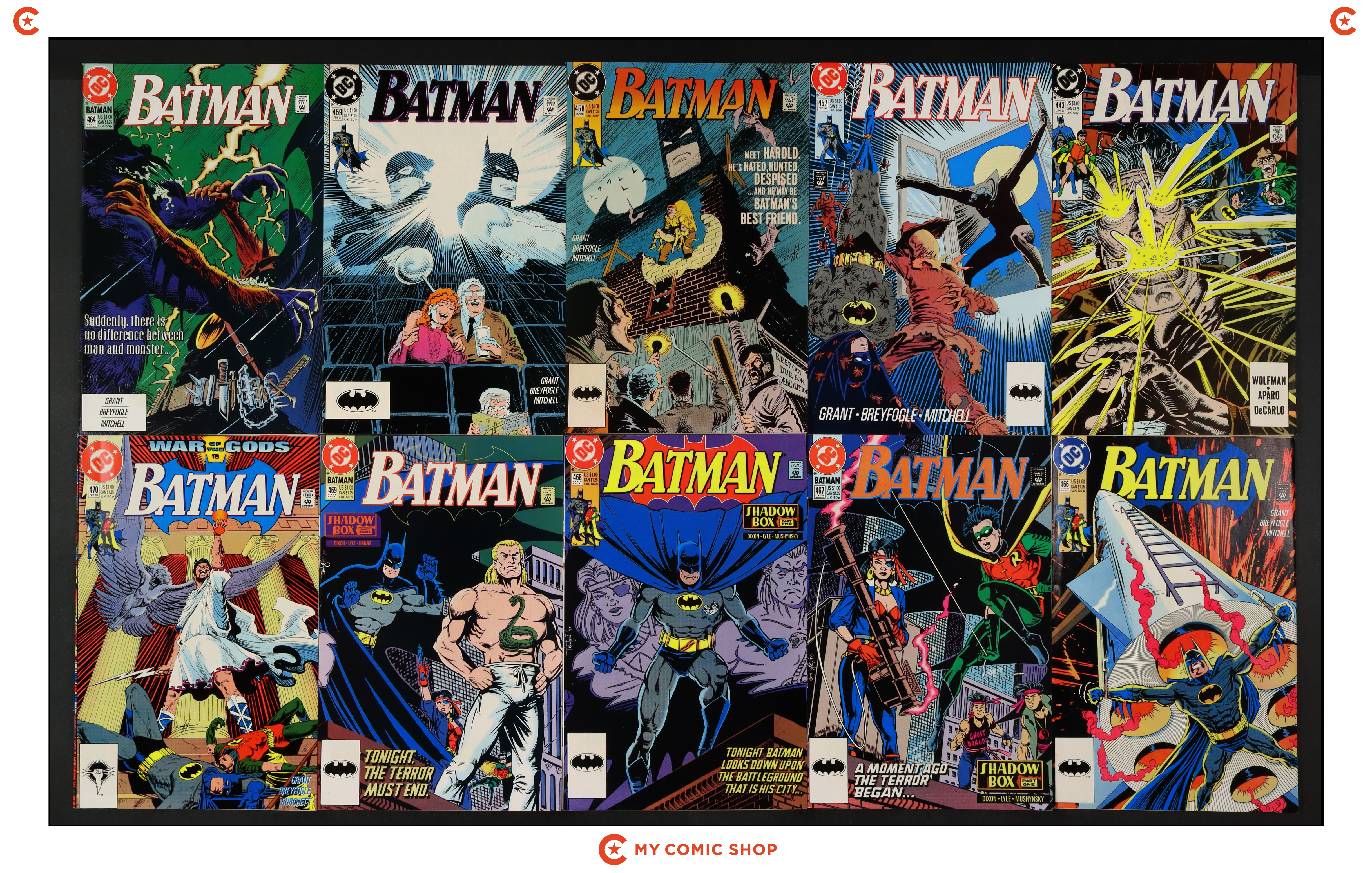 Issues 0, 458, 460, 461, 475, 476, 491 of Batman (1940). Most will grade in the FN to VF range.