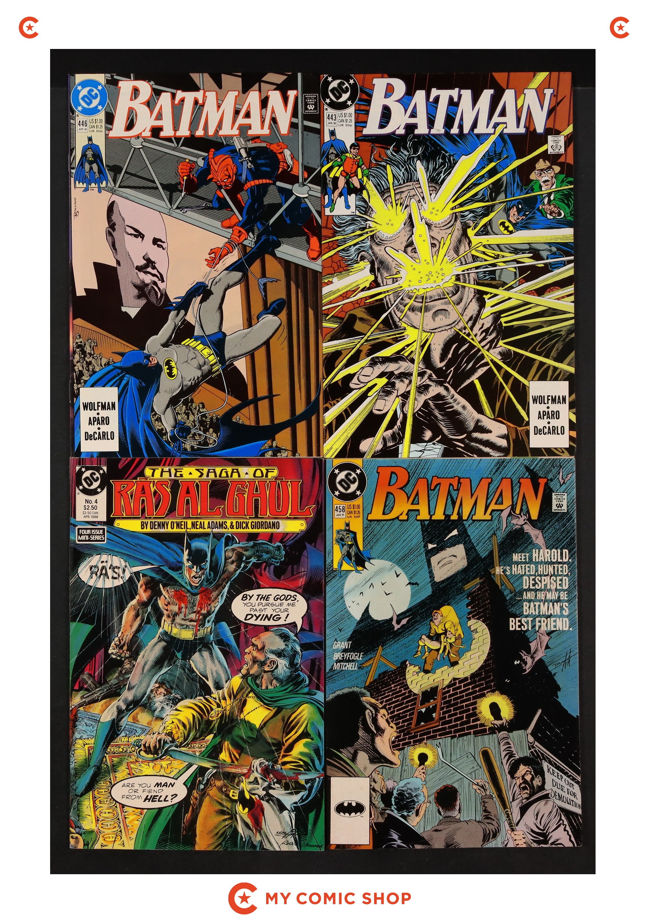 Issues 413, 415, 421, 424, 425, 433-435, 438, 440, 443, 446, and 458 of Batman (1940).; and 4 of Saga of Ra's Al Ghul (1988). Most will grade in the VF range with a couple grading closer to FN.