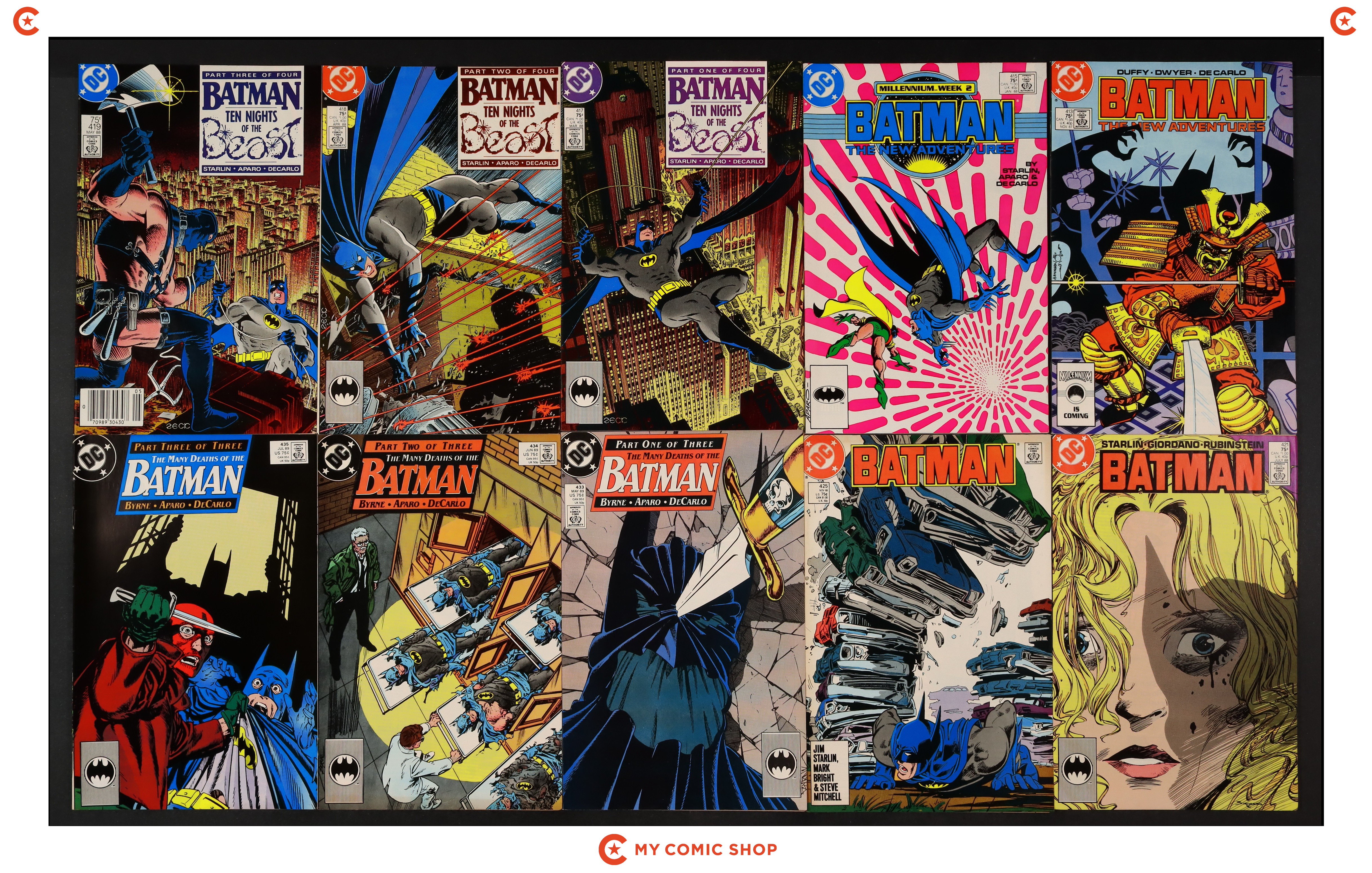 Issues 340N, 436, 437, 438, 439, 440, 441, 442 of Batman (1940). Most will grade in the VG to FN range.