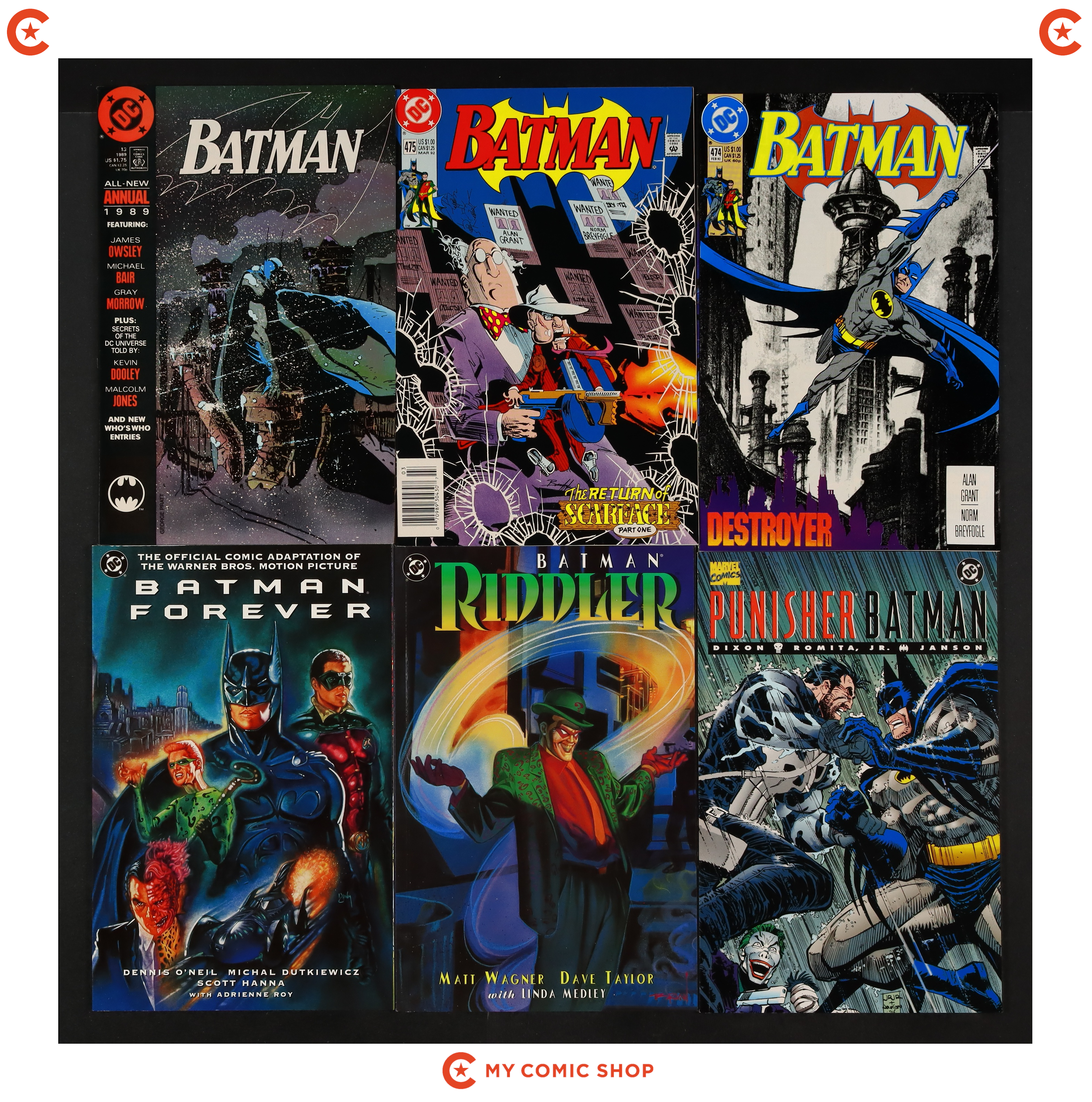Issues 443, 444, 446, 449, 457-459, 467, 469, and 473-475 of Batman (1940); 13 of Batman (1940) Annual; 1 of Punisher Batman Deadly Knights (1994); 1 of Batman Riddler (1995); and 0AU of Batman Forever (1995 DC) Movie Adaptation. Most will grade in the VF range with a couple grading FN.