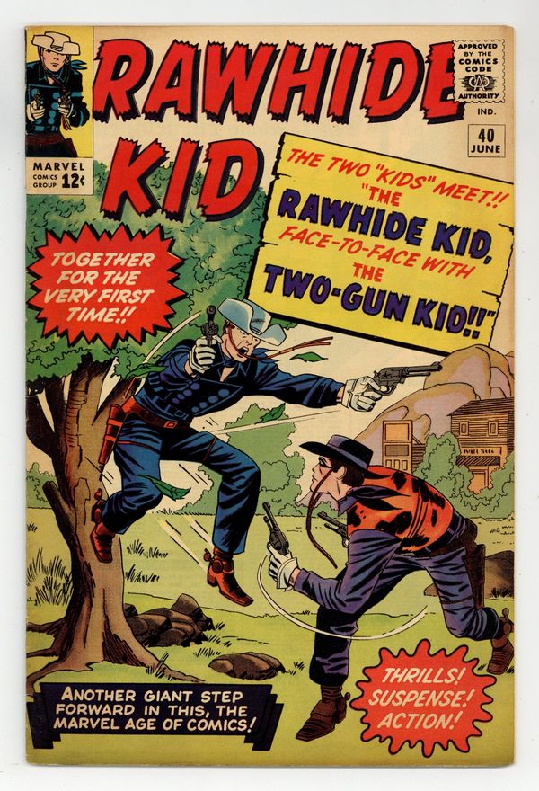 Starts Feb 9 Cover by Jack Kirby and Sol Brodsky. Stories by Stan Lee and Larry Lieber. Art by Dick Ayers and Larry Lieber. The two "Kids" meet as the Rawhide Kid comes face-to-face with the Two-Gun Kid! Together for the very first time! Thrills! Suspense! Action! Another giant step forward in this, the Marvel Age of Comics! Don't miss..."The Rawhide Kid Meets the Two-Gun Kid" by Stan Lee and Dick Ayers. Also in this issue: Back-up story "The Fastest Draw!" by Lee (plot) and Larry Lieber (script/art). Plus: 1-page text story "Murder on the Mesa" (continues next issue), reprinted from Girl Comics (1949) #11. 32 pages, full color. Cover price $0.12.