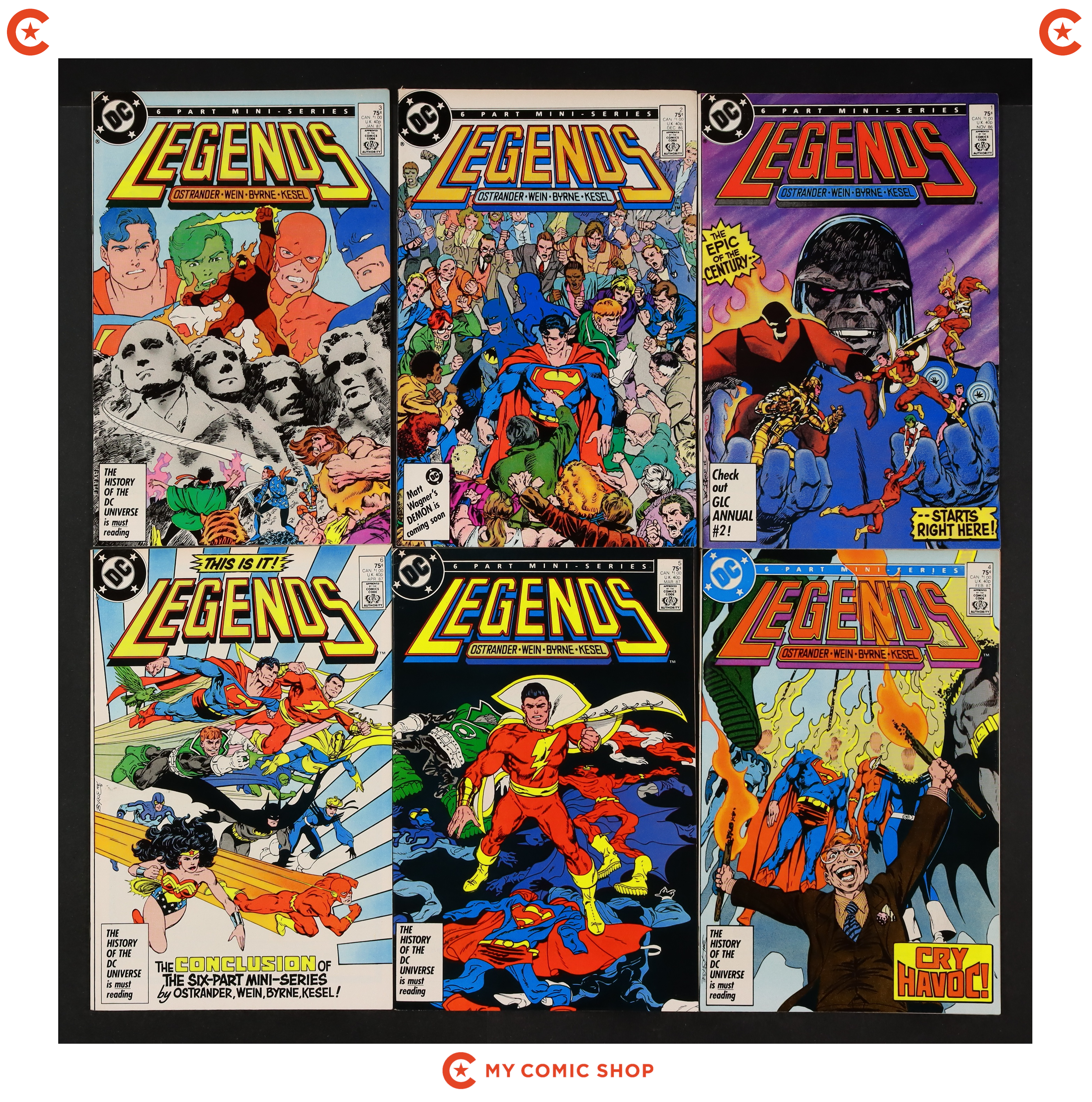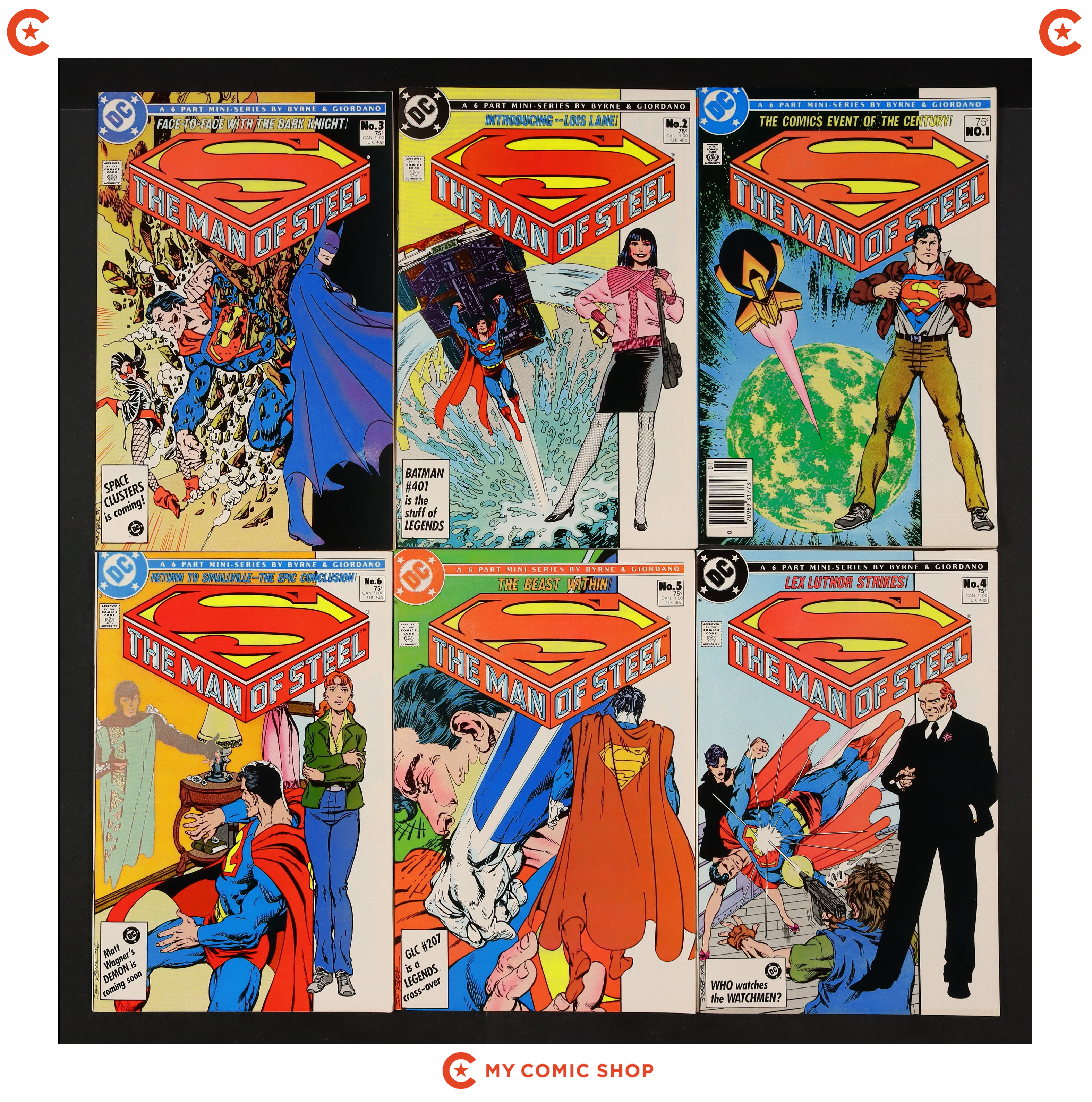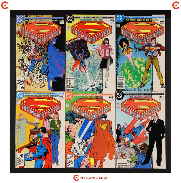 Issues 1B.N, 2, 3, 4, 5D, 6 of Man of Steel (1986), and issues 1A.D, 2D, 3D, 4D, 5, 6 of Legends (1986 DC). Most will grade in the FN range.