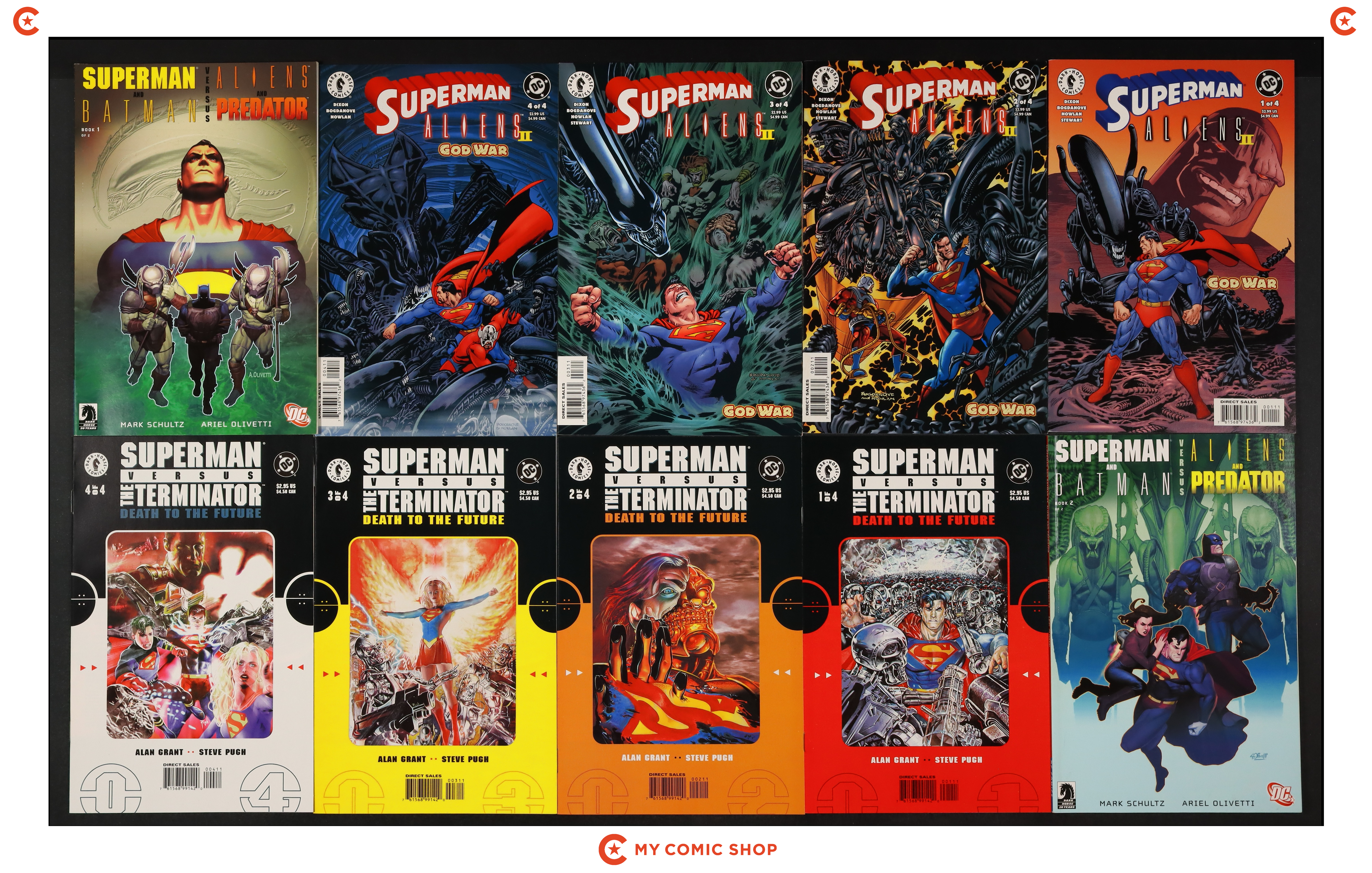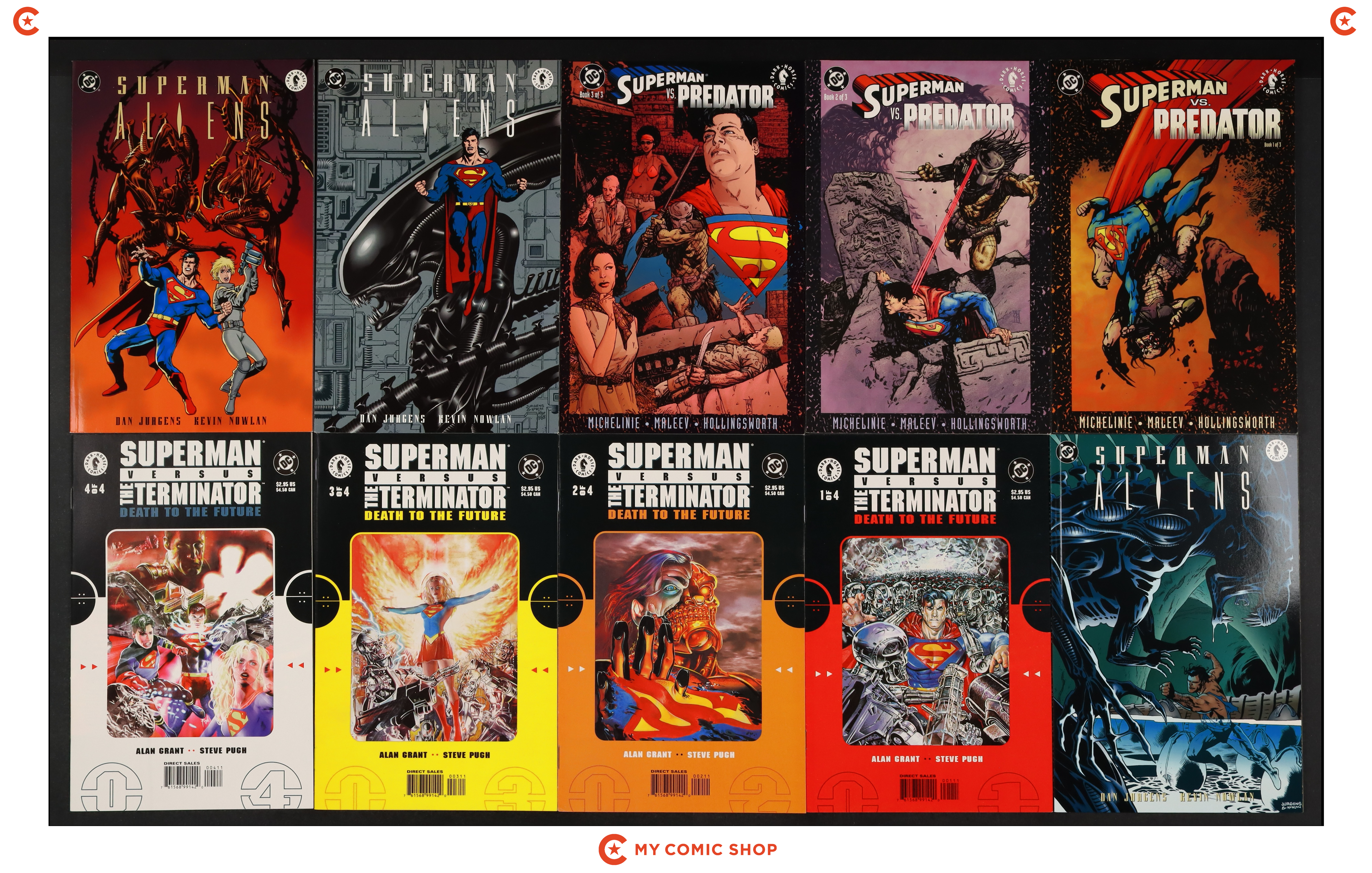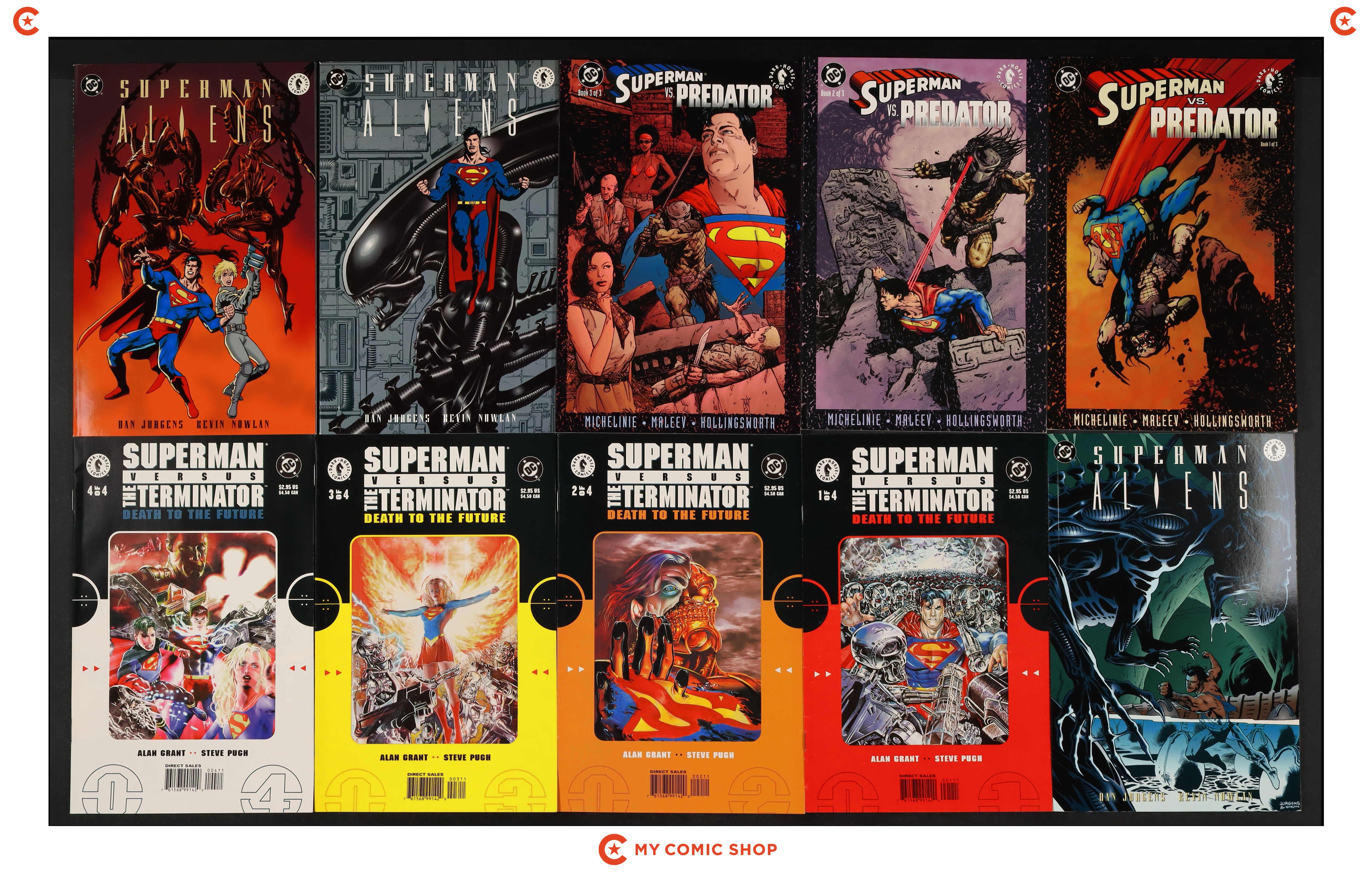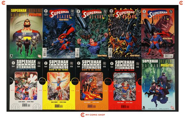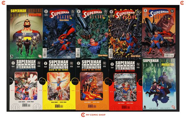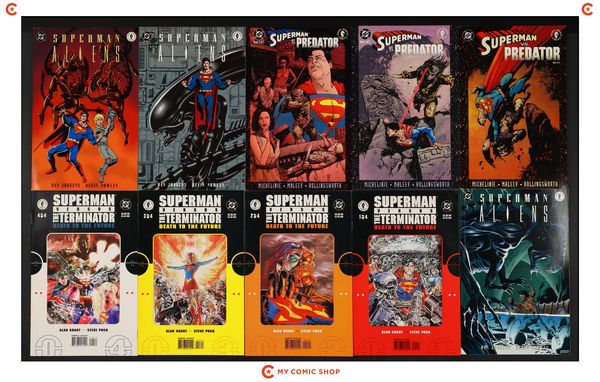 Issues 1-3 of Superman vs. Predator (2000), issues 1-3 of Superman vs. Aliens (1995), and issues 1-4 of Superman vs. the Terminator Death to the Future (1999). Most will grade in the FN to VF range.