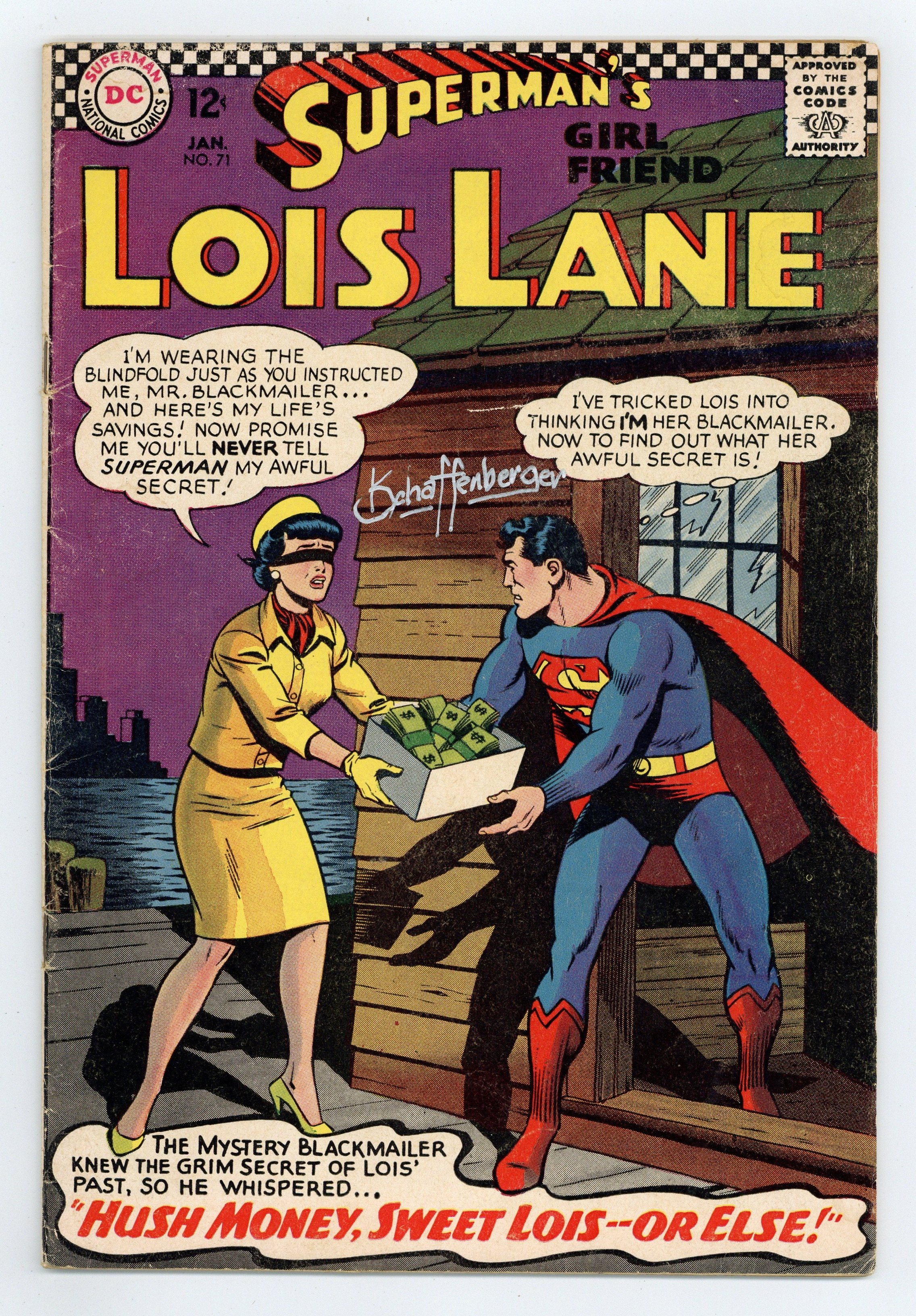 Signed by Kurt Schaffenberger, certification is not included. Centerfold detached at one staple. Water damage.