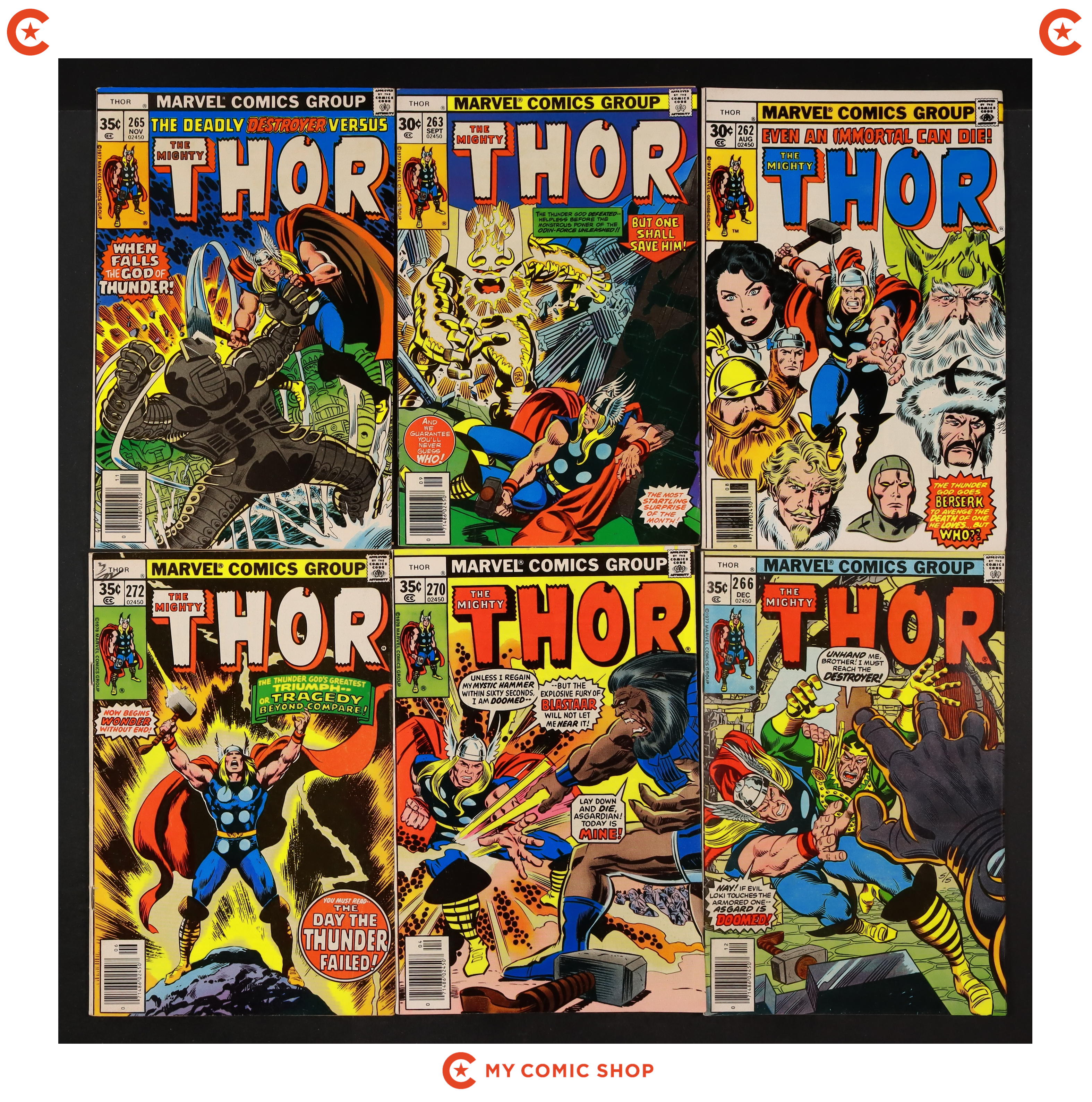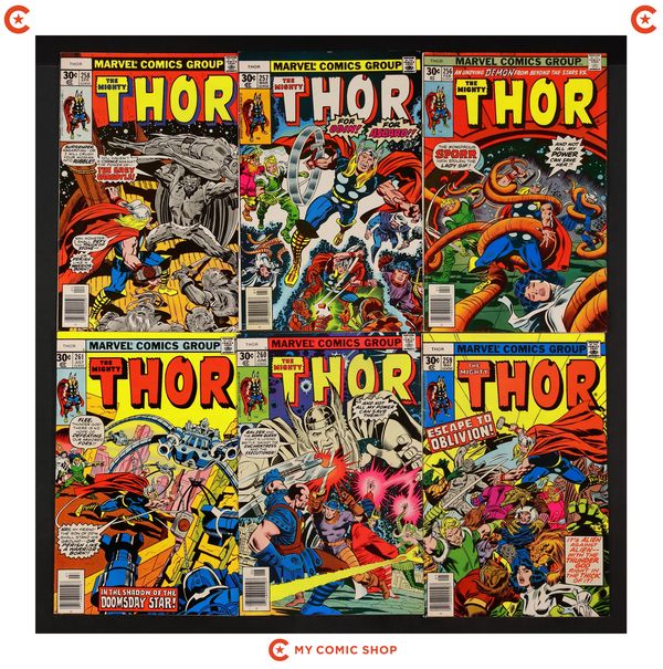 Issues 256-263, 265, 266, 270, and 272 of Thor (1962 Marvel 1st Series Journey Into Mystery). Most will grade in the FN range with a couple grading closer to VF.