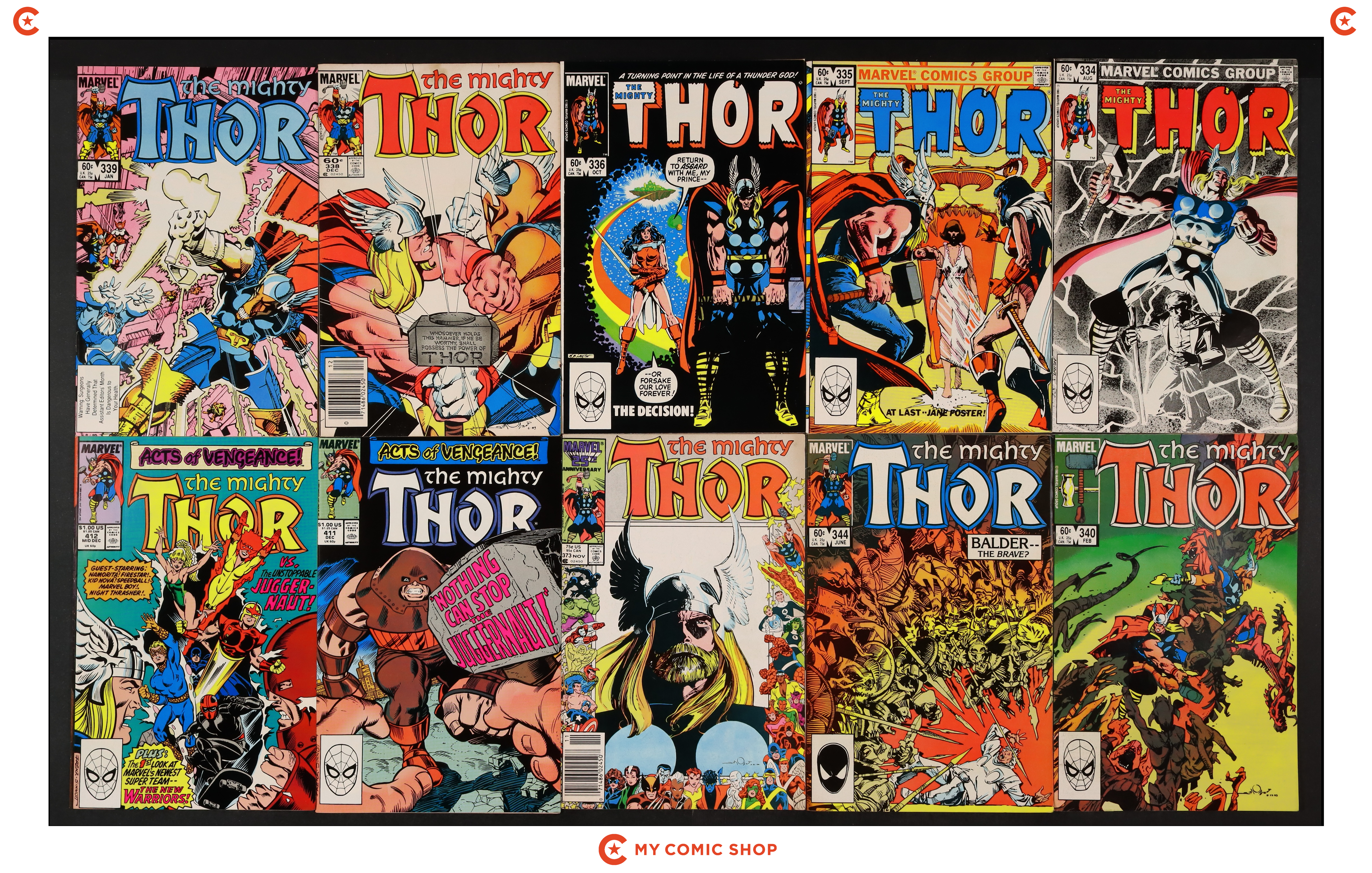 Issues 334-336, 338N, 339, 340, 344, 373N, 411, and 412 of Thor (1962 Marvel 1st Series Journey Into Mystery). Most will grade in the FN range with a couple grading VF.
