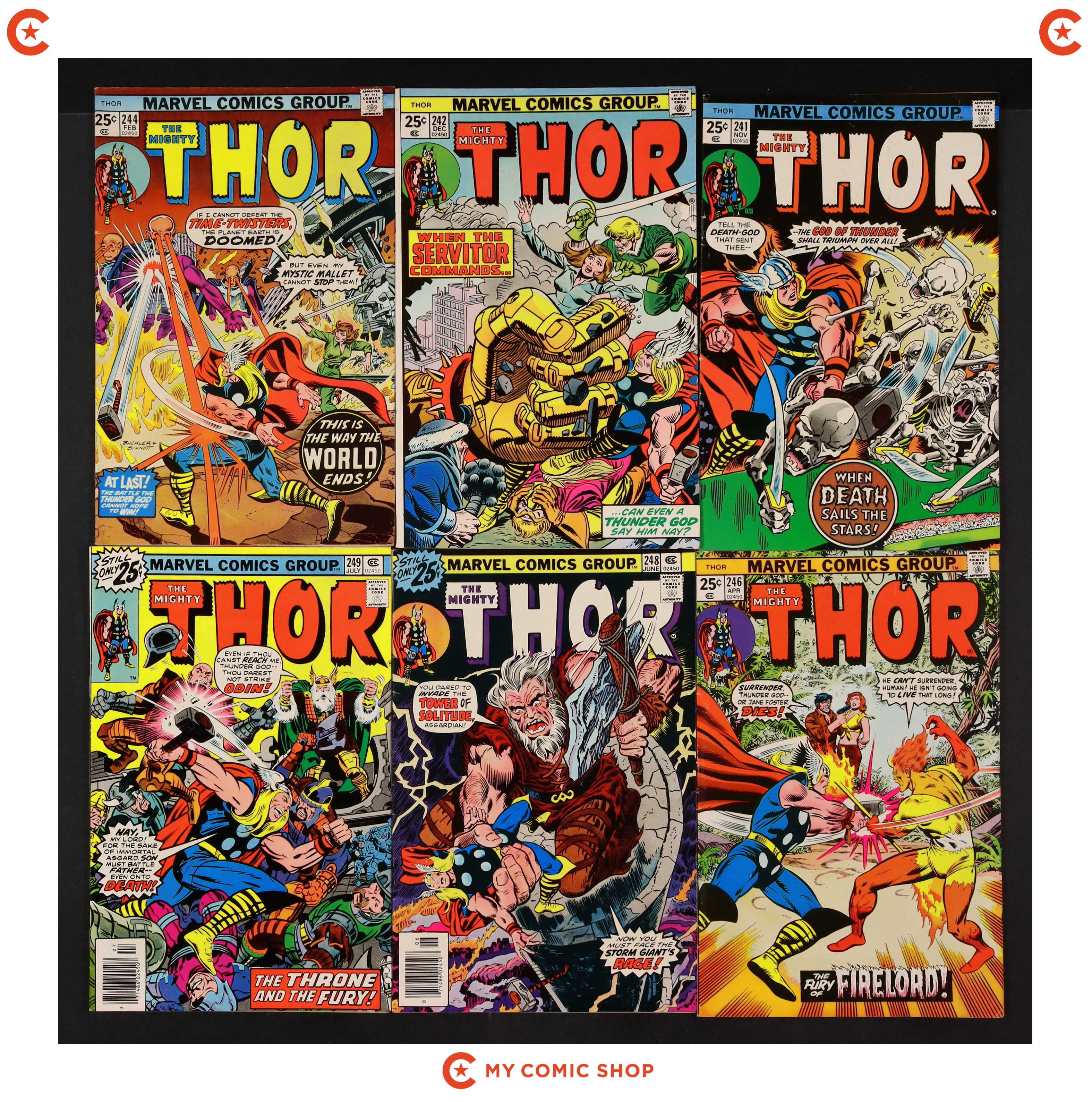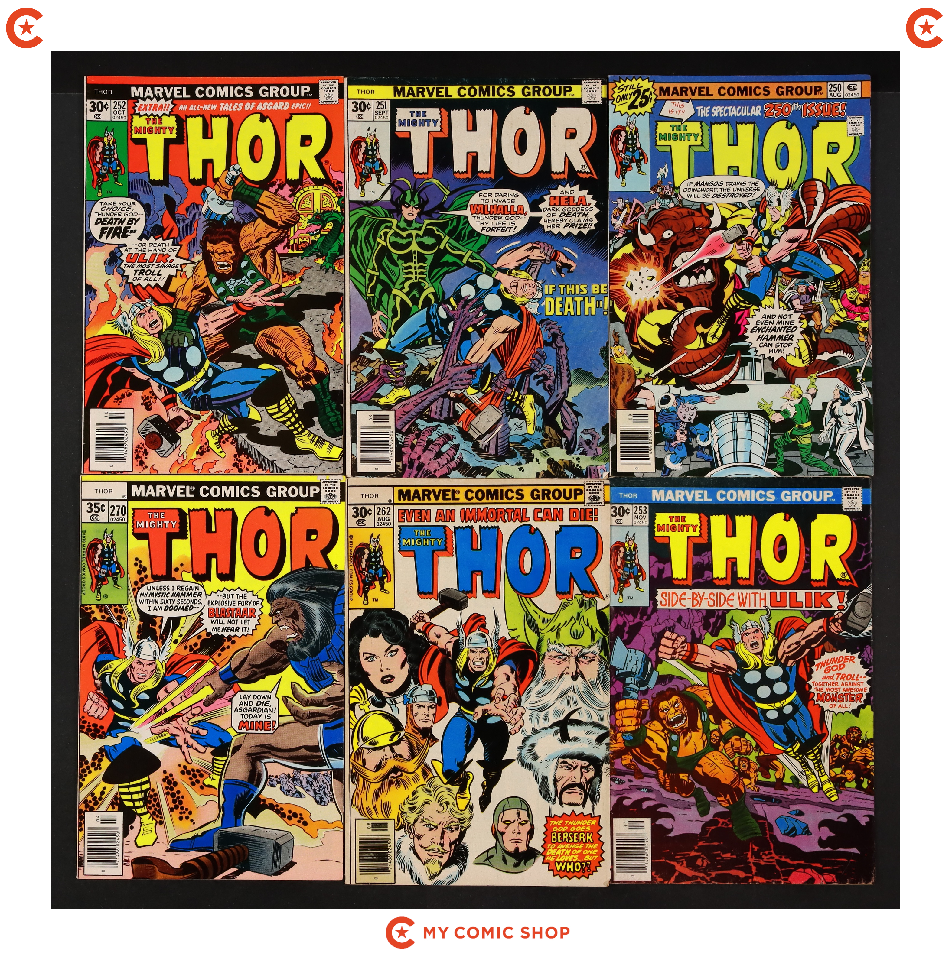 Issues 241, 242, 244, 246, 248-253, 262, and 270 of Thor (1962 Marvel 1st Series Journey Into Mystery). Most will grade in the FN range with a couple grading VG.