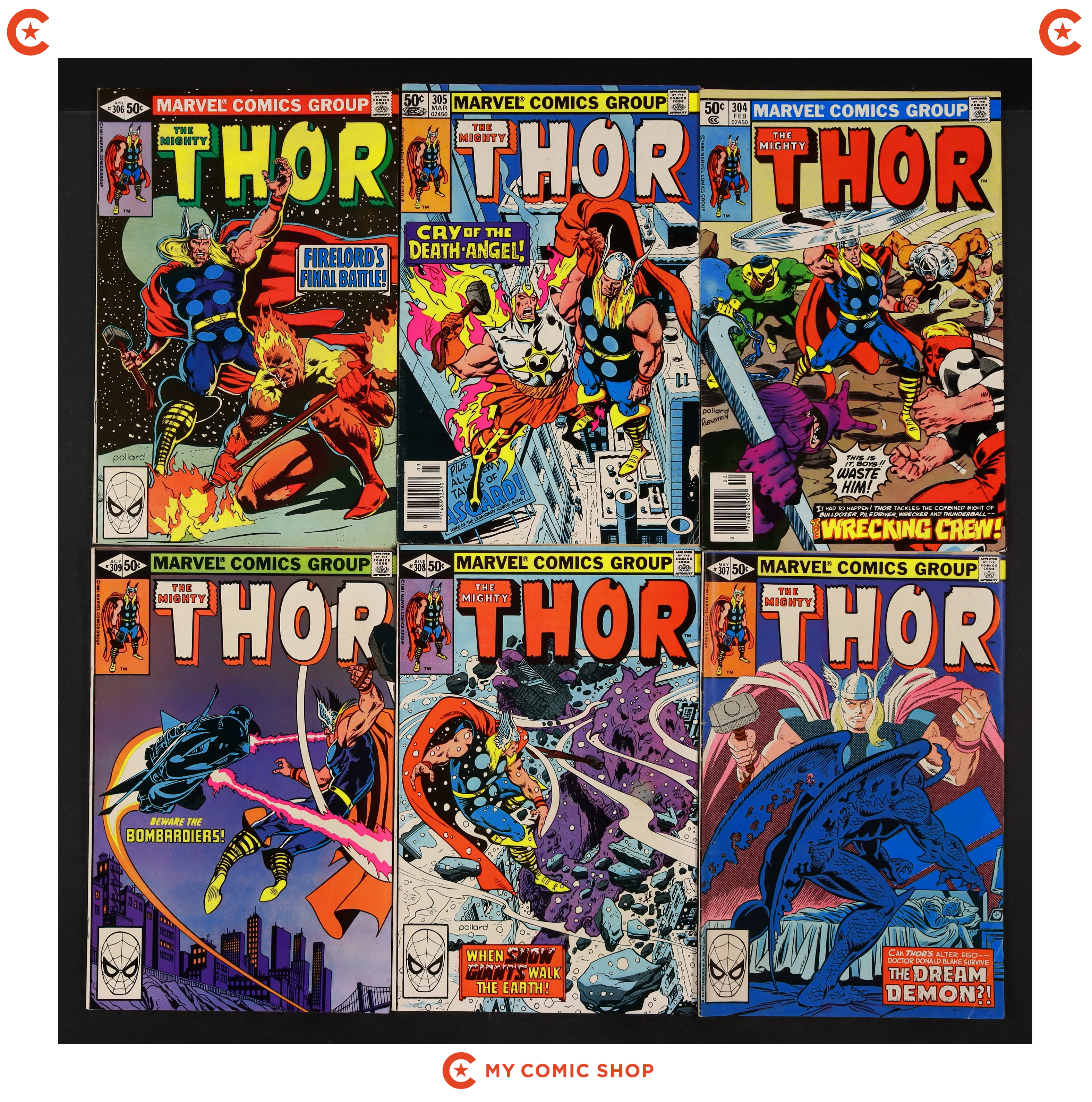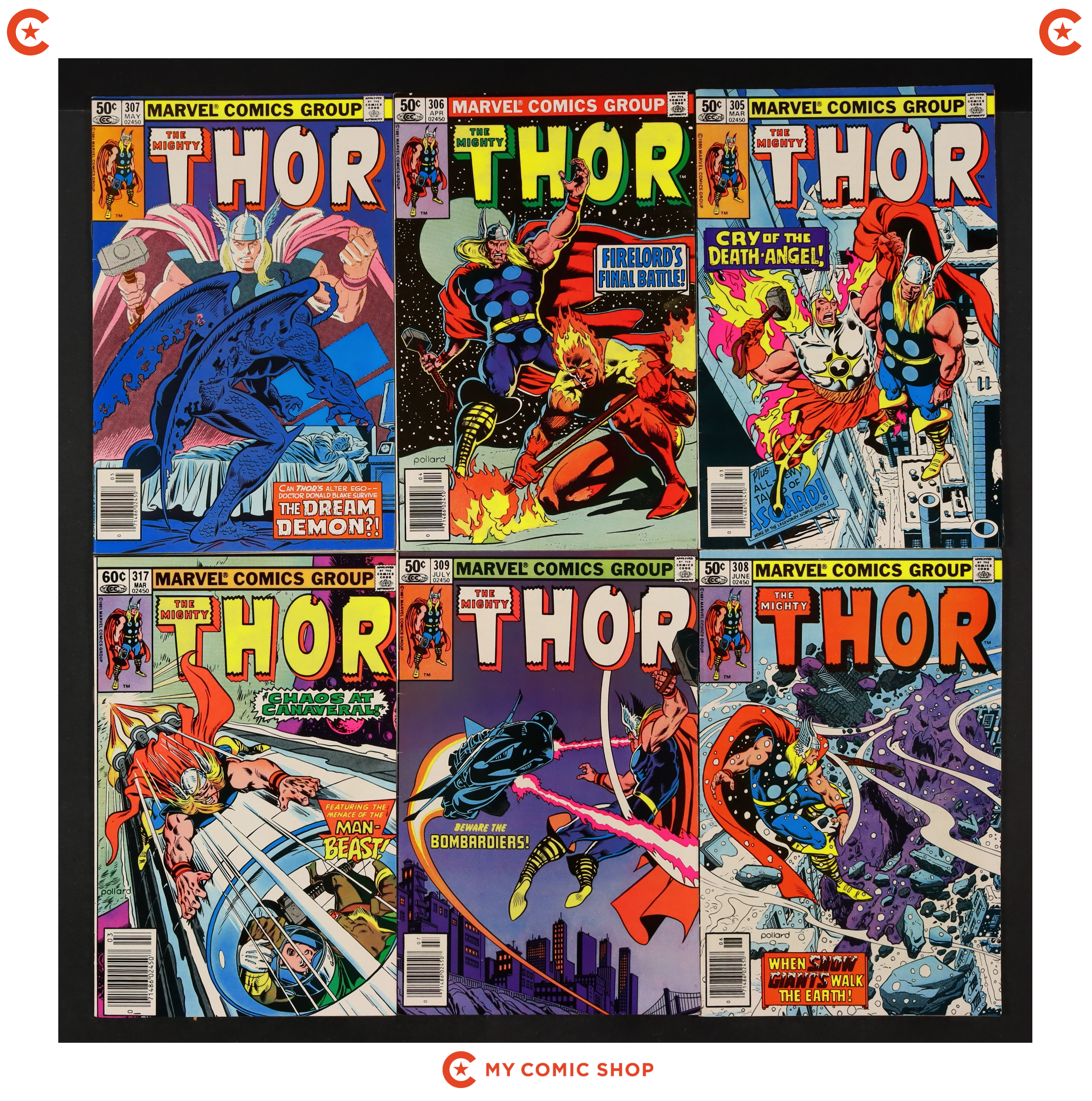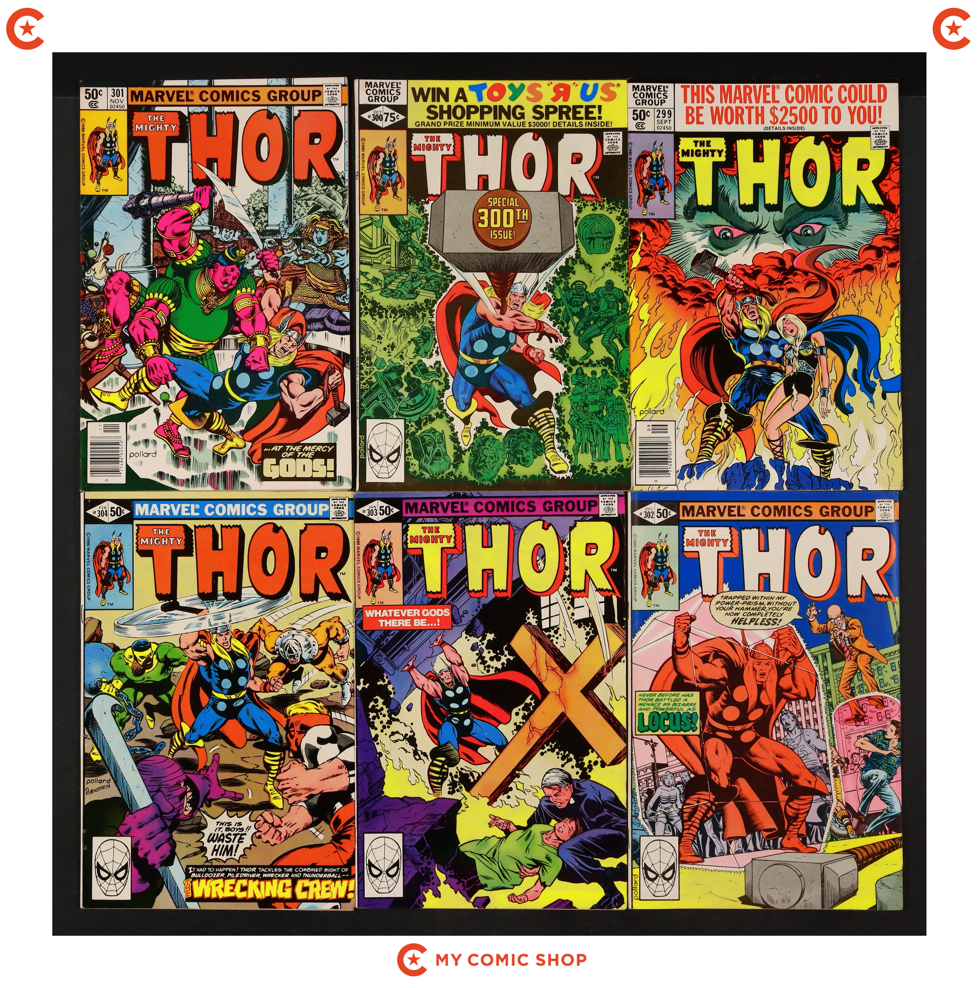 Issues 299-309 and 317 of Thor (1962 Marvel 1st Series Journey Into Mystery). Most will grade in the FN/VF to FN range.