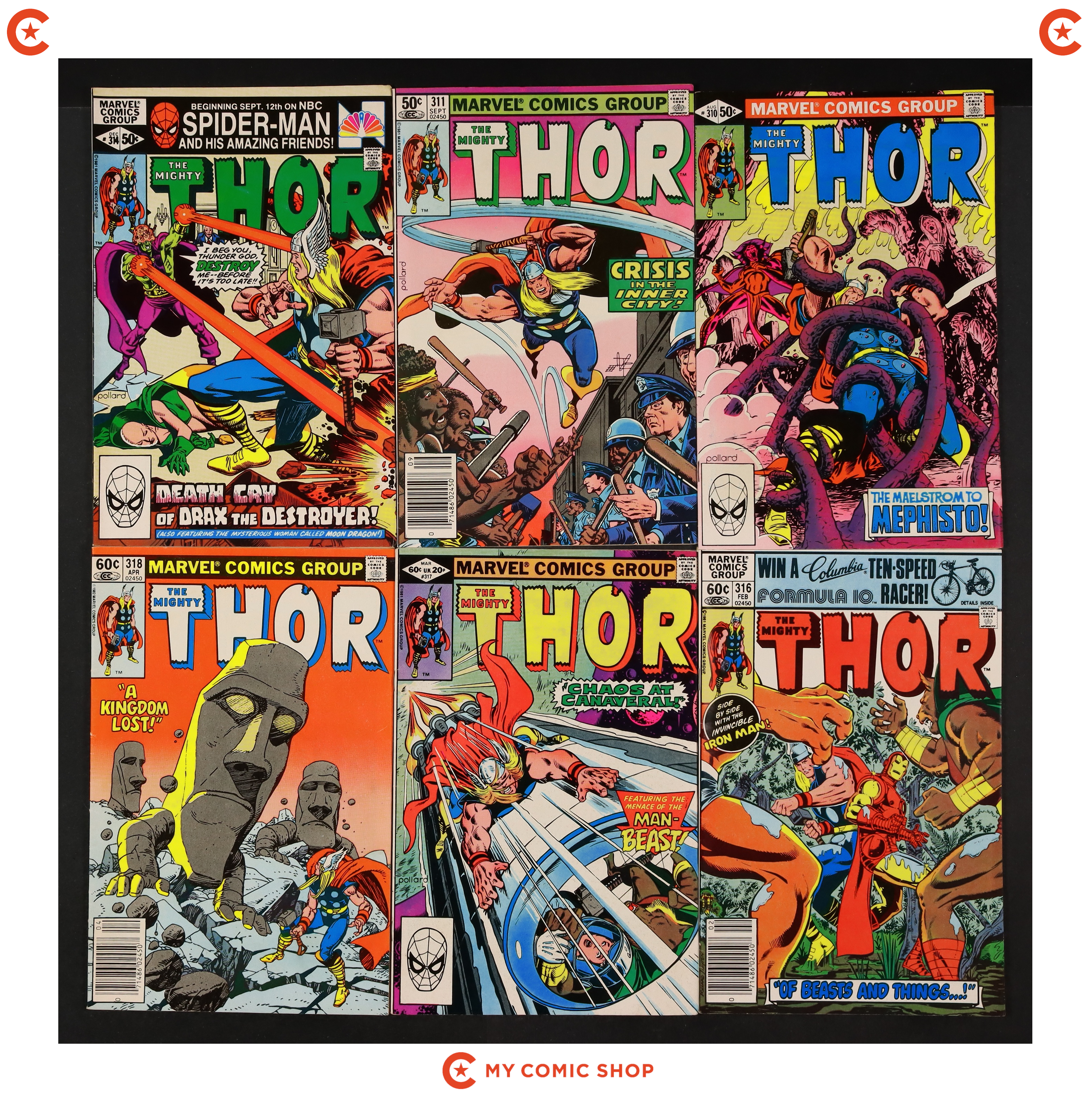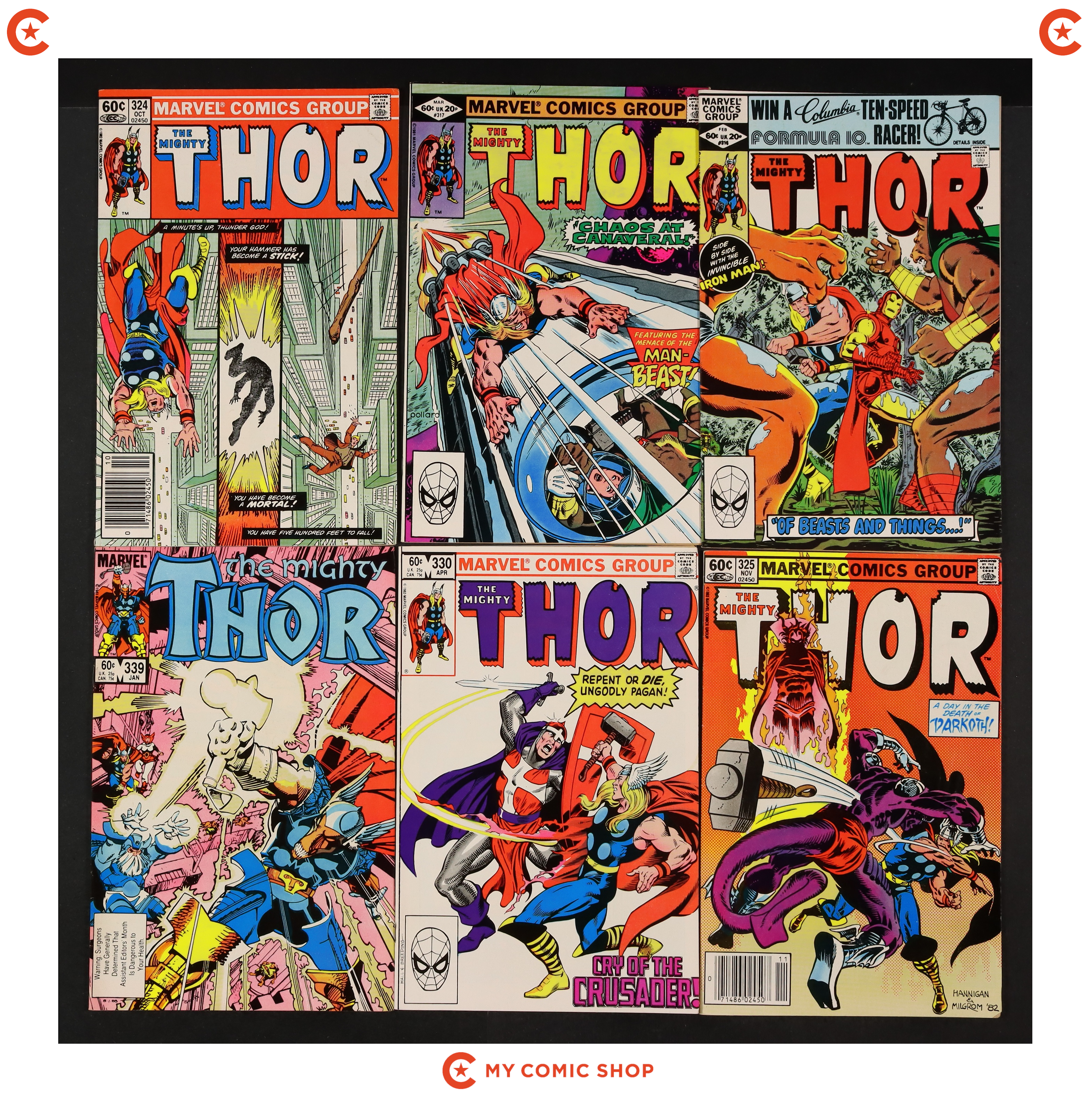 Issues 310, 311, 314, 316N, 317, 318, 321, 324, 325N, 326, 330, and 339N of Thor (1962 Marvel 1st Series Journey Into Mystery). Most will grade in the FN/VF to FN range.