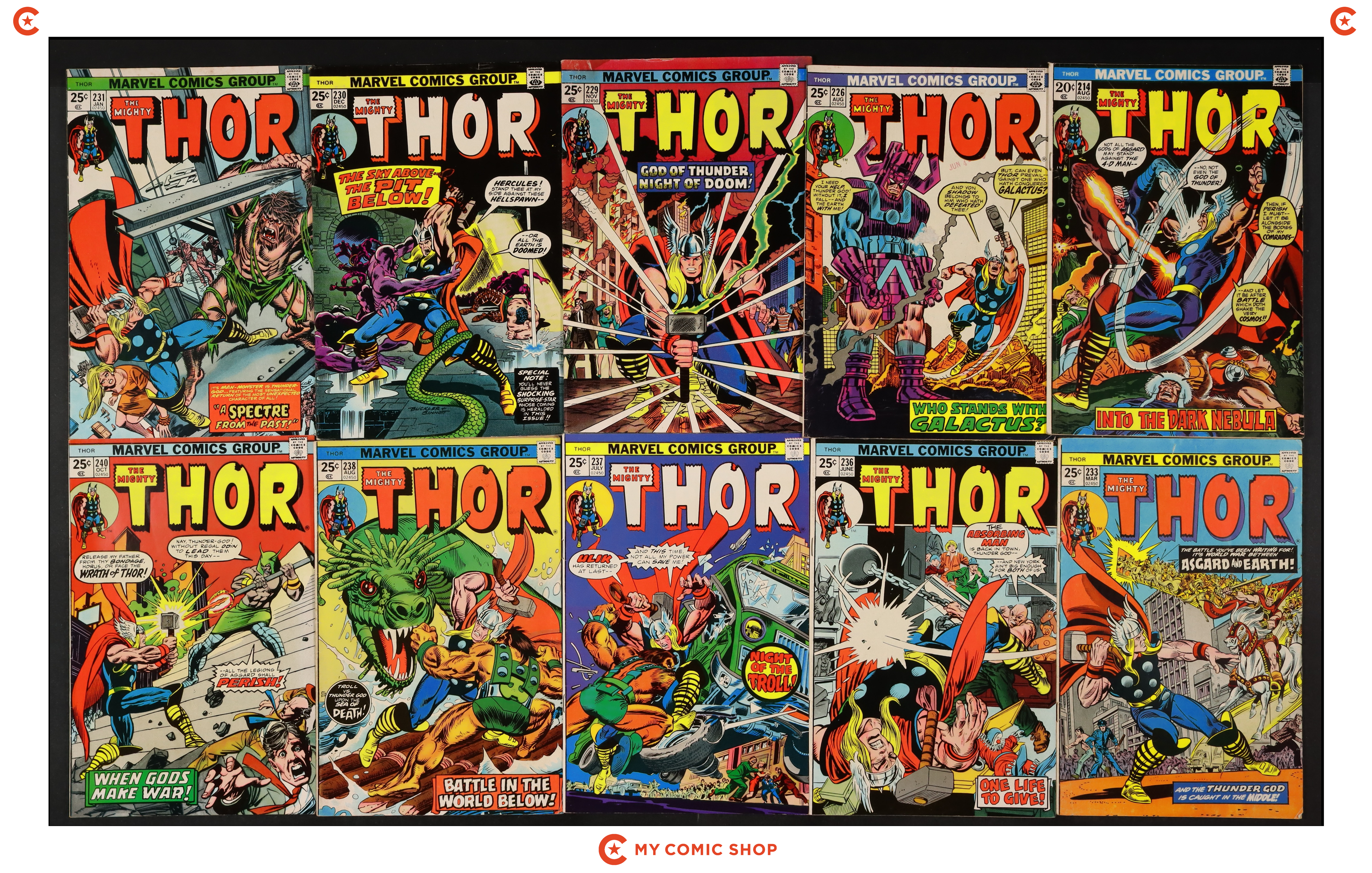 Issues 214, 226, 229-231, 233, 236-238, 240, 249, and 252 of Thor (1962 Marvel 1st Series Journey Into Mystery); and 7 of Thor (1962 Marvel 1st Series Journey Into Mystery) Annual. Most will grade in the FN to VG range with #233 grading PR (multiple pages missing, affects story and art), and #237 grading FR (missing Marvel Value Stamp).