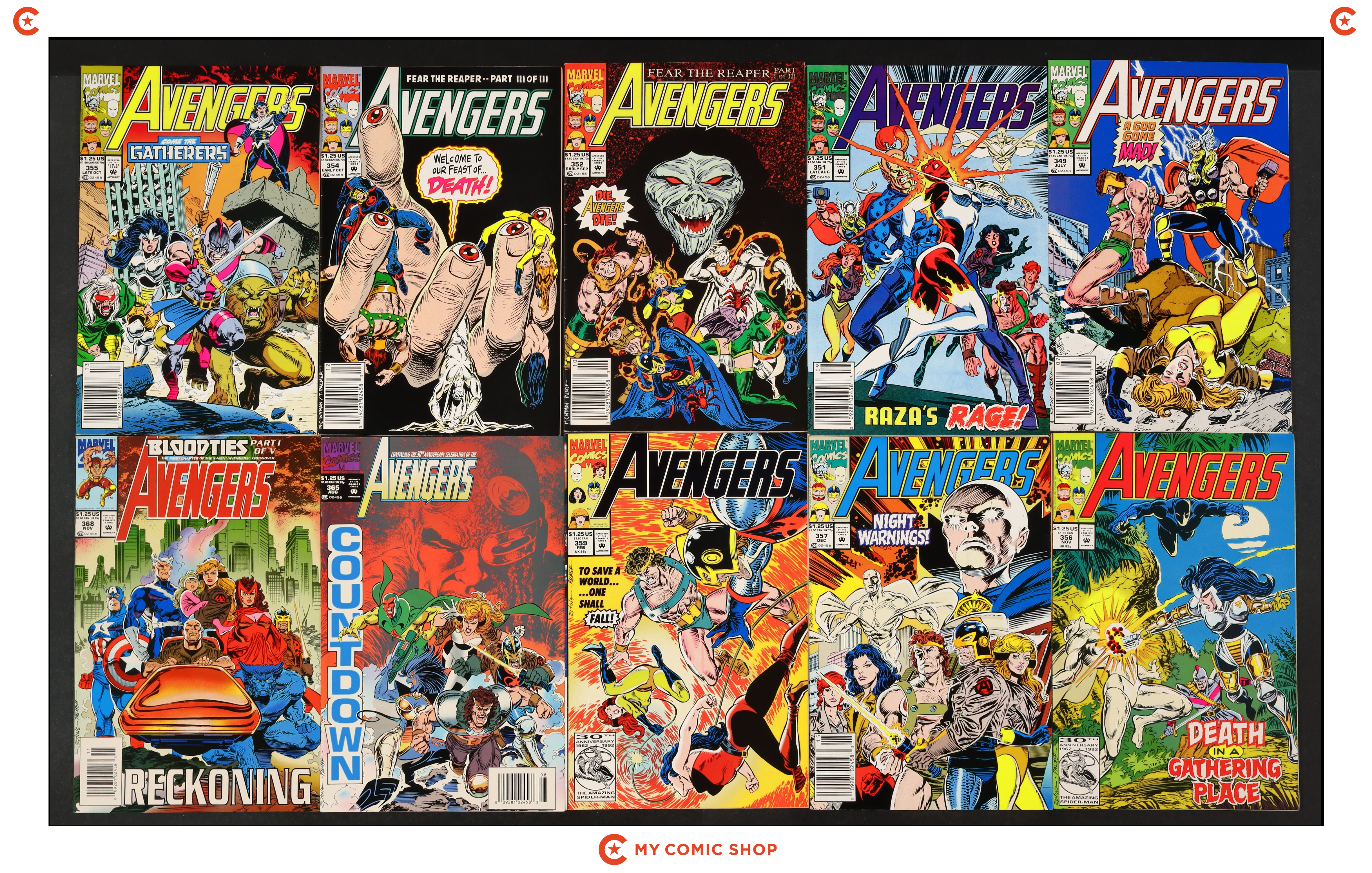 Issues 317, 347, 360, 365, 368, 369, 374, and 375A of Avengers (1963 1st Series); and 15 and 17 of Avengers (1963 1st Series) Annual. Most will grade in the FN range with a couple grading VG.