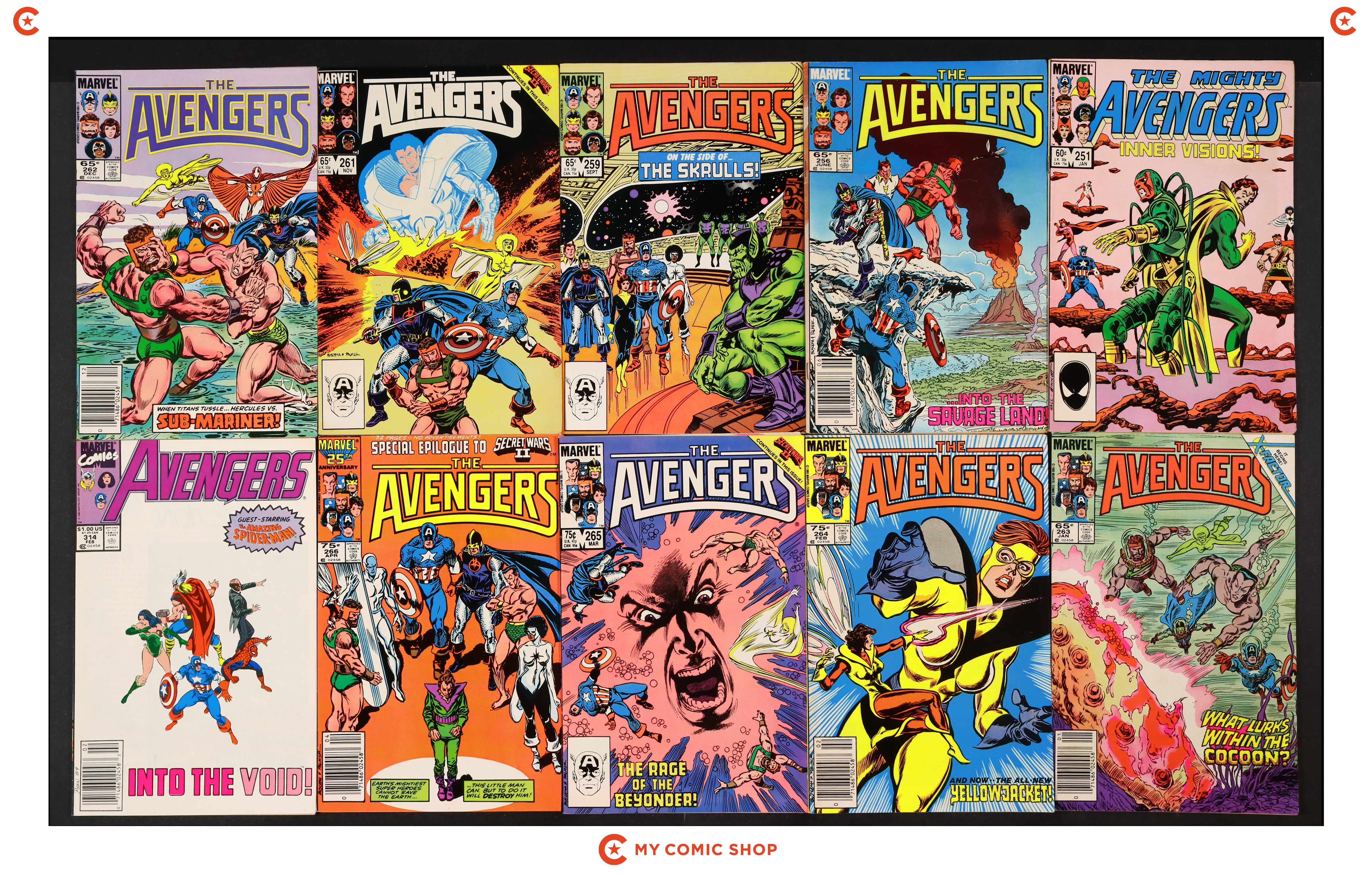 Issues 251, 256, 259, 261-266, and 314N-318N of Avengers (1963 1st Series). Most will grade in the FN/VF to FN range.