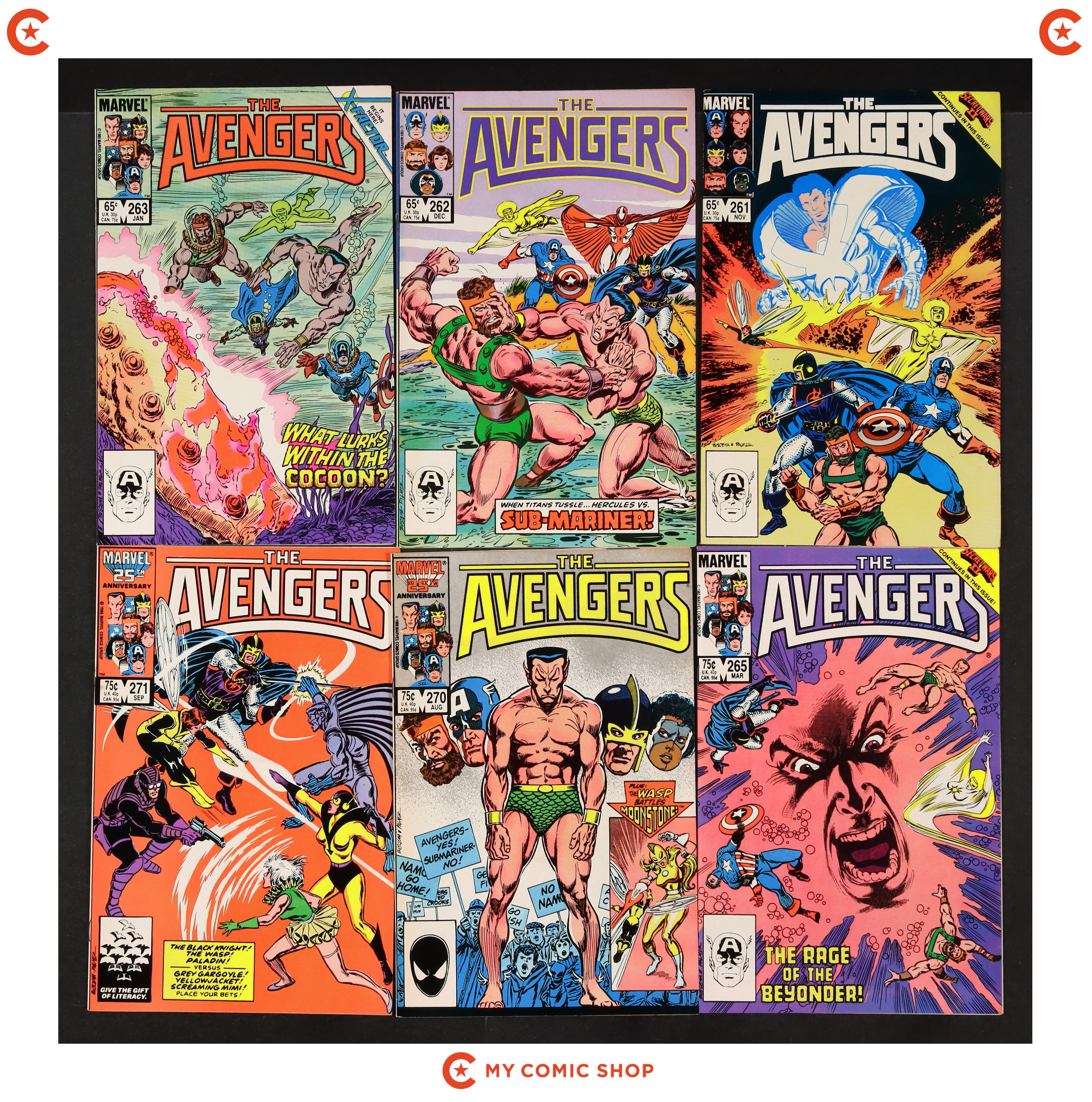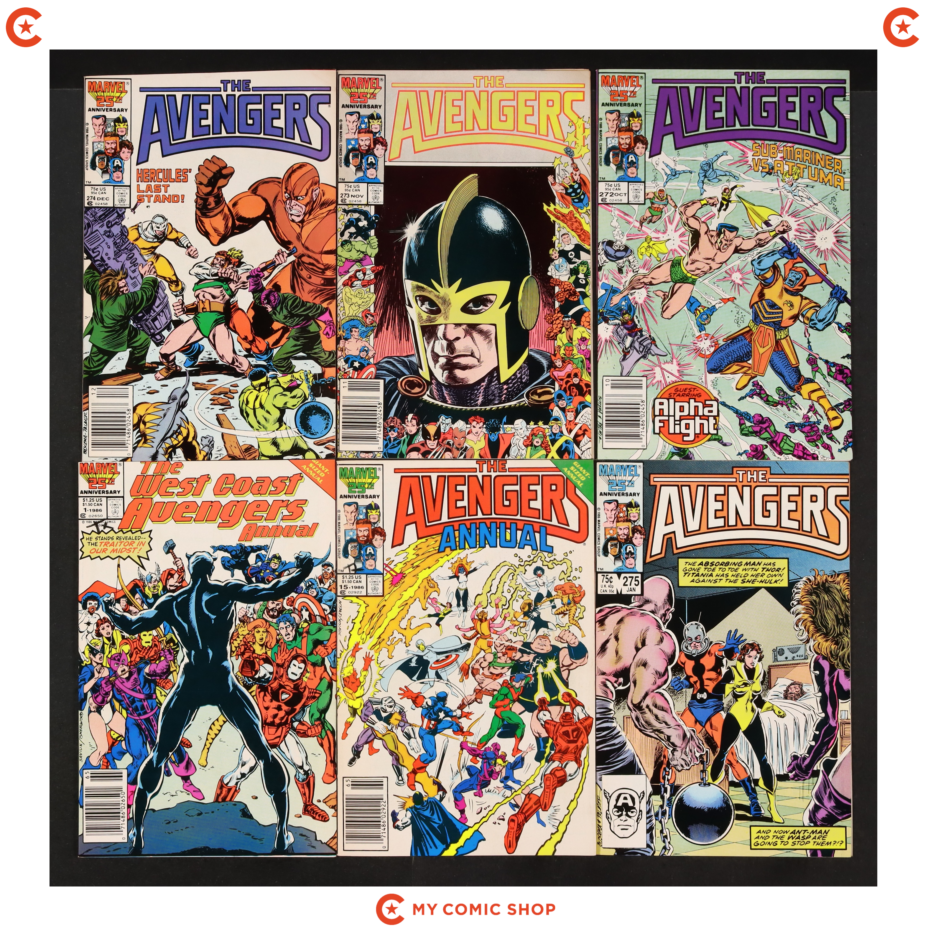 Issues 261-263, 265, 270-275 of Avengers (1963 1st Series), issue 15 of Avengers (1963 1st Series) Annual, and issue 1 of Avengers West Coast (1986) Annual. Most will grade in the VG to FN range.