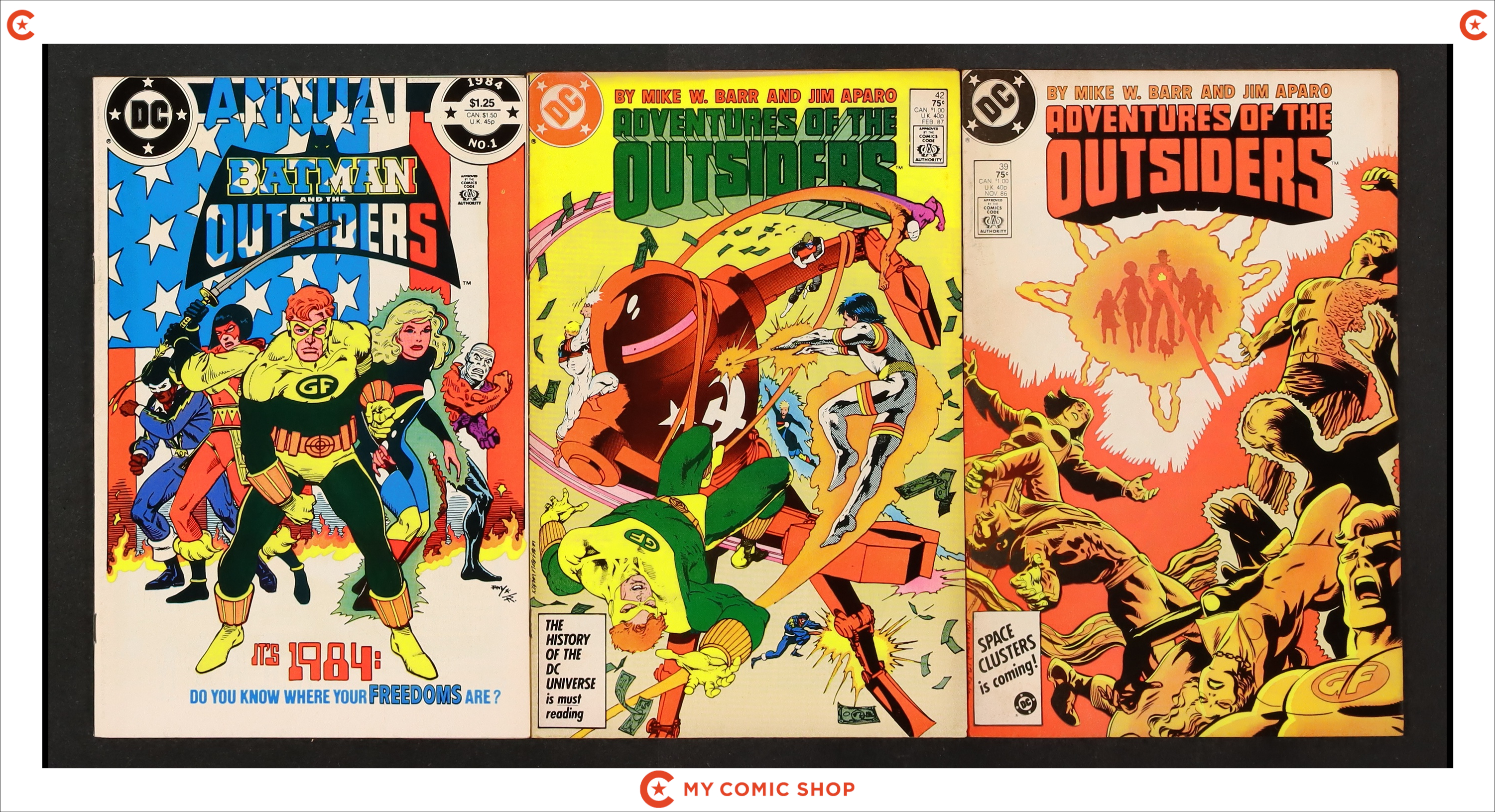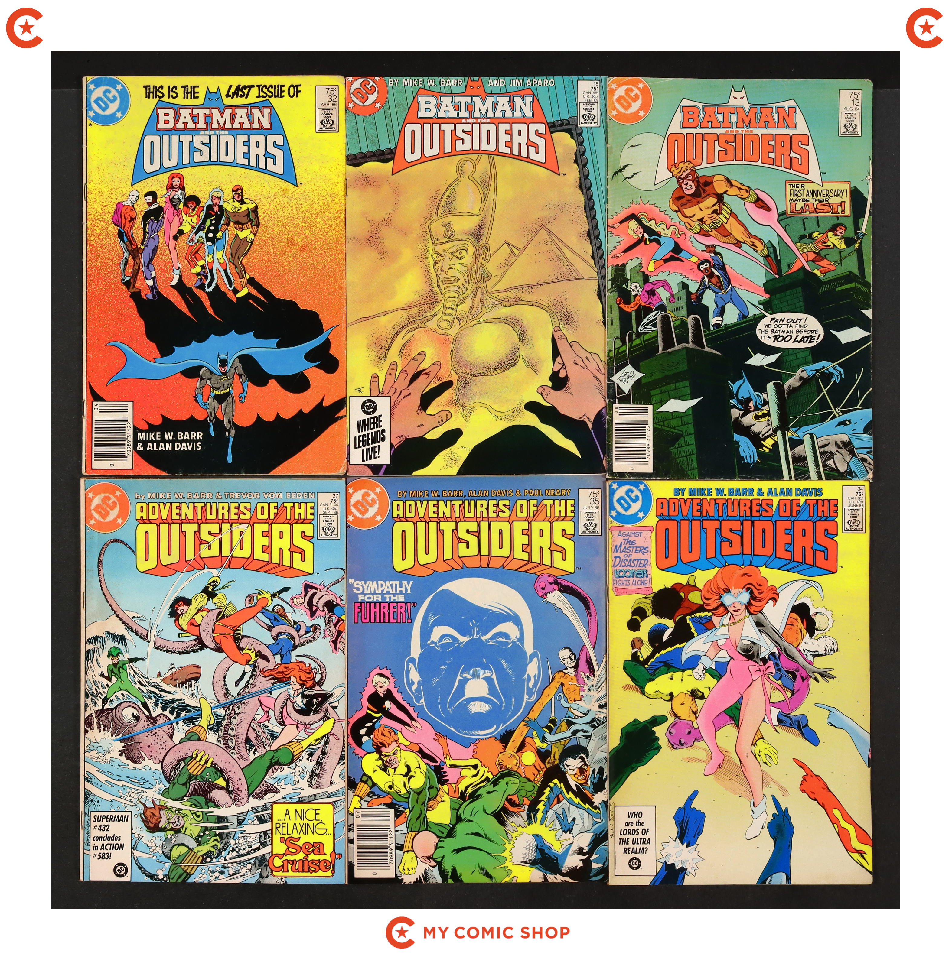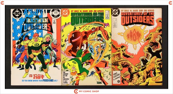 Issues 13, 18, 32, 34, 35, 37, 39, and 42 of Batman and the Outsiders (1983 1st Series); and 1 of Batman and the Outsiders (1984) Annual. Most will grade in the FN to VG range.