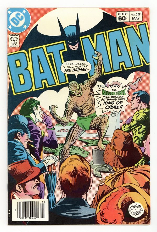 Starts Apr 27 Direct Edition. Cover pencils by Ed Hannigan, inks by Dick Giordano. 1st full appearance of Killer Croc in "Don't Mess with Killer Croc!" starring Batman, Robin, Commissioner Gordon, Alfred Pennyworth, Trina Todd, and The Squid, script by Gerry Conway, pencils by Curt Swan, inks by Rodin Rodriguez; With the Squid eliminated, Killer Croc appoints himself the new head of the Gotham Underground as Batman puts together the pieces of Killer Croc's involvement in the Squid's death. 36 Pages, Full Color. Cover price $0.60.