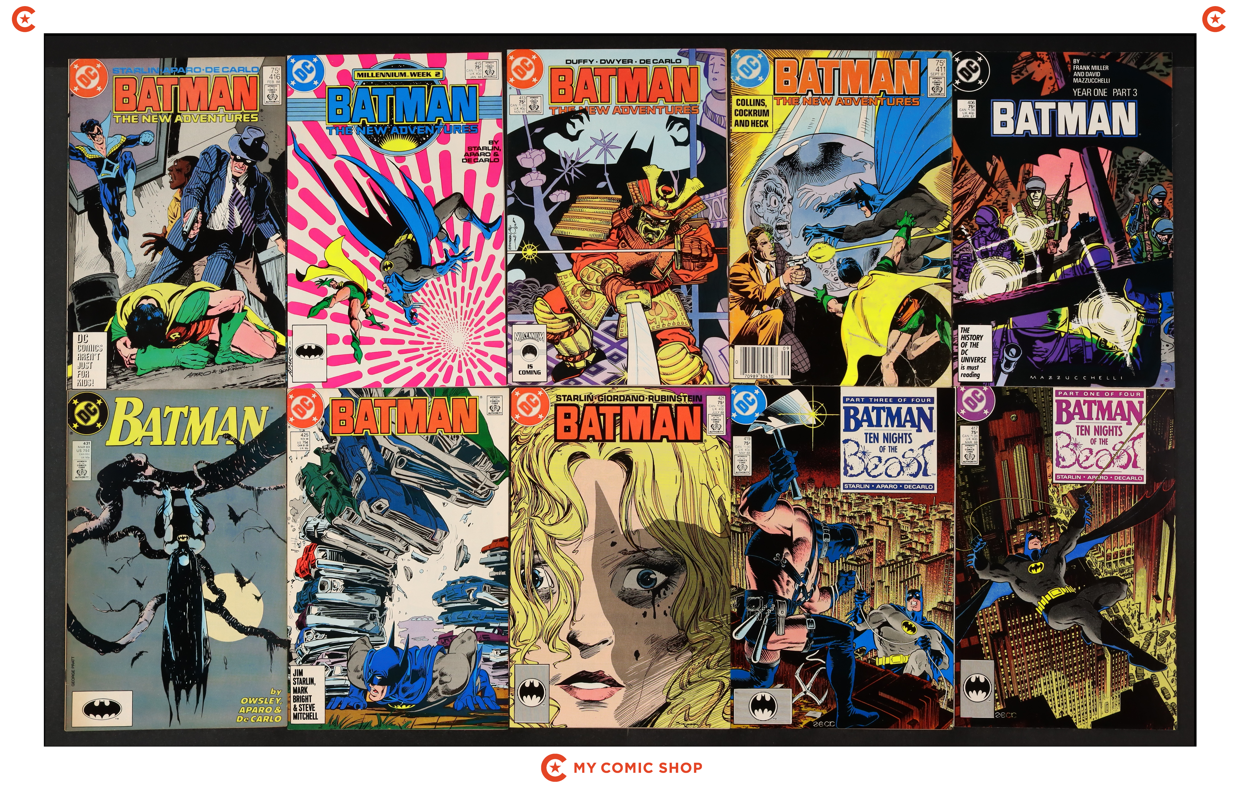 Issues 406, 411, 413, 415-417, 419, 421, 425, and 431 of Batman (1940). Most will grade in the FN range with a couple grading VG.