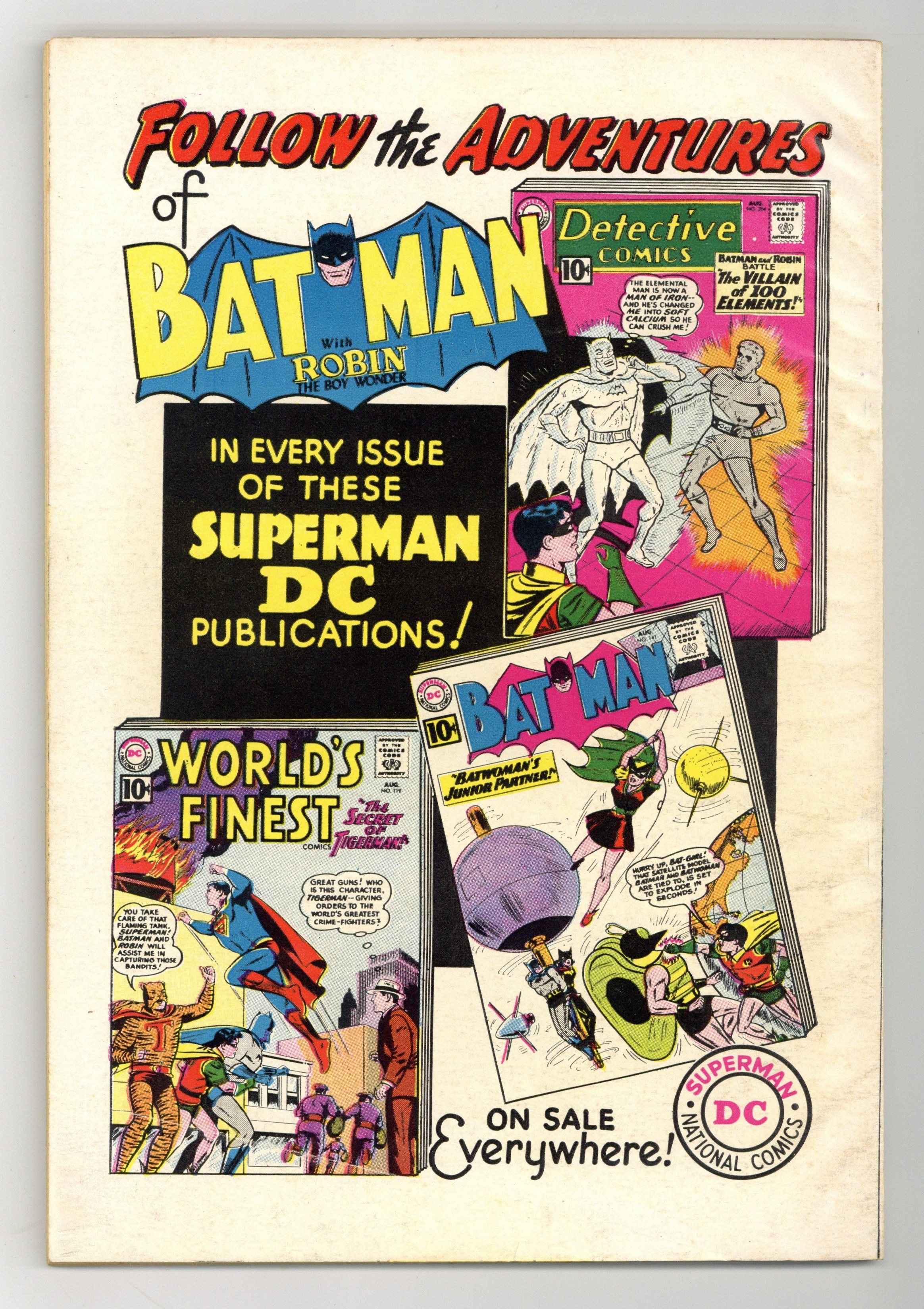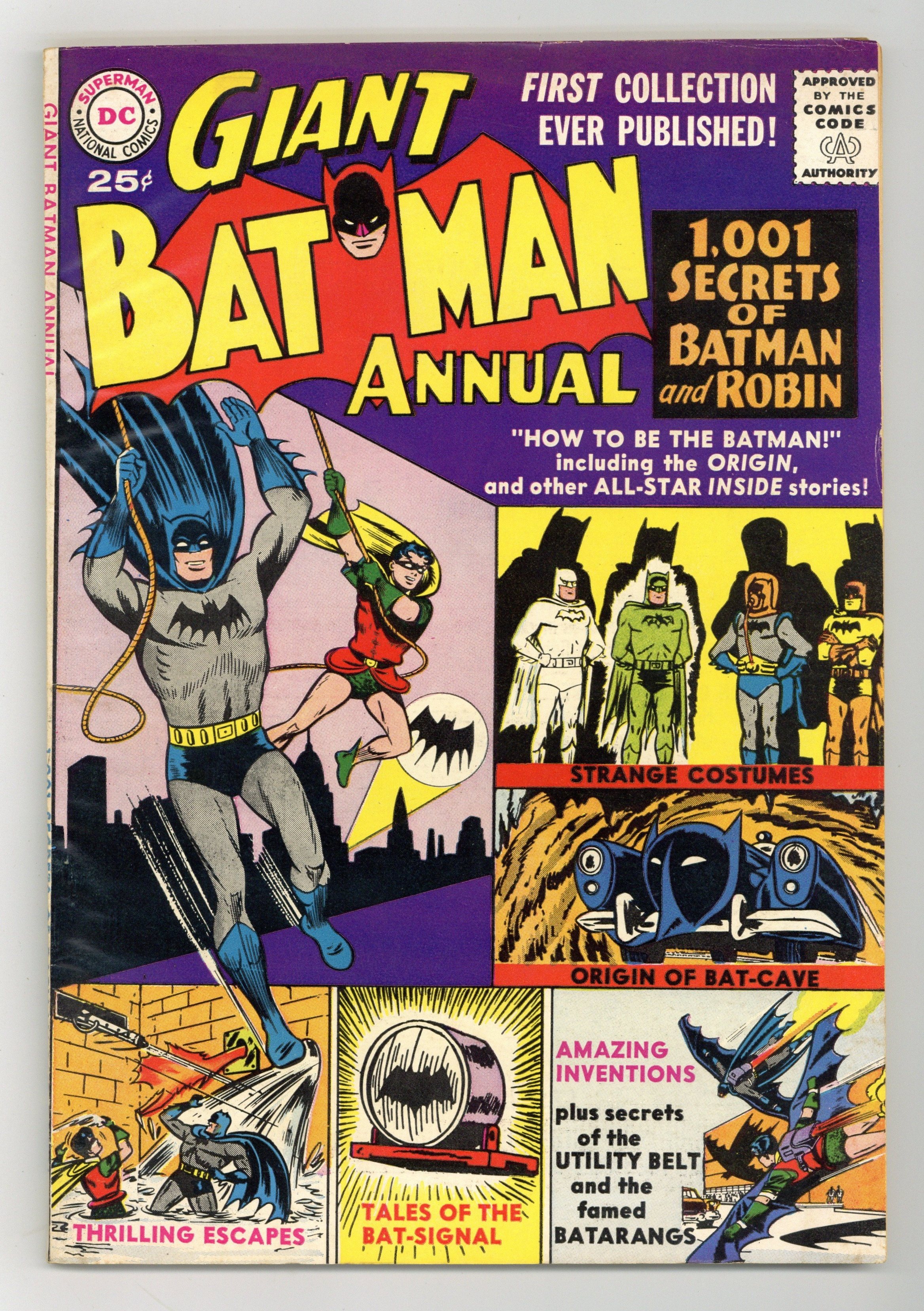 Starts Apr 4 All reprints. Cover pencils by Curt Swan, Sheldon Moldoff, and Dick Sprang, inks by Charles Paris. "How to Be the Batman!", pencils by Lew Sayre Schwartz, inks by Charles Paris; Batman loses his memory after being exposed to amnesia gas, when the antidote fails, Robin must teach the Cowled Crimefighter all that he has forgotten; Origin retold. "The Strange Costumes of Batman!", script by Edmond Hamilton, pencils by Dick Sprang, inks by Charles Paris; A look at some of the specialized costumes that Batman has utilized over his career, including one garment that he had hoped never to use. "Untold Tales of the Bat-Signal!", script by David Vern, pencils by Lew Sayre Schwartz, inks by Charles Paris; Reporter Dave Purdy saves Batman by dazzling an approaching murderer with the Bat Signal; The Masked Manhunter is happy to let Purdy have the credit. Secrets of Batman's Utility Belt; Famed Batarang. "The Origin of the Bat-Cave!", script by Bill Finger, pencils by Sheldon Moldoff, inks by Charles Paris; Professor Nicholls sends the Dynamic Duo back in time 300 years, there they meet Jeremy Coe, a frontiersman spy who doubles as a Red Indian. "Batman's Electronic Crime-File!", pencils by Dick Sprang, inks by Charles Paris; The microfilm from Batman's crime file is stolen from the Bat-Cave. "Thrilling Escapes of Batman and Robin!", pencils by Sheldon Moldoff, inks by Charles Paris; Villainous Paul King captures Batman and Robin, he then sets about devising an inescapable trap, based on Robin's recollections about their previous ingenious escapes. "The Amazing Inventions of Batman," script by Edmond Hamilton, pencils by Dick Sprang, inks by Charles Paris; Batman gets word that one of his inventions is to be used against him, he and Robin must then examine their many crime fighting innovations for clues. Superman ad. Secret Origins ad. Batman with Robin the Boy Wonder ad. 84 pgs., full color. Cover price $0.25.