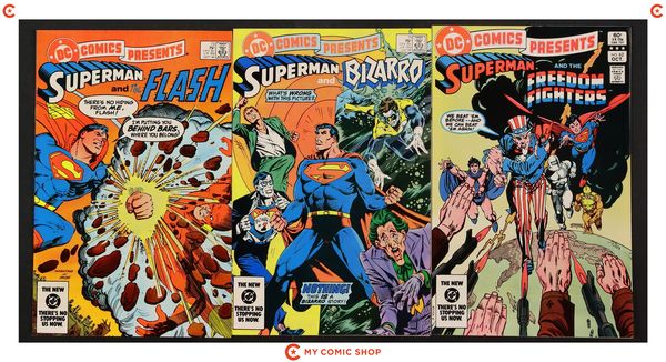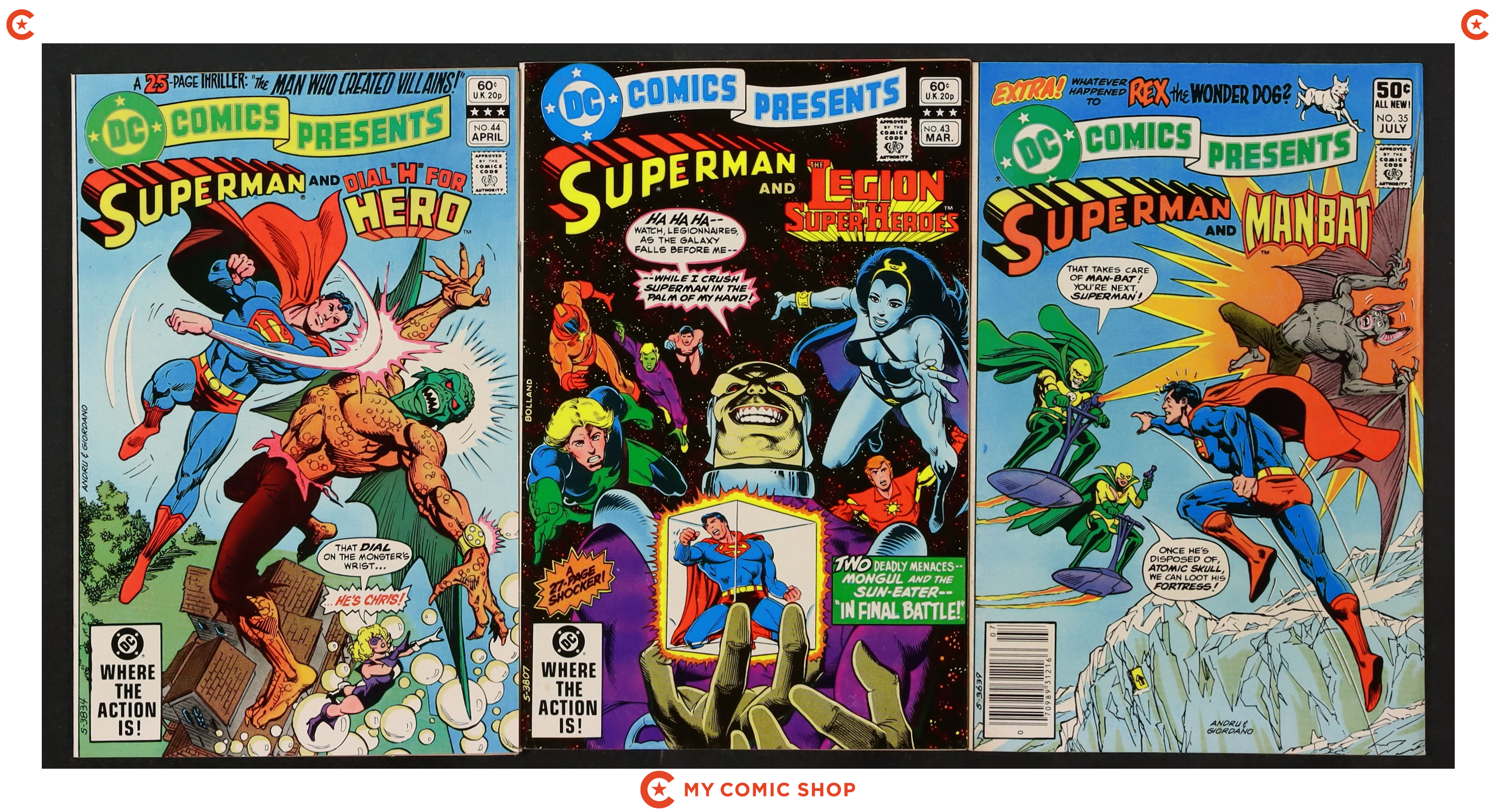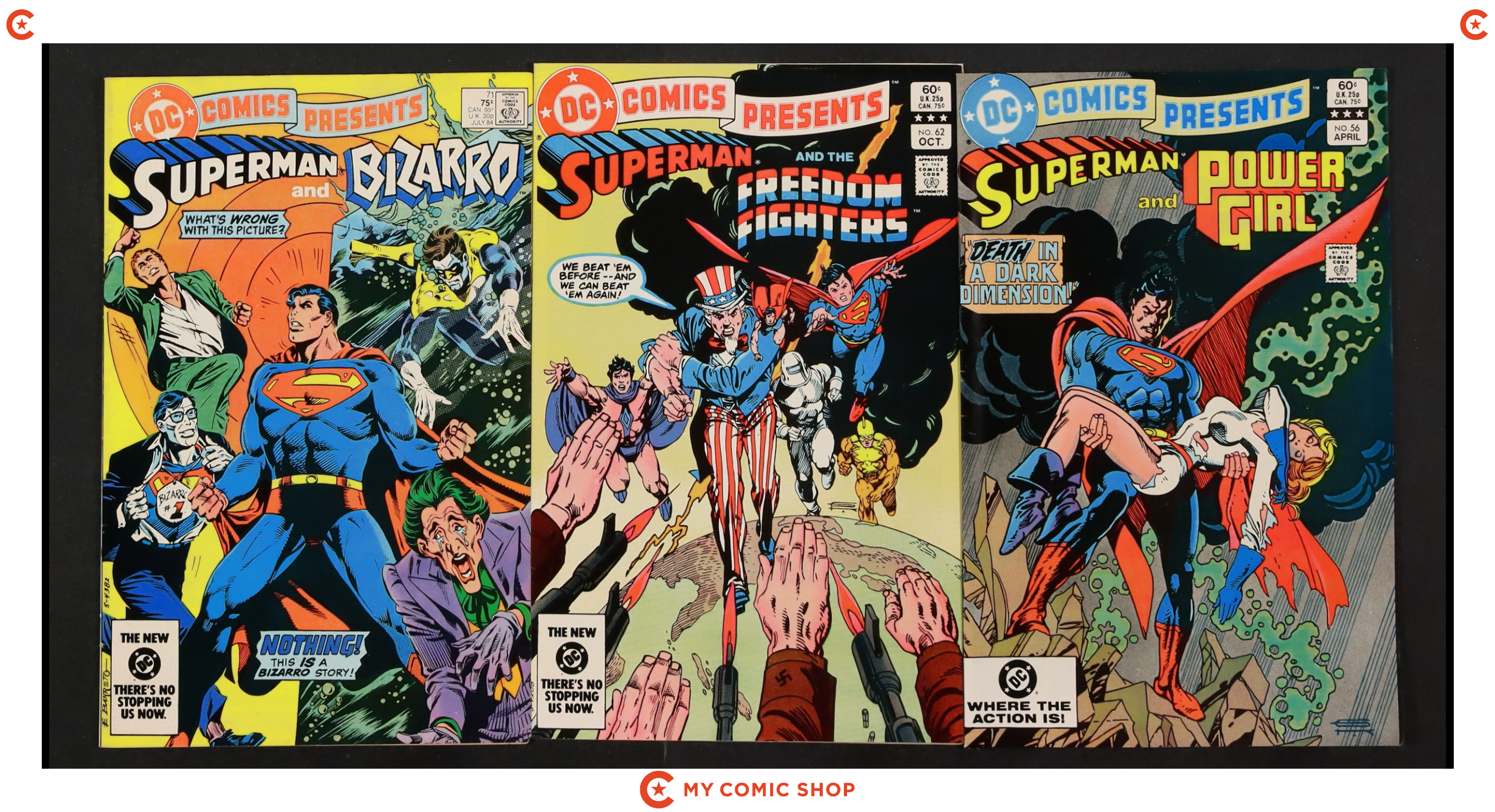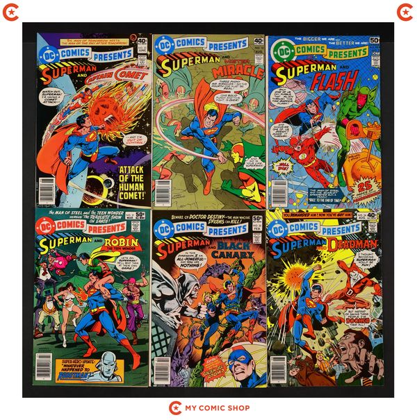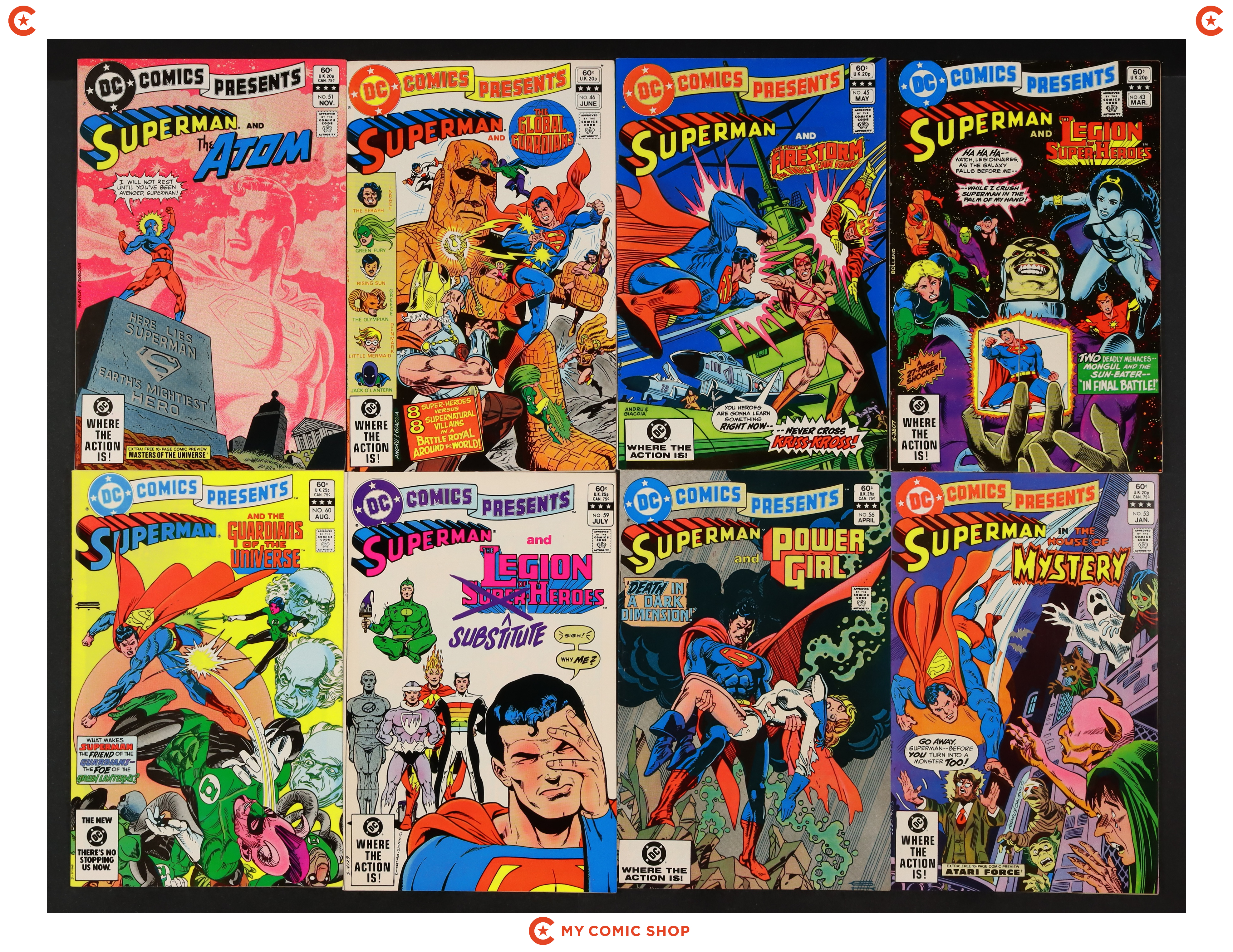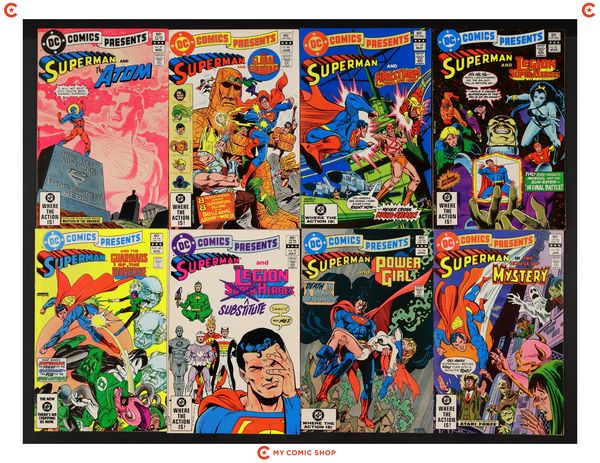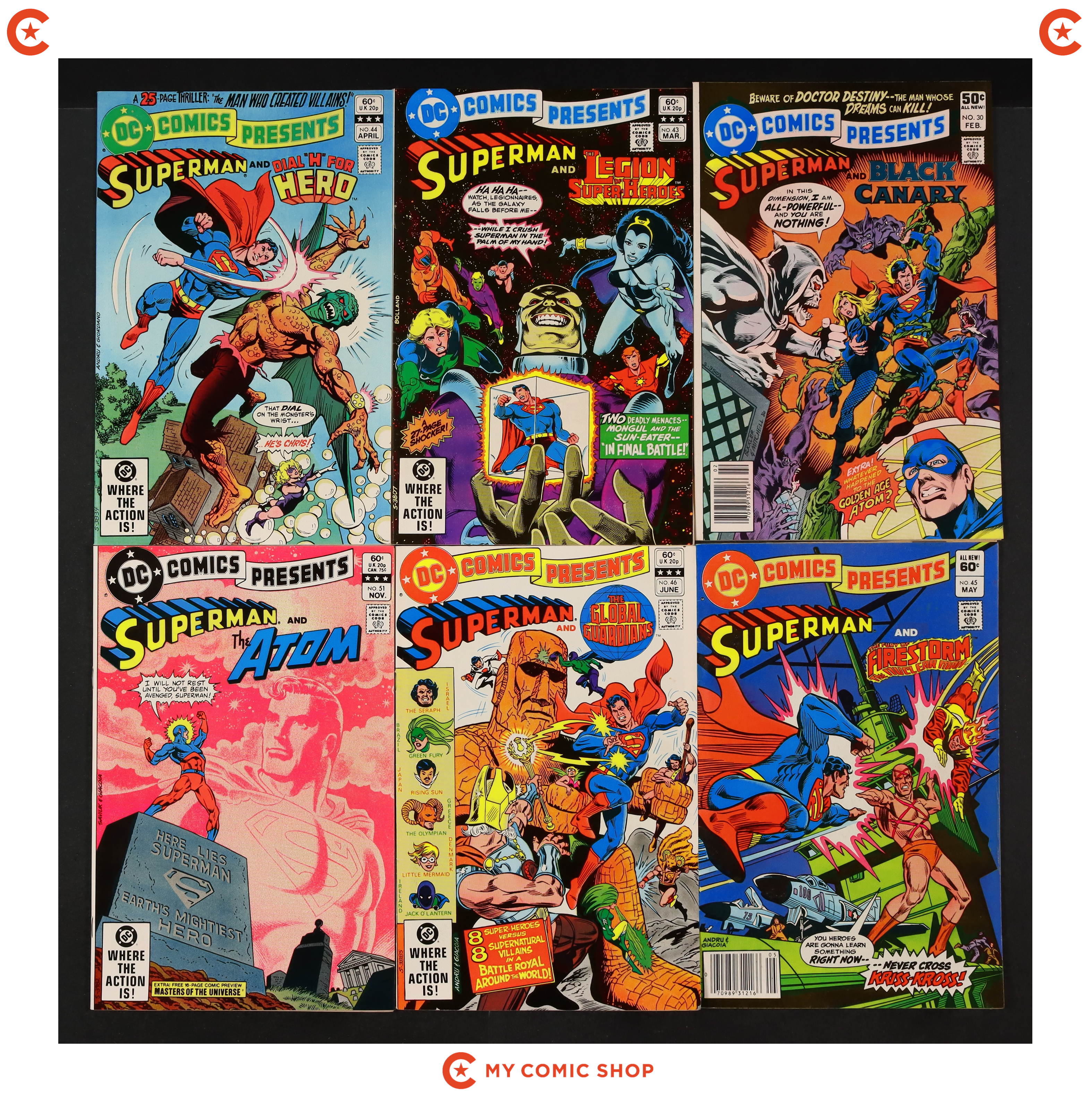 Issues 30N, 43, 44D, 45, 46, 51, 56, 62, 71 of DC Comics Presents (1978 DC). Most will grade in the VG to FN range with #43 grading VF.