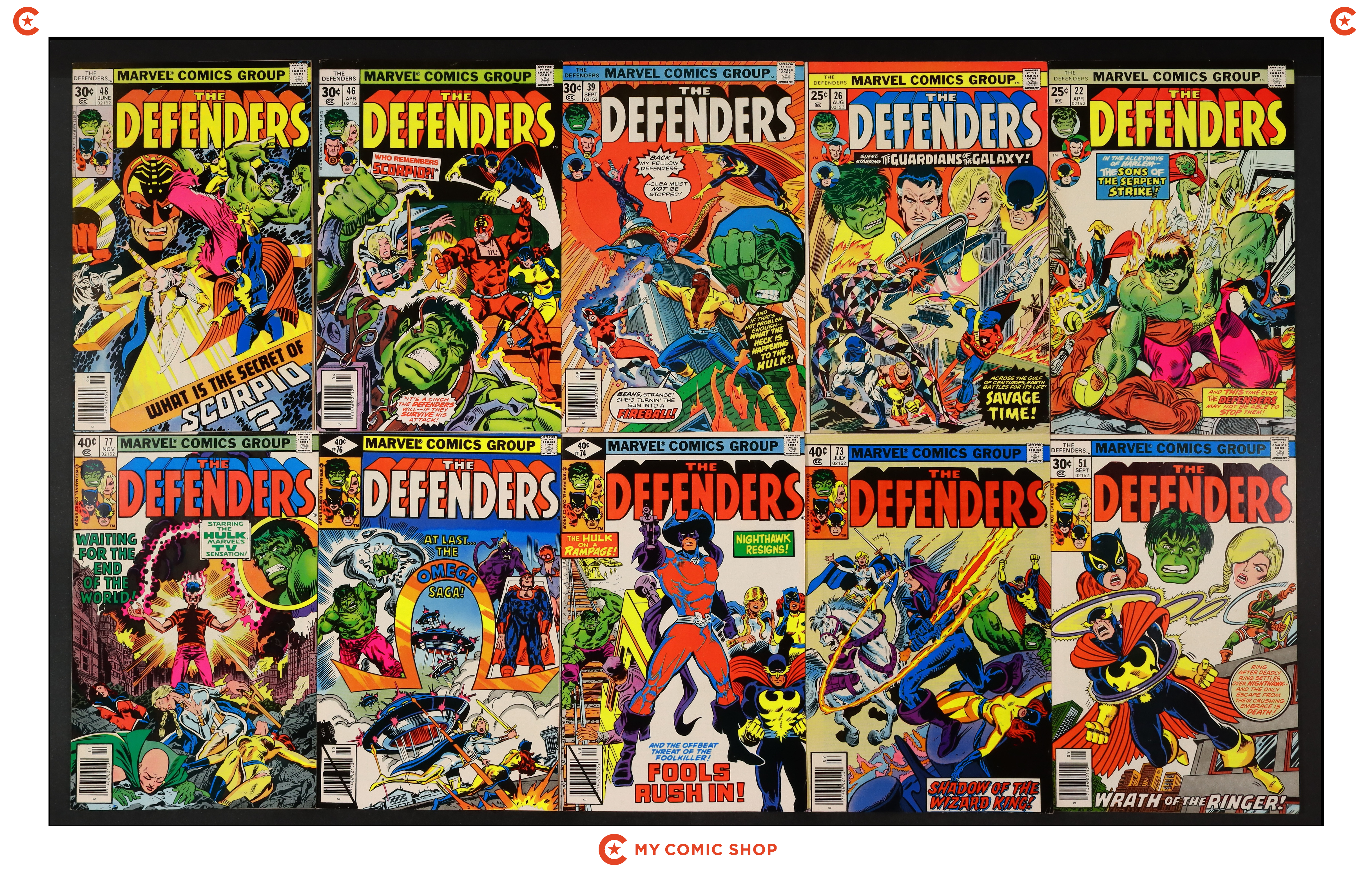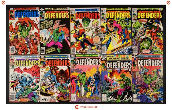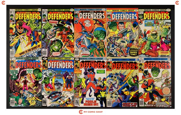 Issues 22, 26, 39, 46, 48, 51, 73, 74, 76D, 77N of Defenders (1972 1st Series). Most will grade in the FN to VF range.