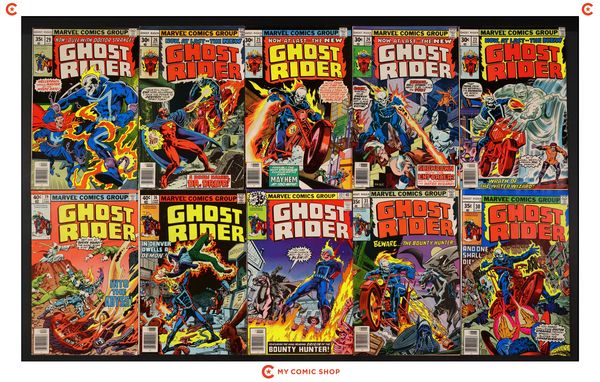 Issues 4, 6, 7, 9, 10, 14, 15, 24, 28, and 76 of Ghost Rider (1973 1st Series). Most will grade in the FN to VG range with a couple grading GD.