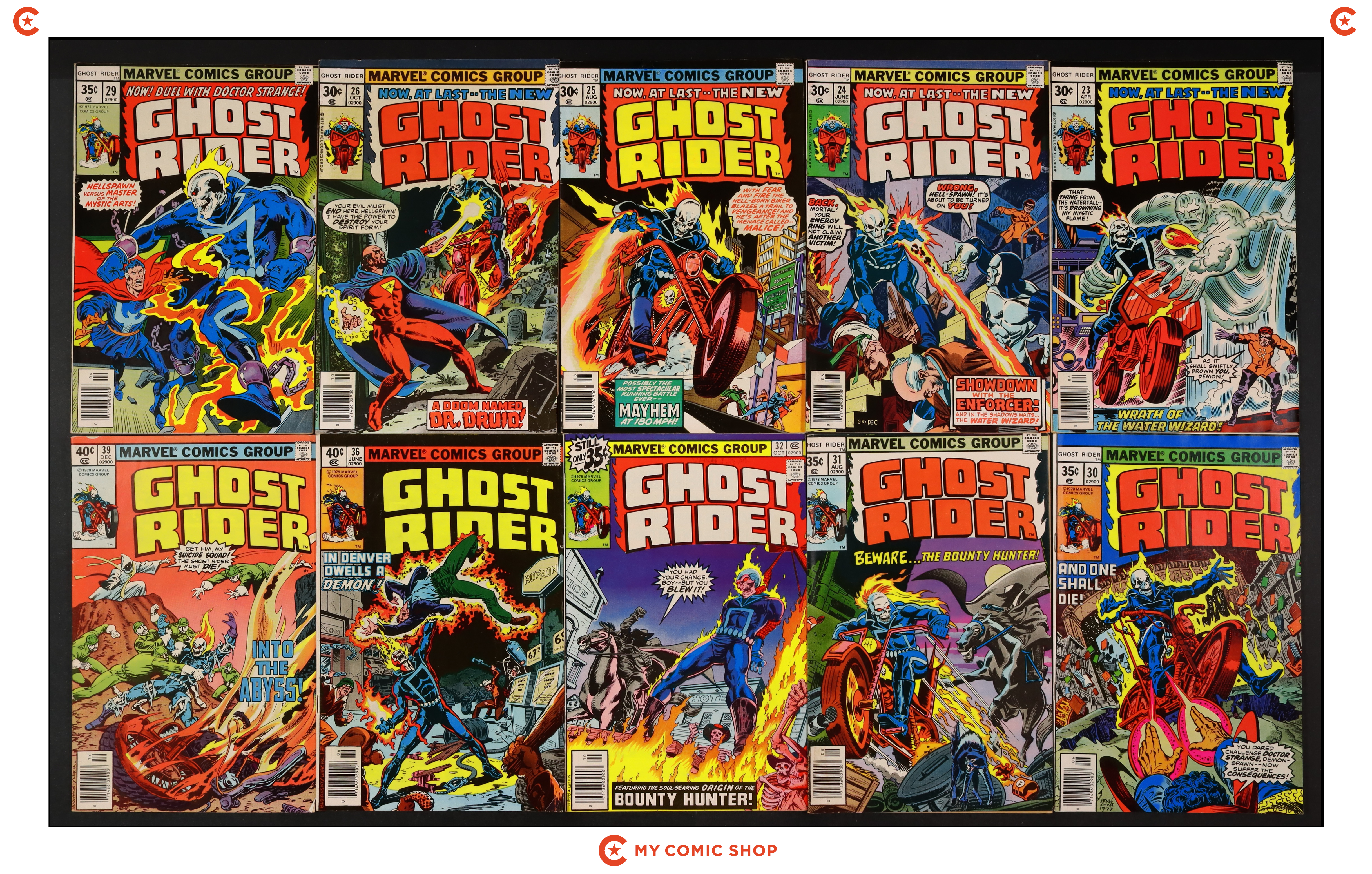 Issues 23-26, 29-32, 36N, and 39 of Ghost Rider (1973 1st Series). Most will grade in the FN range with a few grading VG.