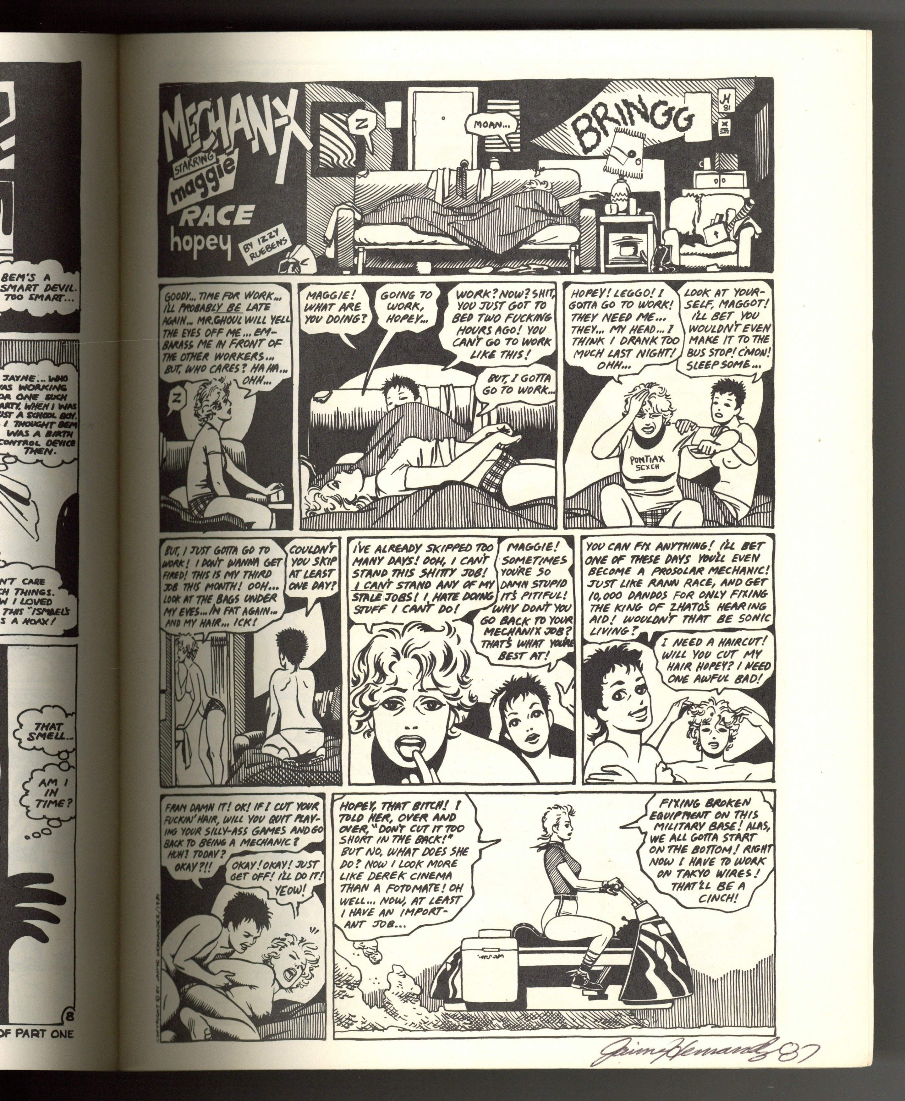 Starts Feb 2 Cover art by Jaime Hernandez. Untitled story, script and art by Jaime Hernandez; Maggie and Hopey hit the thrift stores, then trail around town trying to find a new place to live; Terry is cold on the idea of putting Maggie up; Maggie heads back to Izzy's to get ready for work, and hears from Izzy how Hopey took the (misreported) news of Maggie's death in Chepan. "Boys Will Be Boys," script and art by Gilbert Hernandez; Heraclio and Pepo try to fix newcomer Anacleto up with one of the women of Palomar. Lloyd Llewellyn character profile by Daniel Clowes. Untitled Lloyd Llewellyn story, script and art by Daniel Clowes; Irving Melvin plays his last practical joke. One-page La Toña story, script and art by Jaime Hernandez. "Young Locas," script and art by Jaime Hernandez; Maggie is planning on leaving Sal's Garage because her job there is causing her to lose her friends; She forgets all about it when Harvey introduces her to her first pro-solar job. "An American in Palomar," script by Gilbert Hernandez, art by Gilbert Hernandez; Howard Miller walks the streets of Palomar photographing its citizens; He has an encounter with Tonantzin, who gets the idea he can help her get noticed by Hollywood. Joint letter to the editor from comic book creators Adam Philips and Kurt Busiek. 1st printing (2nd to 5th printings exist for most issues in this series). Mature readers. 44 pgs., B&W. Cover price $2.25.