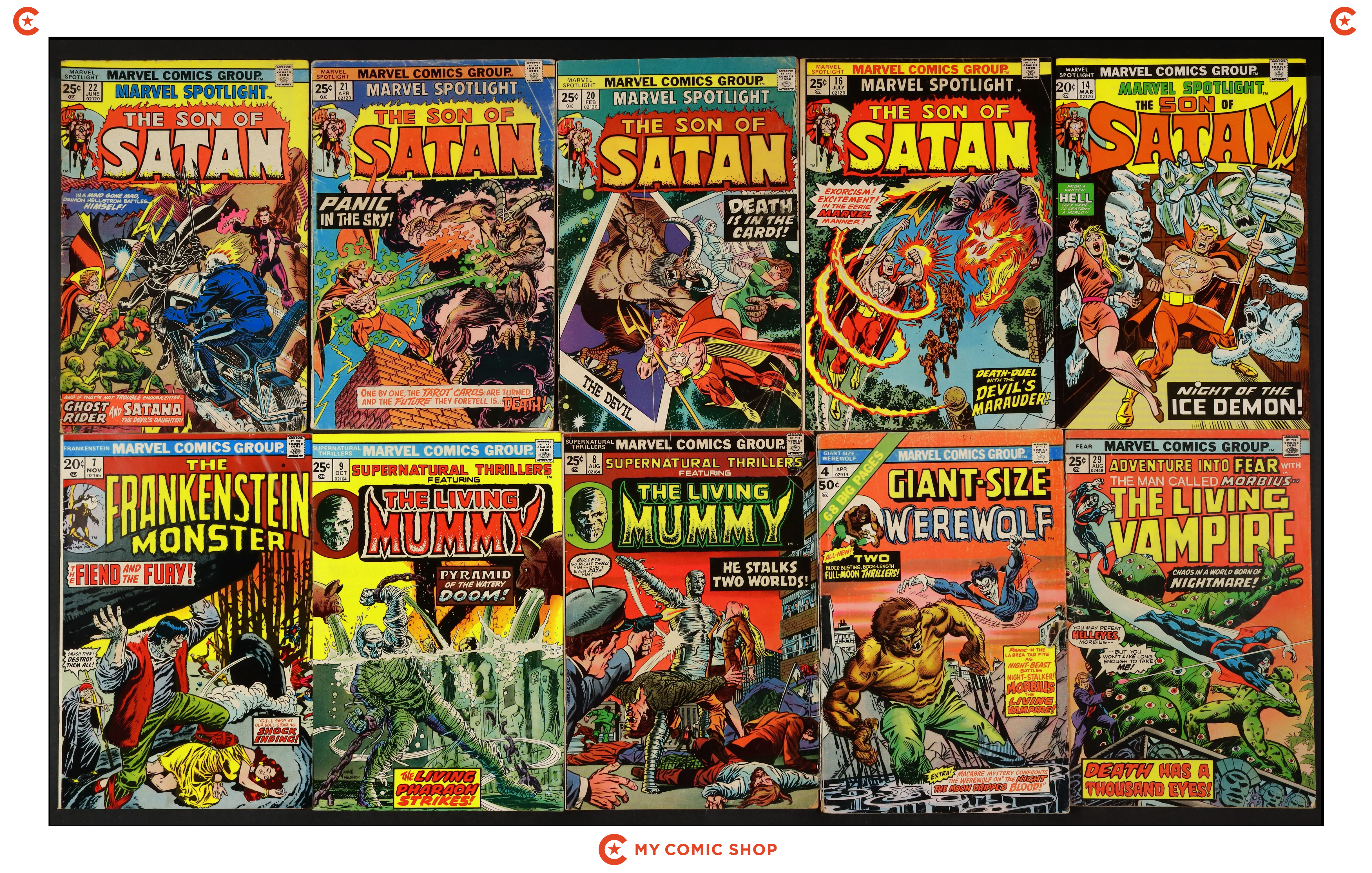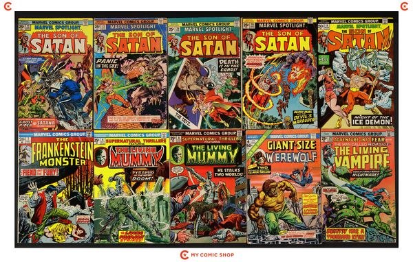 Issues 14, 16, 20-22 of Marvel Spotlight (1971 1st Series); 29 of Fear (1970 Marvel); 4 of Giant Size Werewolf (1974); 8 and 9 of Supernatural Thrillers (1972); and 7 of Frankenstein (1973 Marvel). Most will grade in the VG to GD range with #21 of Marvel Spotlight grading PR (centerfold missing, affects story and art), and #8 of Supernatural Thrillers grading FR (missing Marvel Value Stamp).