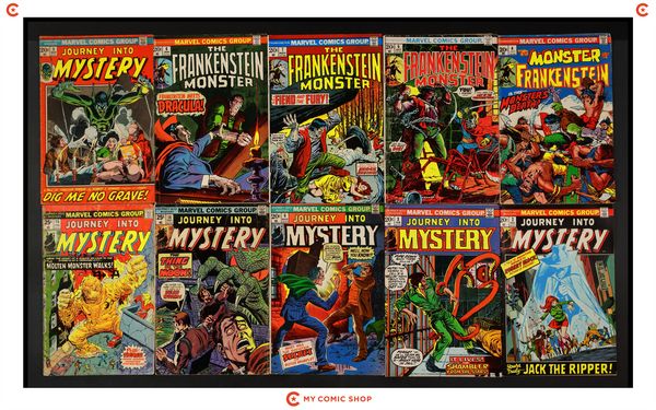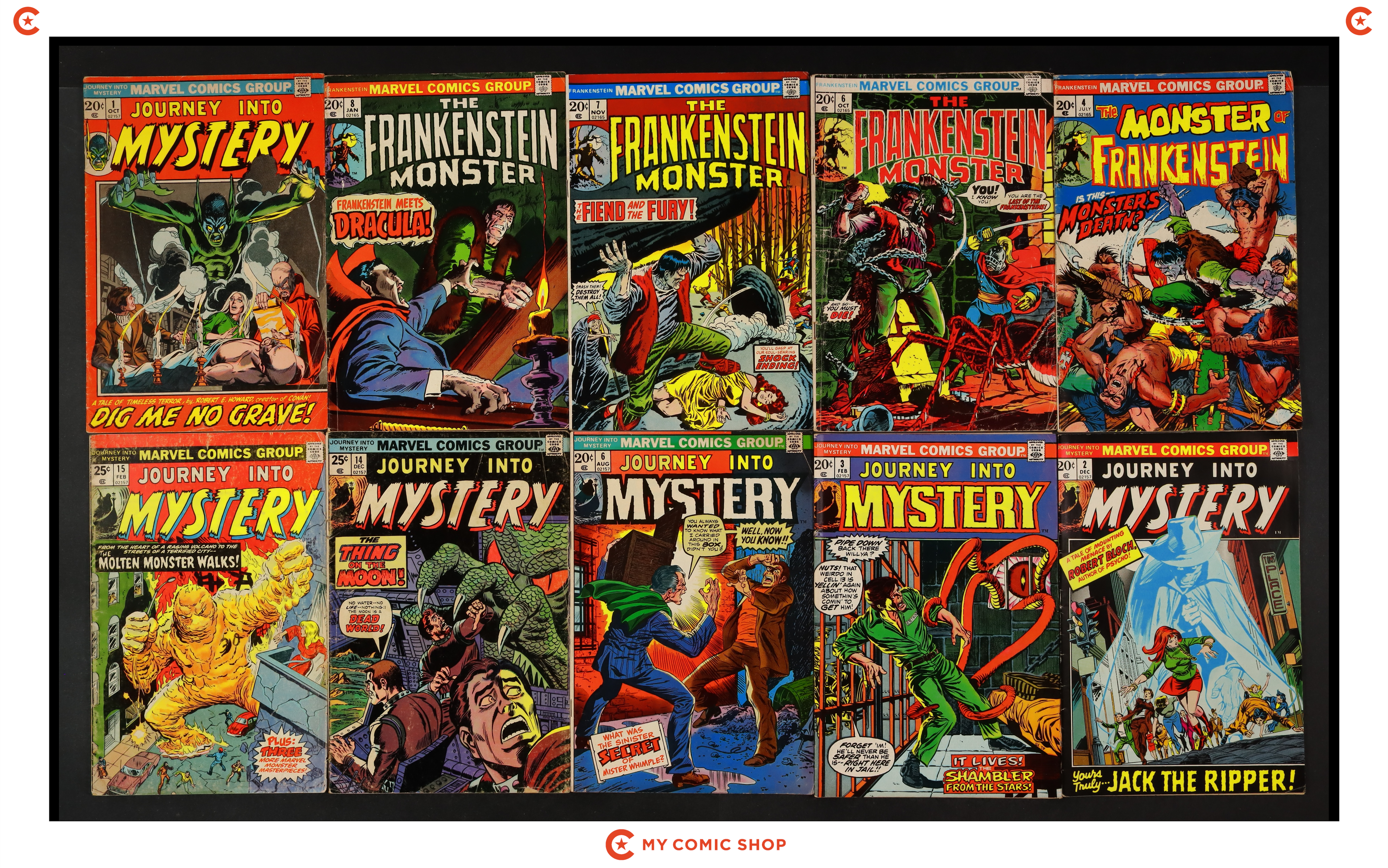 Issues 4 and 6-8 of Frankenstein (1973 Marvel); and 1-3, 6, 14, and 15 of Journey into Mystery (1972 2nd series). Most will grade in the FN to VG range with a couple grading closer to GD.