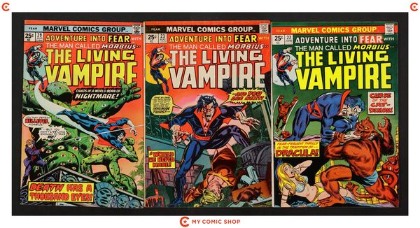Issues 2, 4, and 5 of Giant Size Dracula (1974); 53 of Tomb of Dracula (1972 1st Series); 4 of Giant Size Werewolf (1974); 1 and 3 of Fear (1970 Marvel); and 21-23 and 29 of Fear (1970 Marvel). Most will grade in the VG range with a couple grading GD.