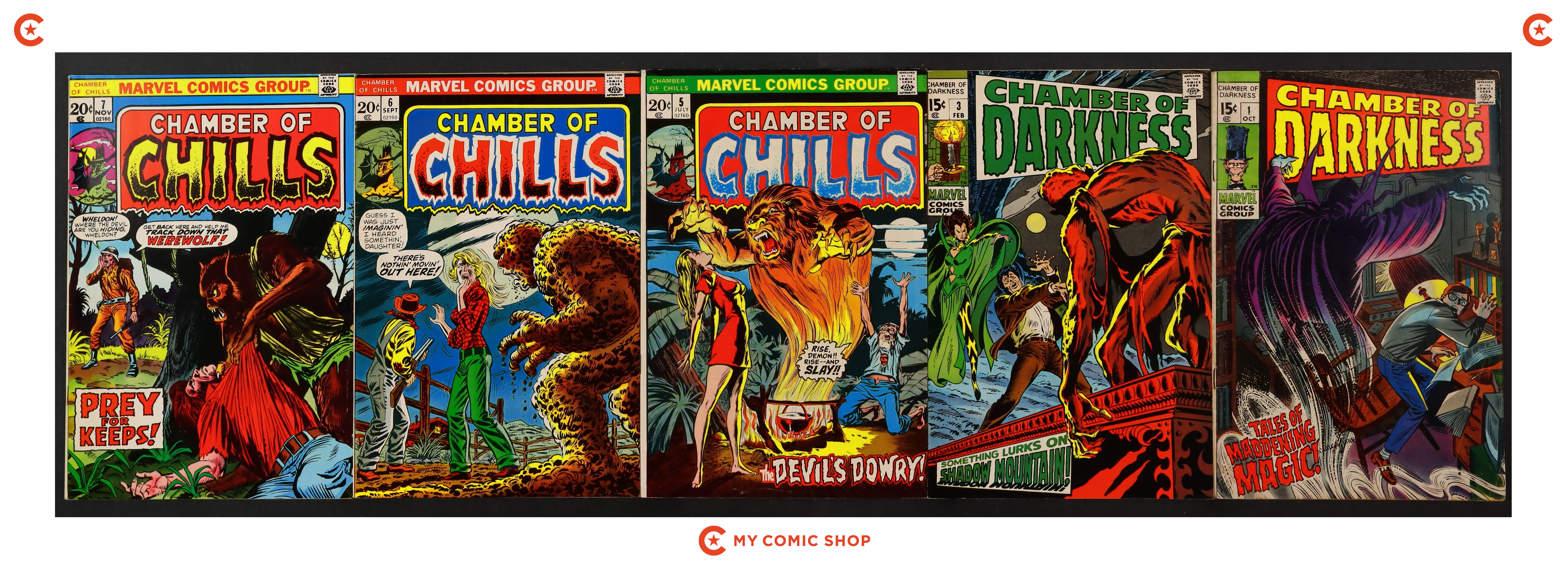 Issues 1 and 3 of Chamber of Darkness (1969 Marvel); and 5-7 of Chamber of Chills (1972 Marvel). Most will grade in the FN range with #1 of Chamber of Darkness grading VG.