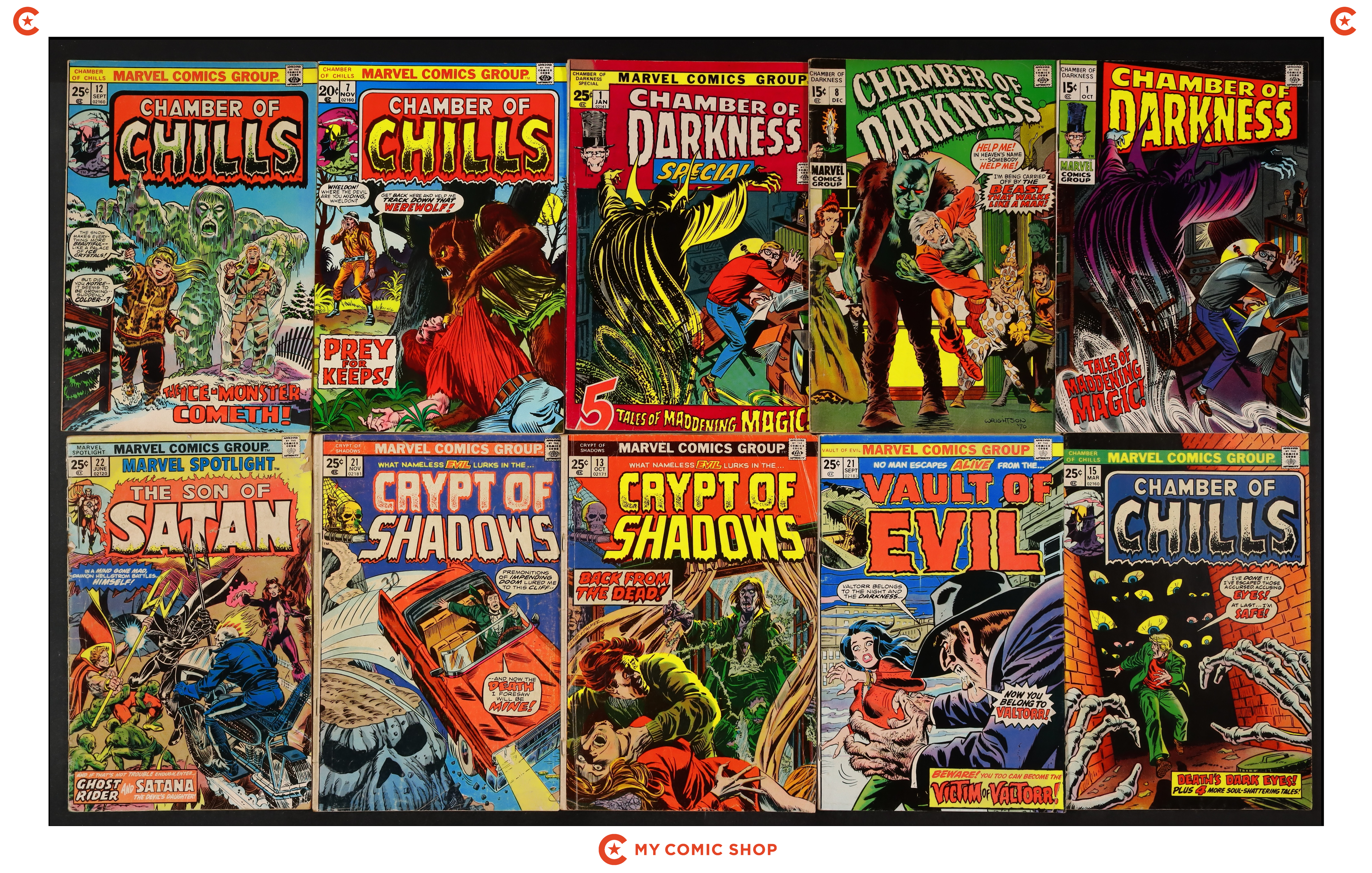 Issues 1 and 8 of Chamber of Darkness (1969 Marvel); 1 of Chamber of Darkness Special (1972); 7, 12, and 15 of Chamber of Chills (1972 Marvel); 21 of Vault of Evil (1973-1975 Marvel); 13 and 21 of Crypt of Shadows (1973); and 22 of Marvel Spotlight (1971 1st Series). Most will grade in the VG to GD range with #22 of Marvel Spotlight grading PR (page missing, affect story and art).