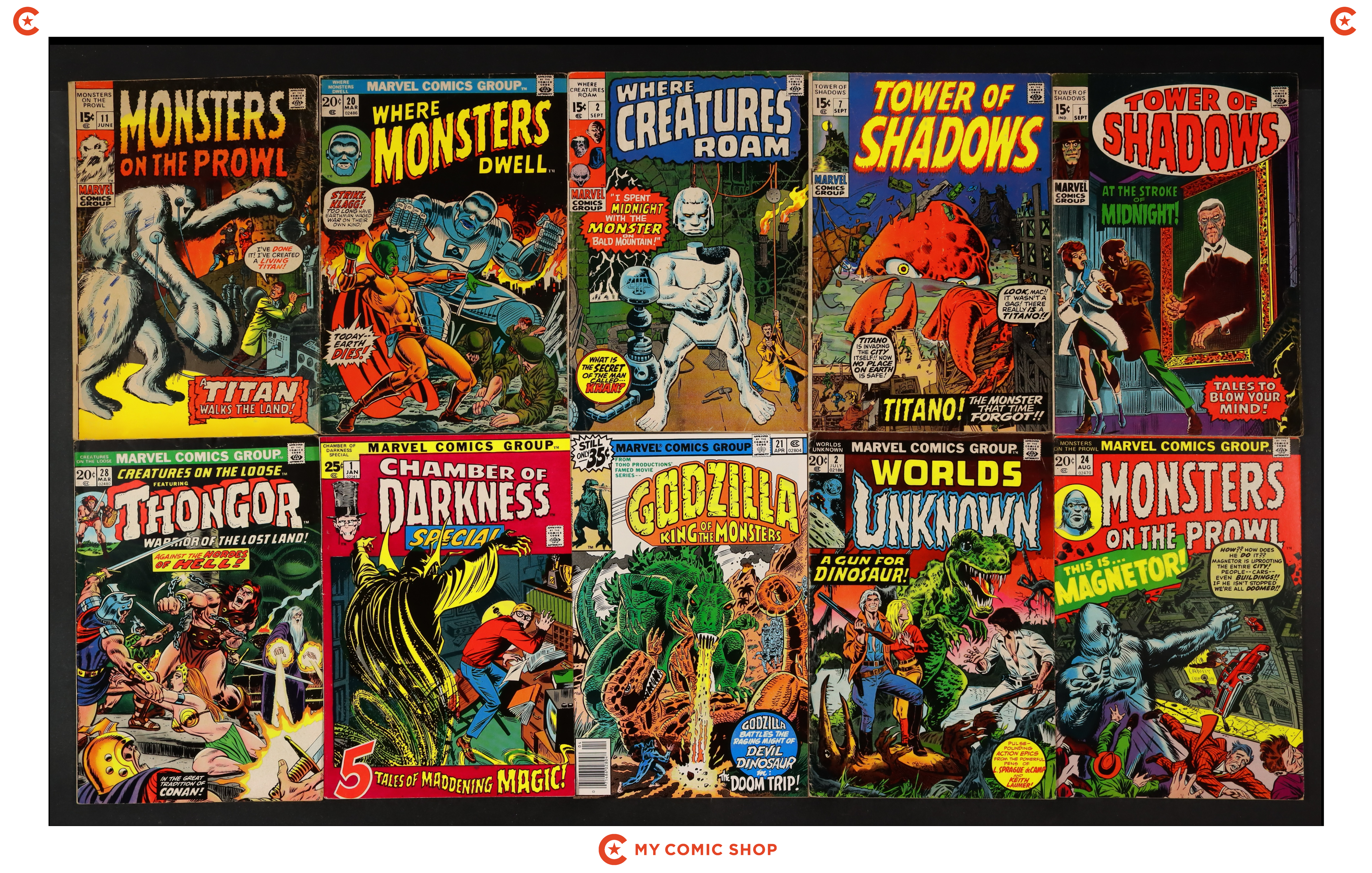 Issues 1 and 7 of Tower of Shadows (1969); 2 of Where Creatures Roam (1970); 20 of Where Monsters Dwell (1970); 11 and 24 of Monsters on the Prowl (1971); 2 of Worlds Unknown (1973 Marvel); 21 of Godzilla (1977 Marvel); 1 of Chamber of Darkness Special (1972); and 28 of Creatures on the Loose (1971). Most will grade in the VG to GD range with a couple grading FN.