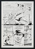 A great big action page that sees Martian Manhunter heading back towards the flying saucer he damaged in order to stop it from crashing into an abandoned house where children were (unwisely!) trying to observe the battle. Pencil and ink on DC Comics art board. 11 1/2" x 16 1/2".