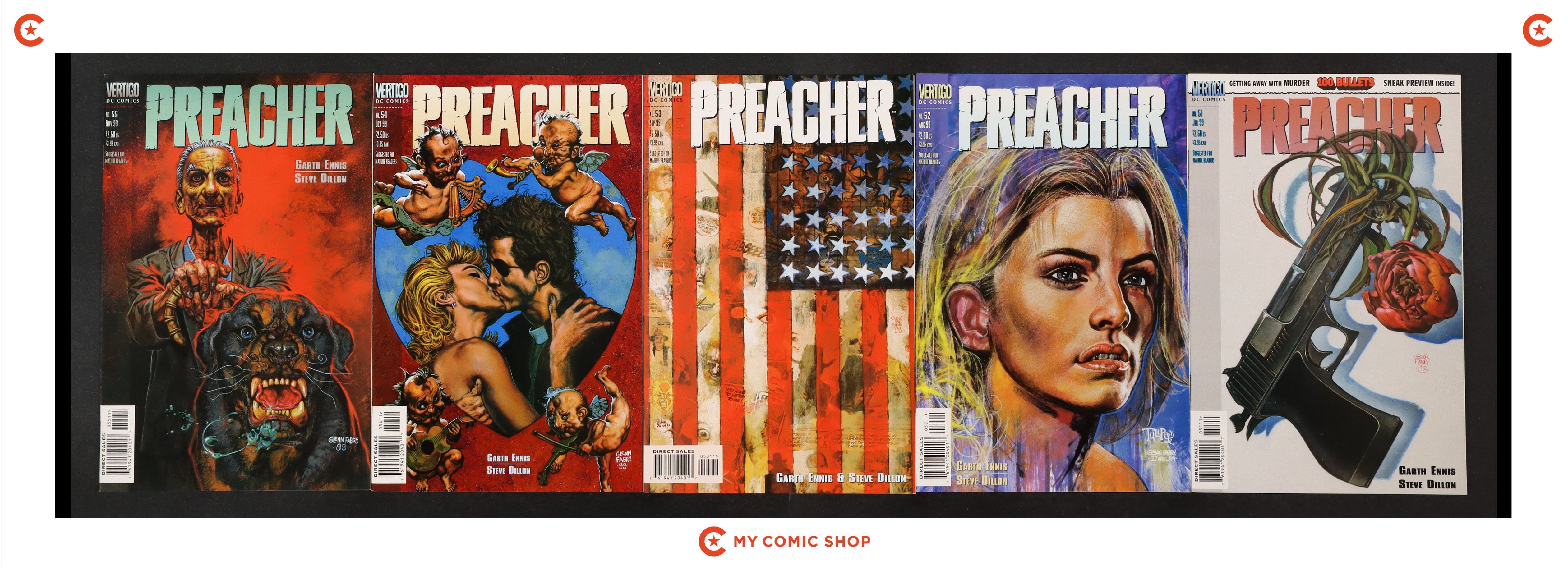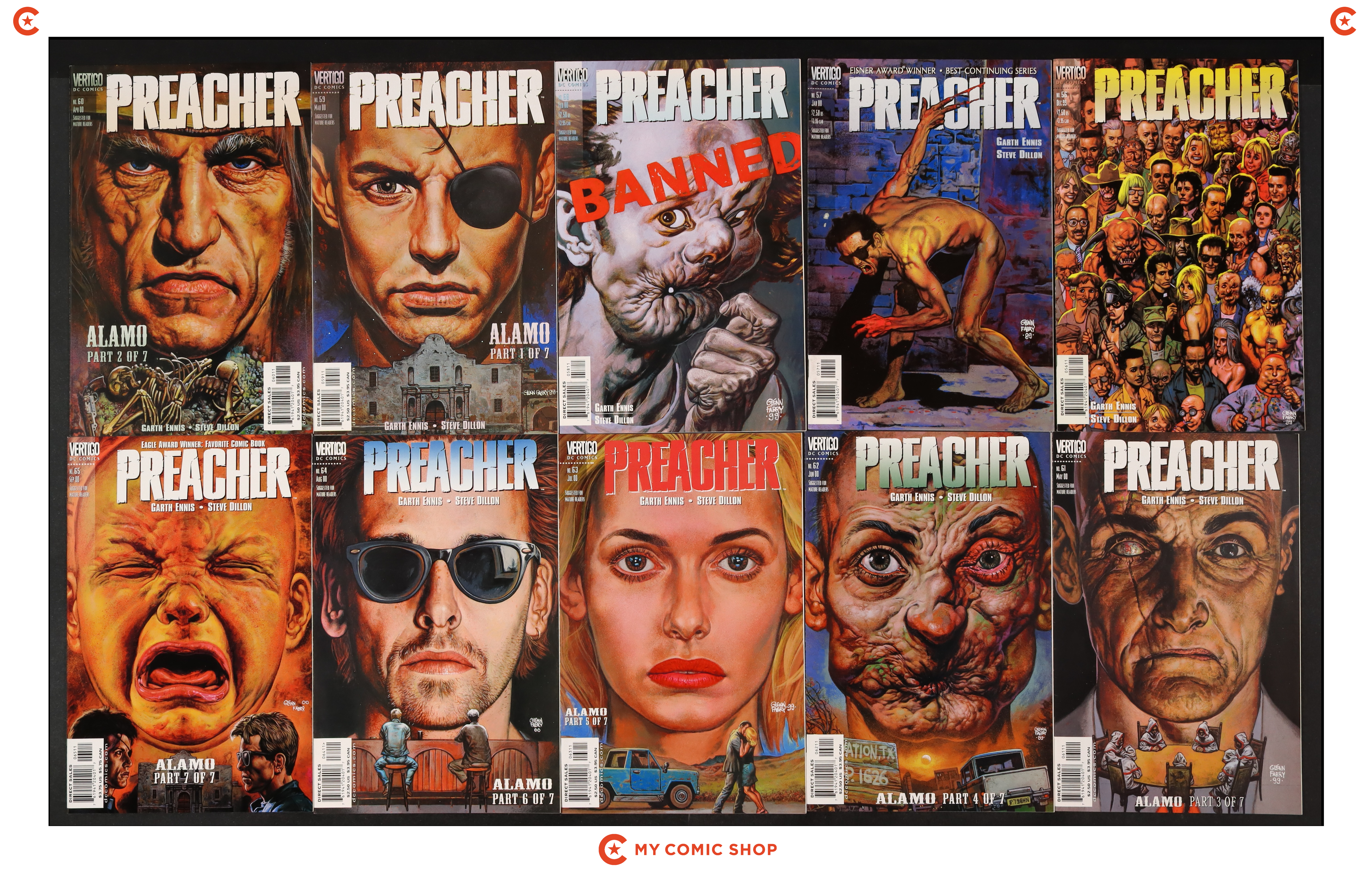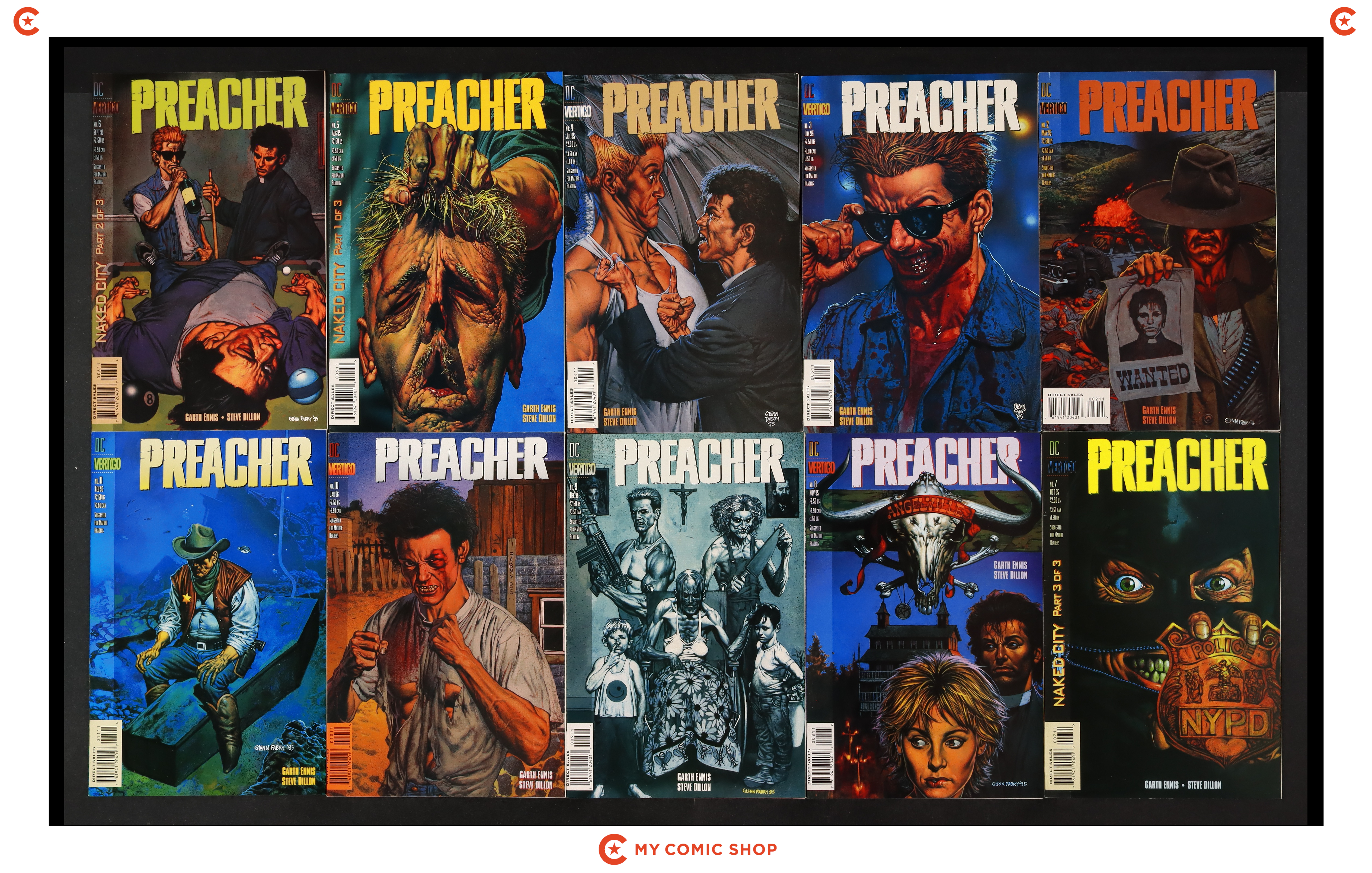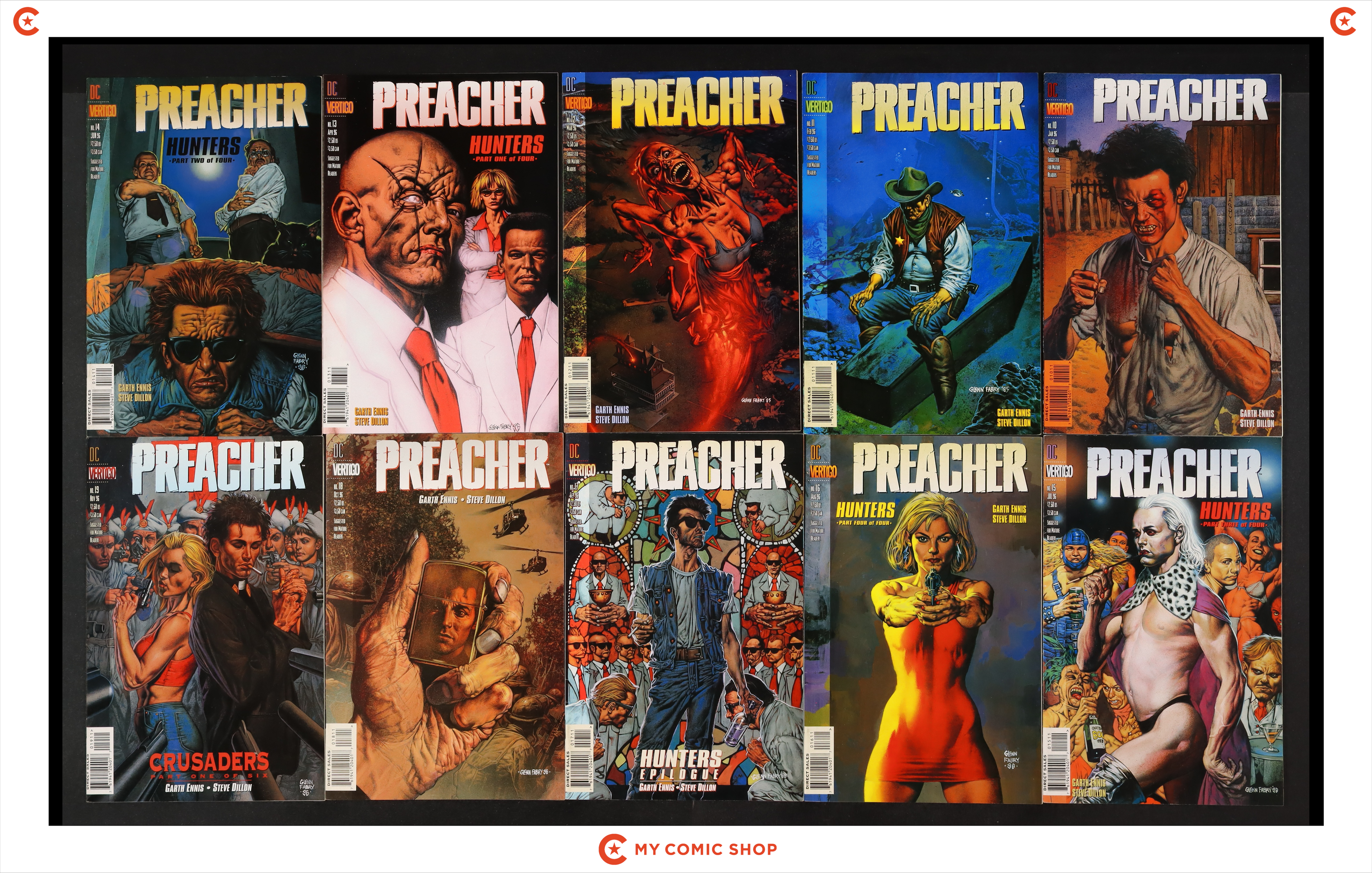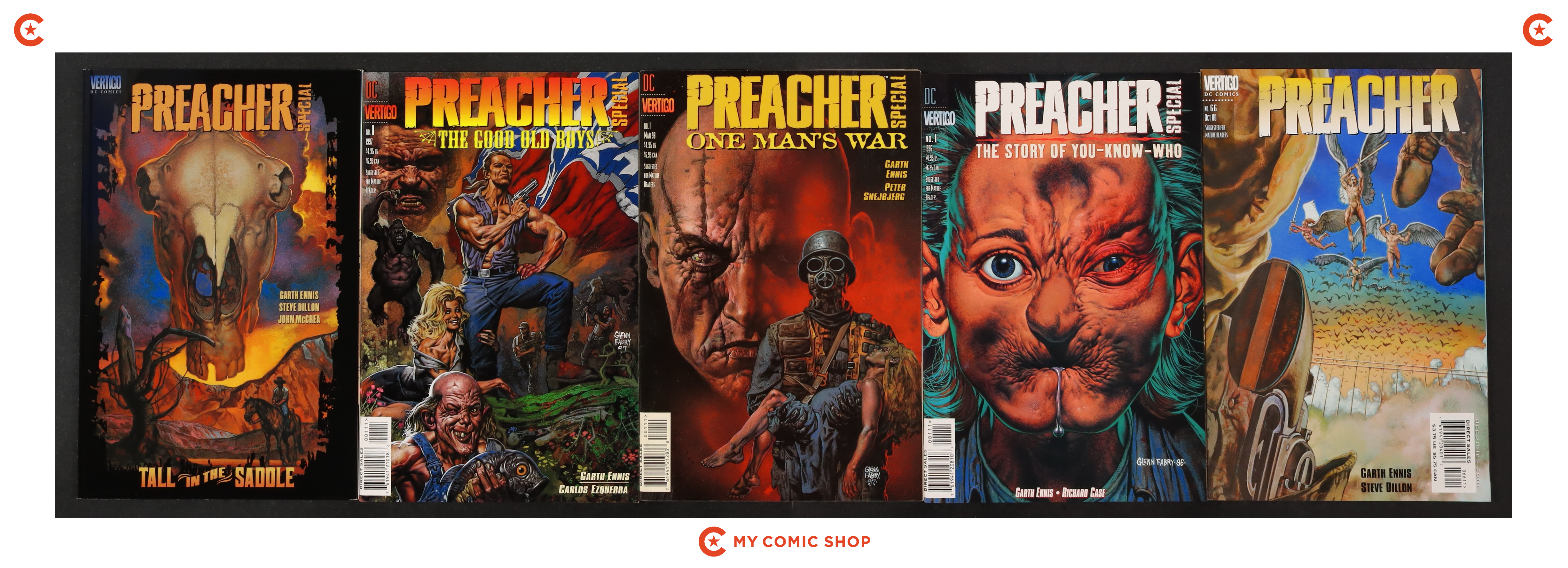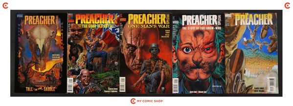 Issues 56-66 of Preacher (1995); 1 of Preacher Special The Story of You Know Who (1996); 1 of Preacher Special One Man's War (1998); 1 of Preacher Special The Good Old Boys (1997); and 1 of Preacher Special Tall in the Saddle (2000). Most will grade in the VF range with a few grading FN.