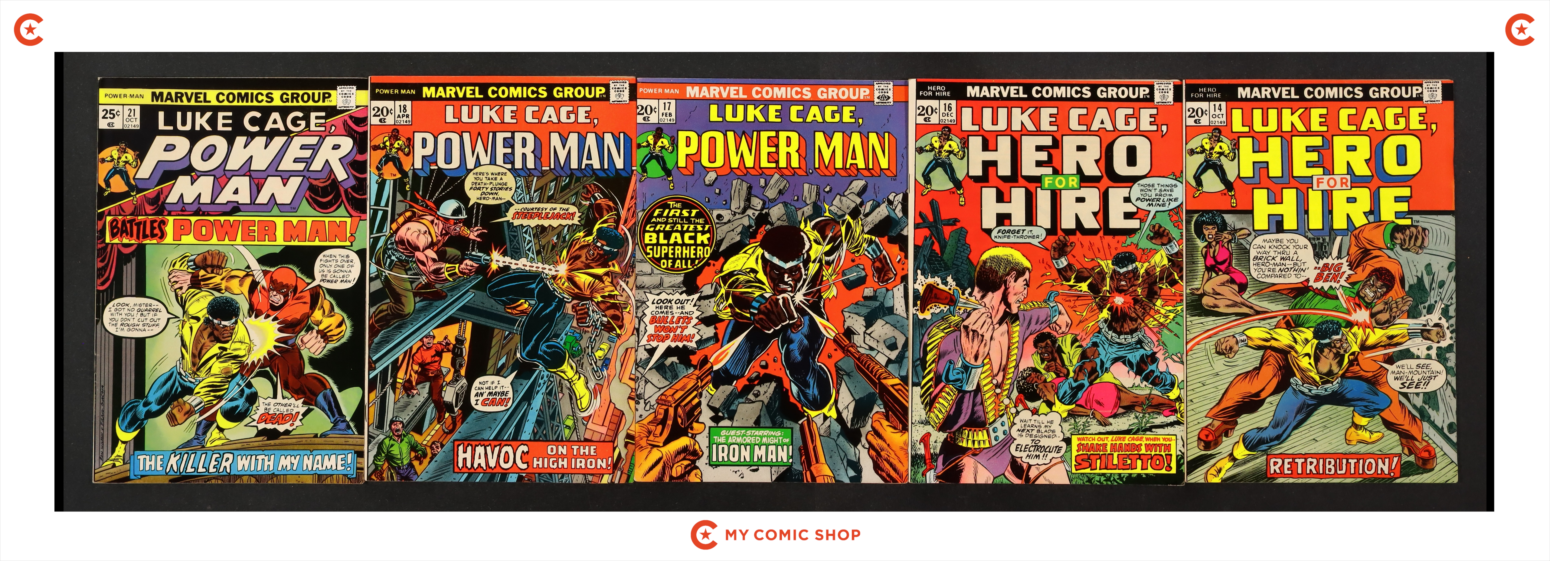 Issues 14, 16, 17, 18, and 21 of Power Man and Iron Fist (1972 Hero for Hire). Most will grade in the VG to FN range.