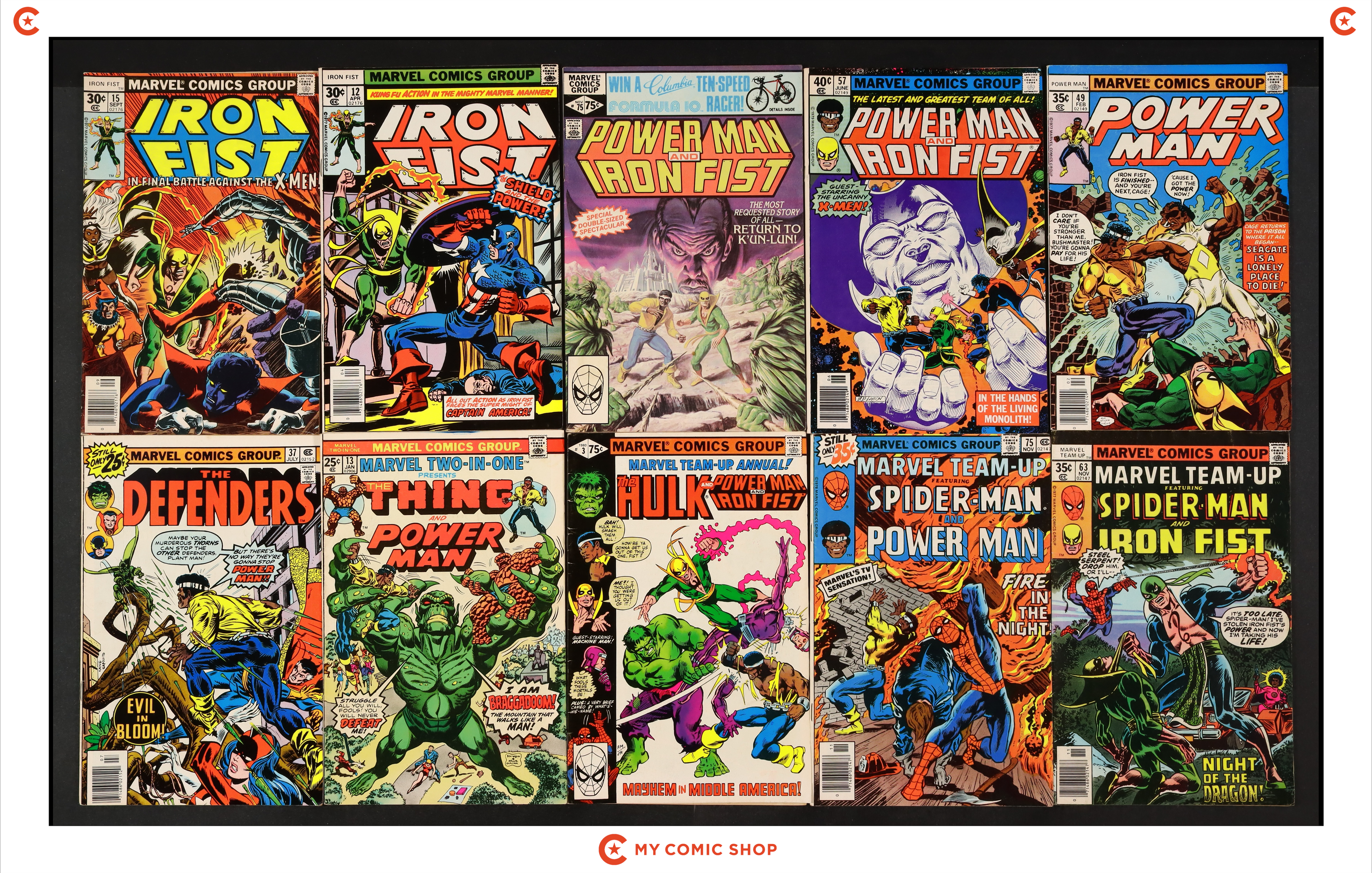 Issues 49, 57N, and 75 of Power Man and Iron Fist (1972 Hero for Hire); 12 and 15 of Iron Fist (1975 1st Series); 63 and 75 of Marvel Team-Up (1972 1st Series); 3 of Marvel Team-Up (1972 1st Series) Annual; 13 of Marvel Two-in-One (1974 1st Series); and 37 of Defenders (1972 1st Series). Most will grade in the FN range with a few grading VG.