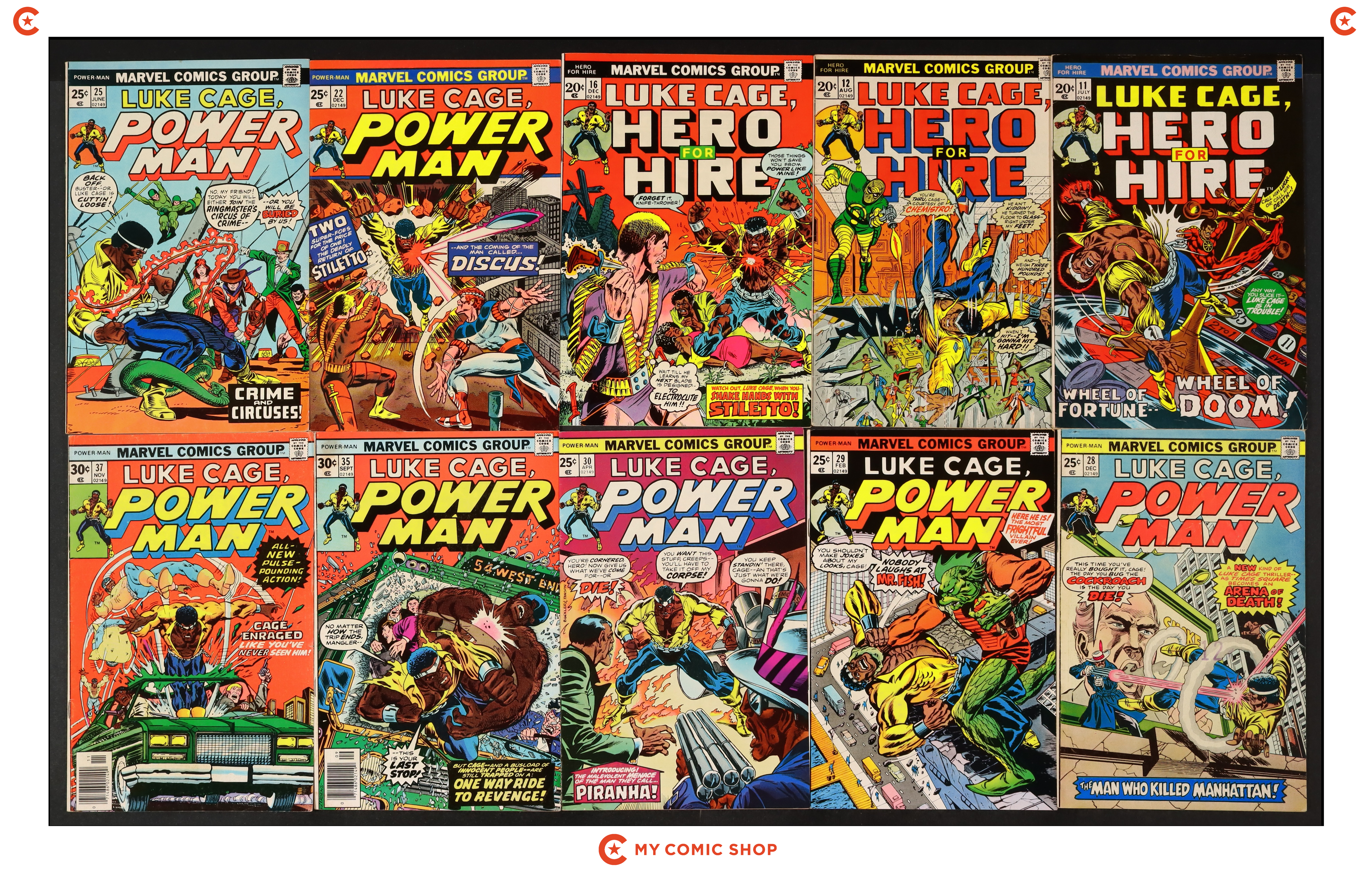 Issues 11, 12, 16, 22, 25, 28-30, 35, and 37 of Power Man and Iron Fist (1972 Hero for Hire). Most will grade in the FN to VG range.