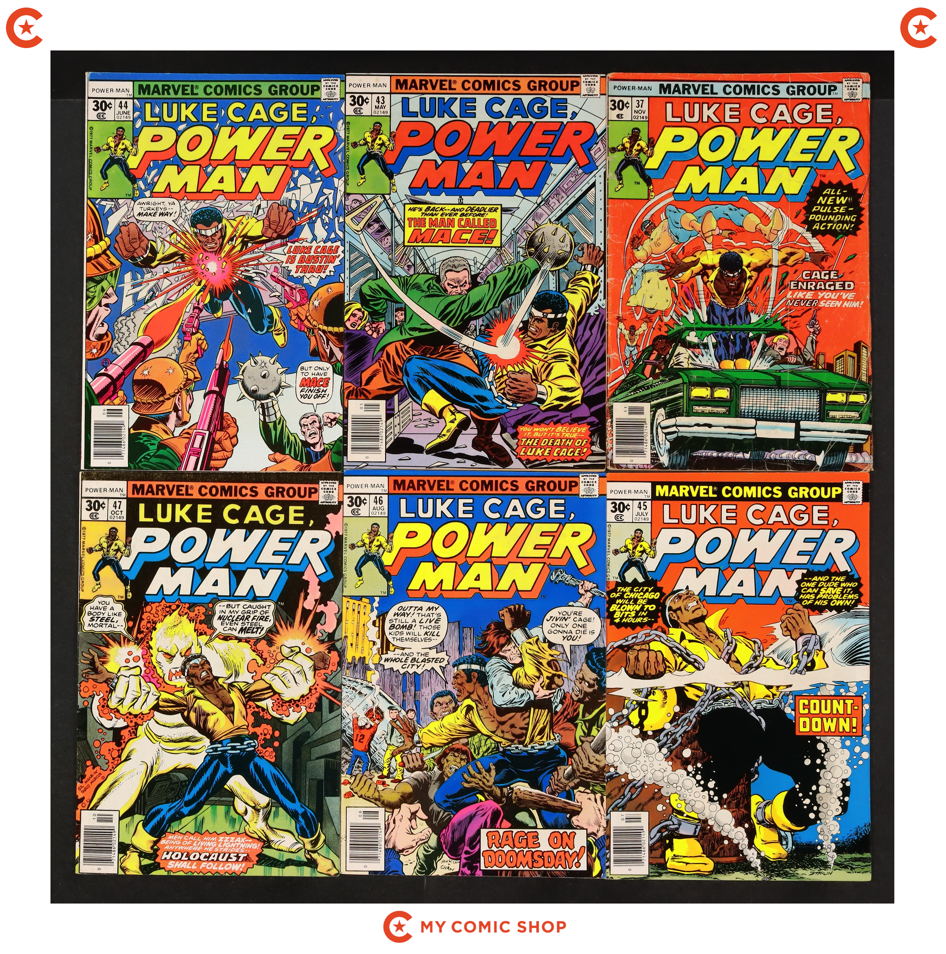 Issues 37, 43-48, 56, and 57 of Power Man and Iron Fist (1972 Hero for Hire). Most will grade in the FN range with a few grading VG and a couple grading GD.