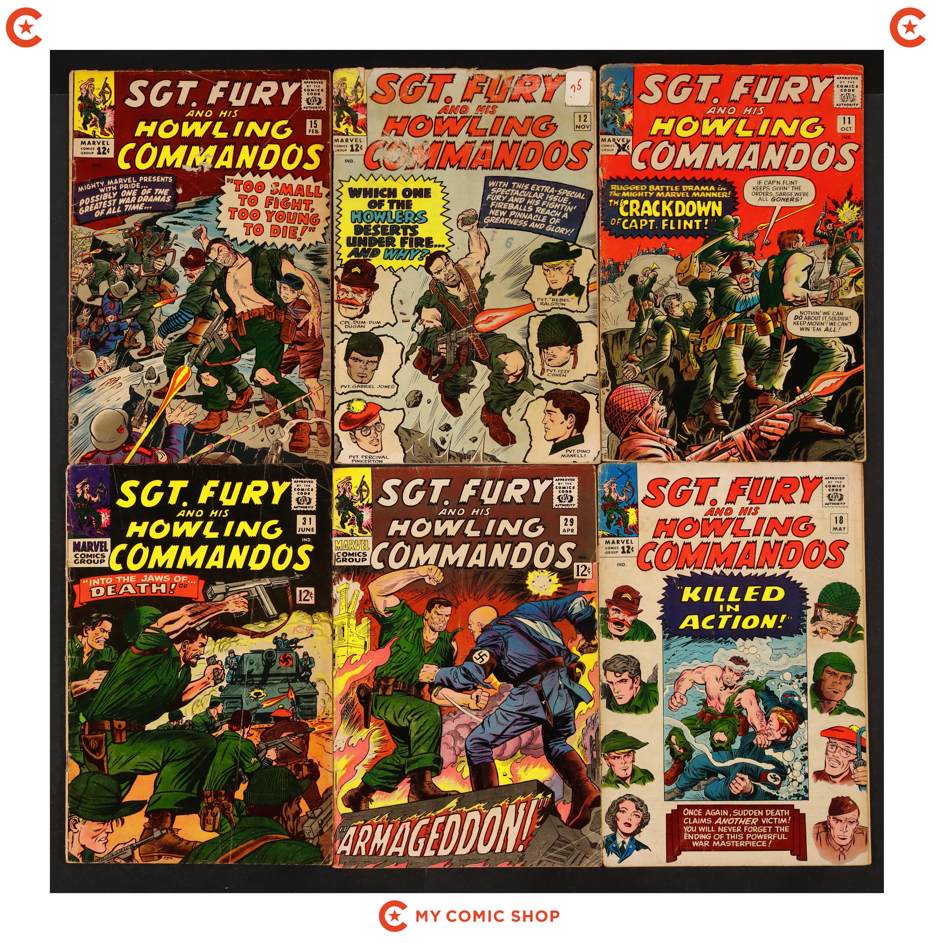 Issues 11, 12, 15, 18, 29, 31, 32, and 58 of Sgt. Fury (1963); and 5 of Sgt. Fury (1963) Annual. Most will grade in the GD range with #11 and #18 grading PR (both have pages missing, does not affect story or art).