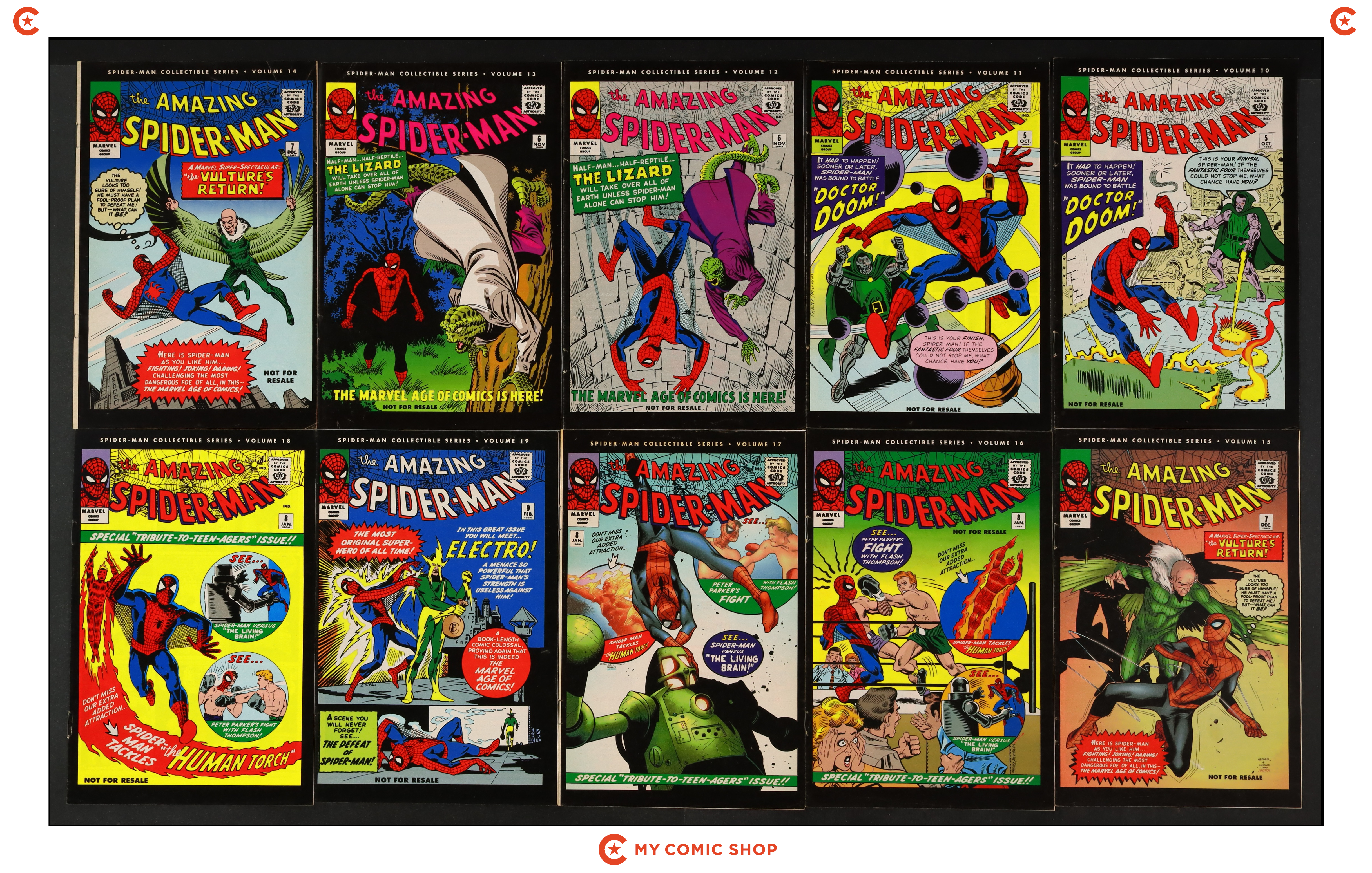 Issues 10, 11, 12, 13, 14, 15, 16, 17, 18, and 19 of Spider-Man Collectible Series (2006). Most will grade in the VG to FN range.