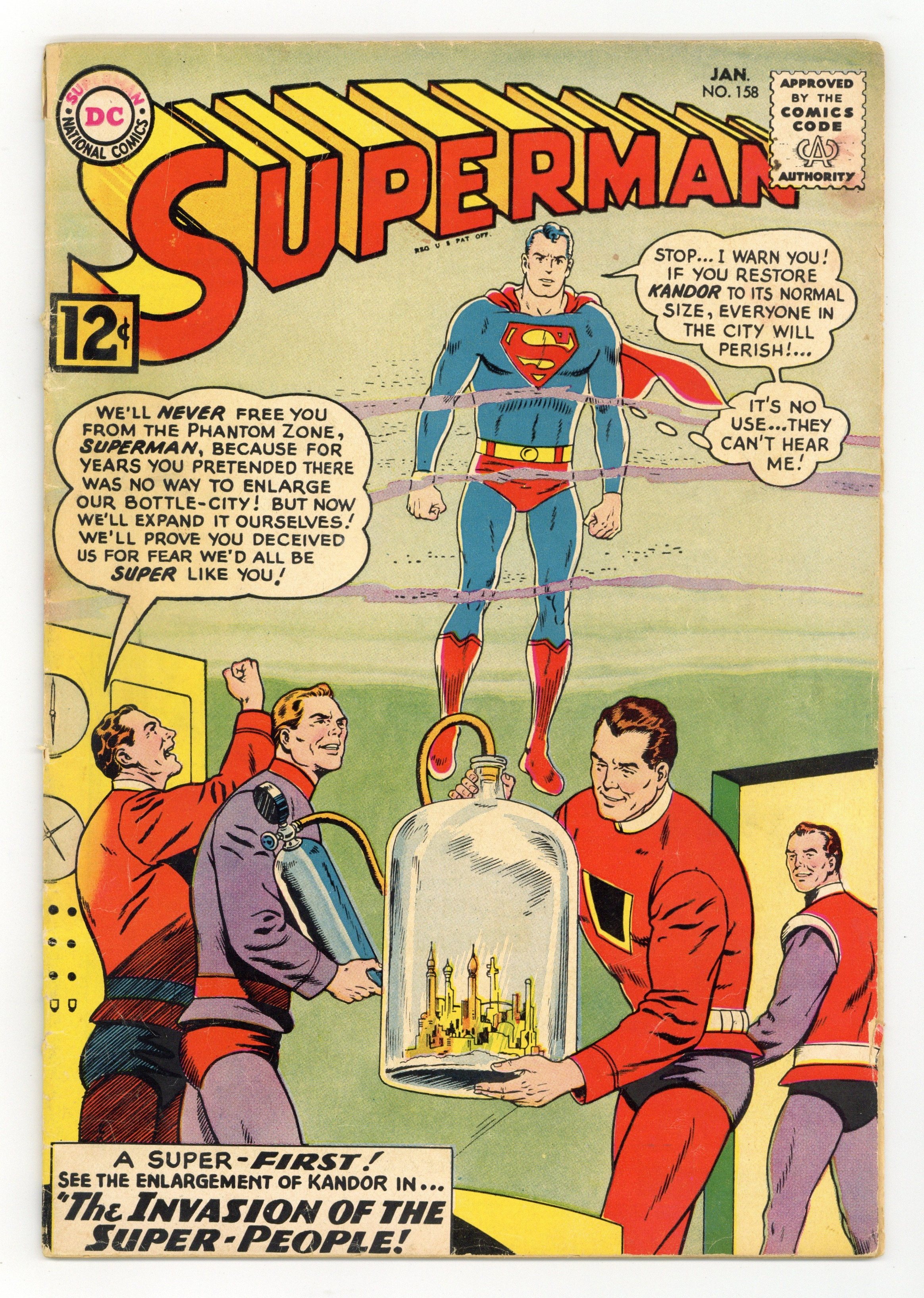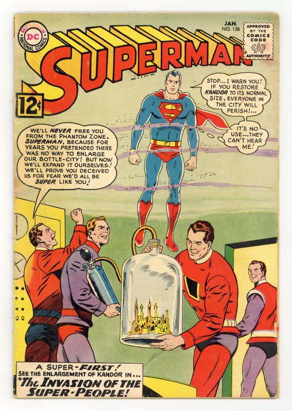 Starts Apr 27 Cover pencils by Curt Swan, inks by George Klein. First appearance of Flamebird and Nightwing in a full-length story: Invasion of the Mystery Super-Men! [Superman in Kandor part 1], script by Edmond Hamilton, pencils by Curt Swan, inks by George Klein; Superman and Jimmy Olsen travel to Kandor to discover how normal sized Kandorians are on Earth and why they are attacking Superman. The Dynamic Duo of Kandor! [Superman in Kandor part 2]; Superman and Jimmy Olsen take the secret identites of Nightwing and Flamebird so they can track down Than-Ol's raiders and stop his scheme to enlarge Kandor. The City of Super-People! [Superman in Kandor part 3]. 36 Pages, Full Color. Cover price $0.12.