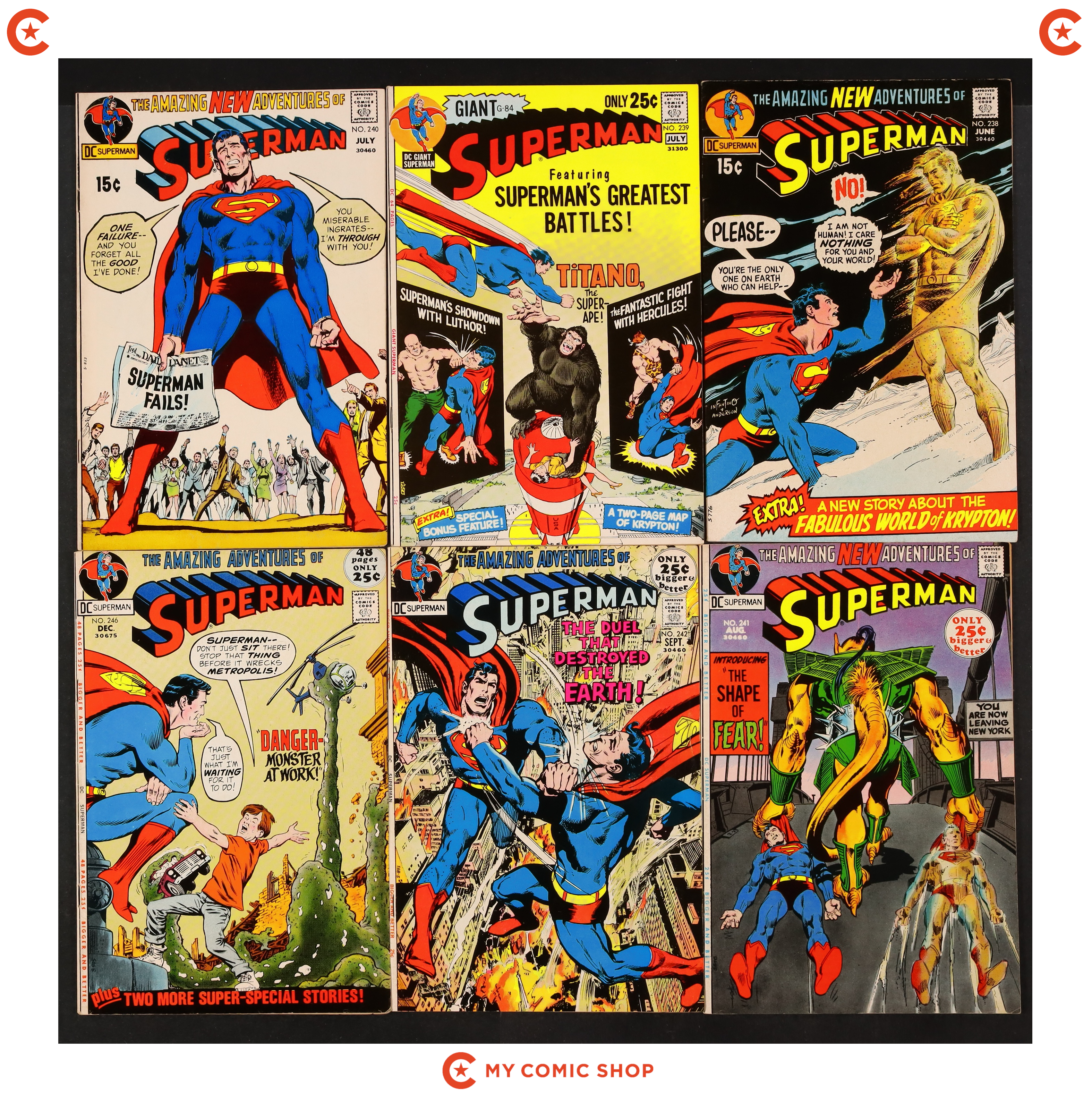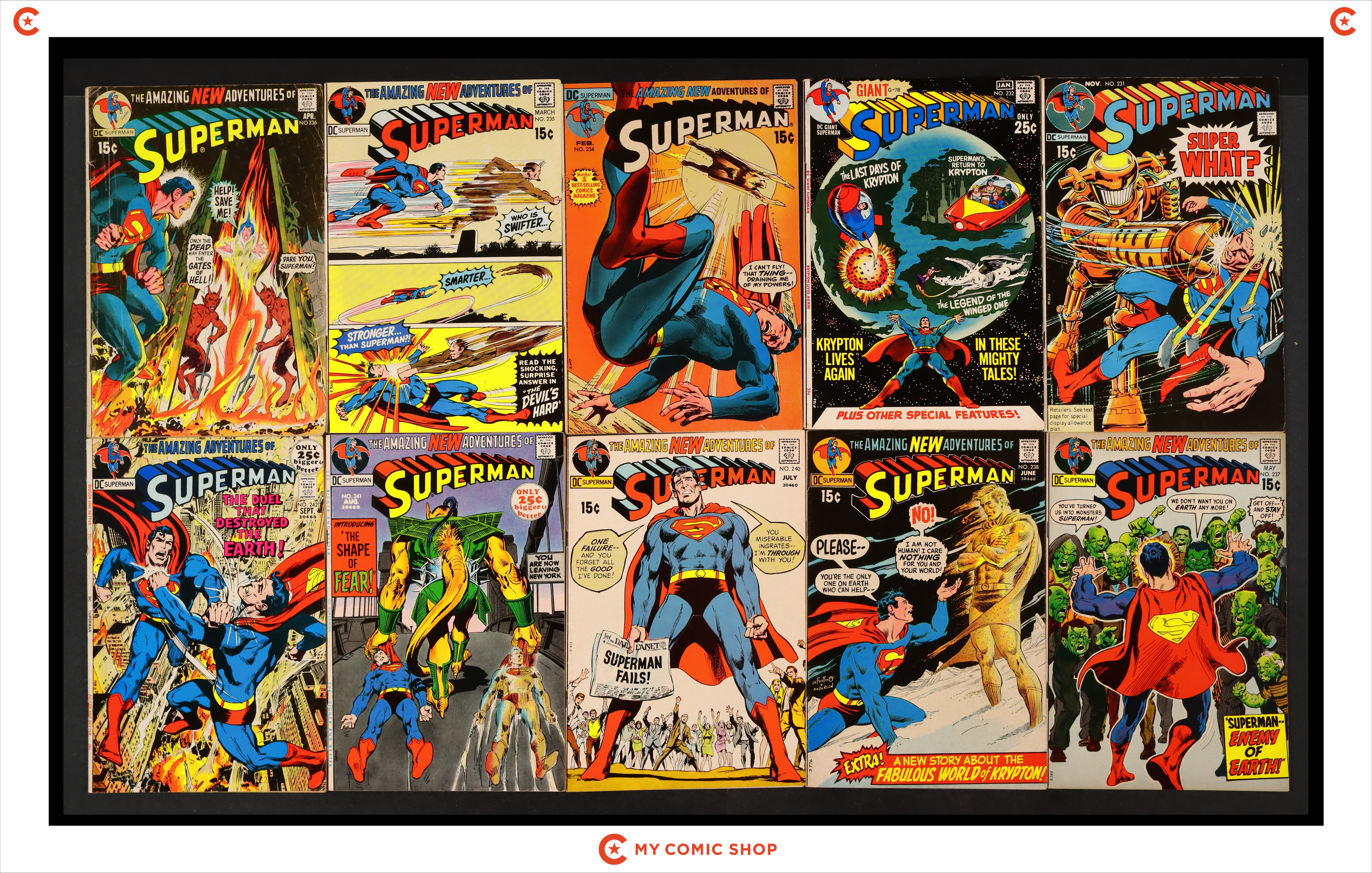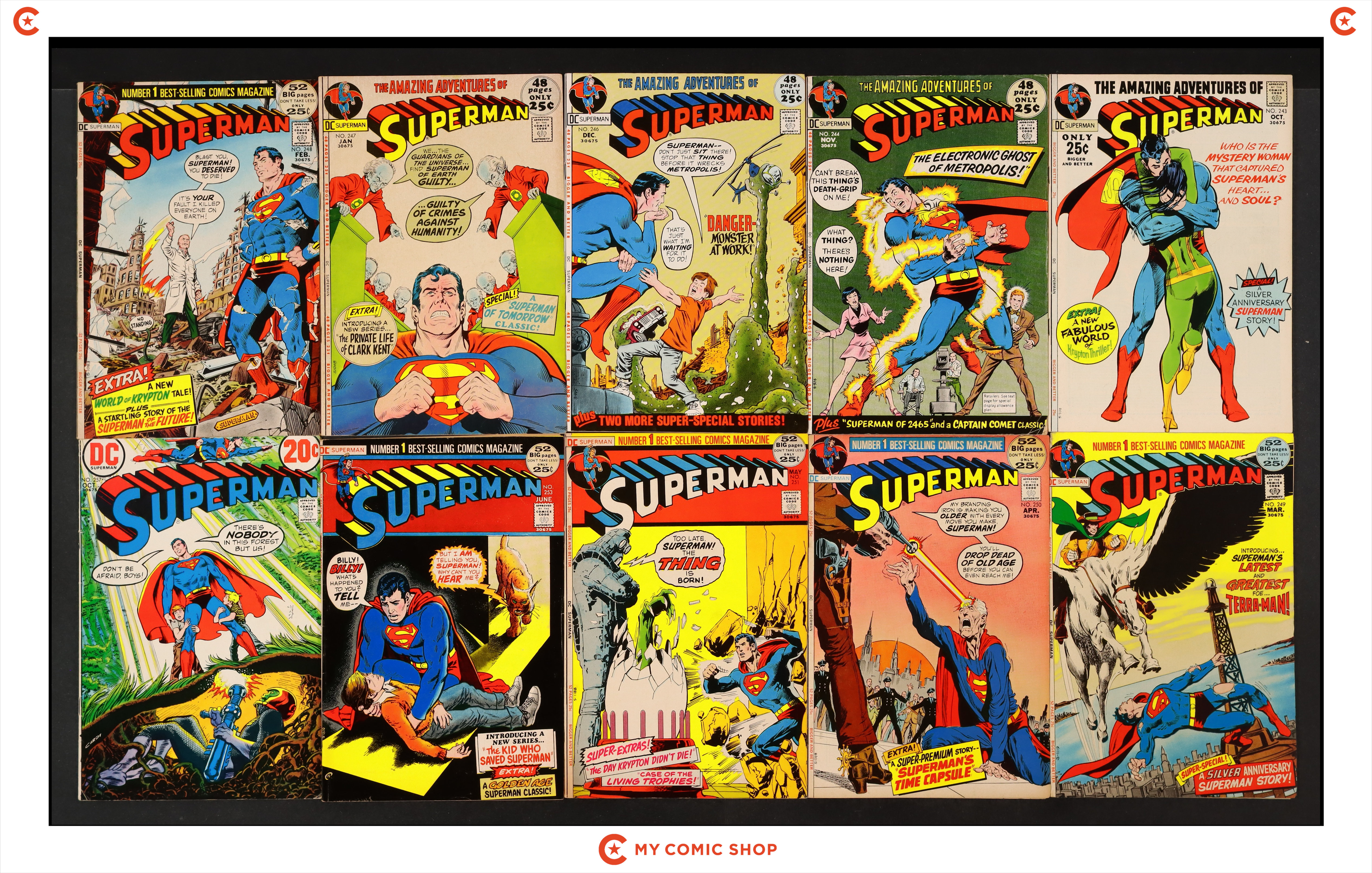 Issues 238-242, 246, 249, 250, and 251 of Superman (1939 1st Series). Most will grade in the VG to FN range with #239 grading VF.